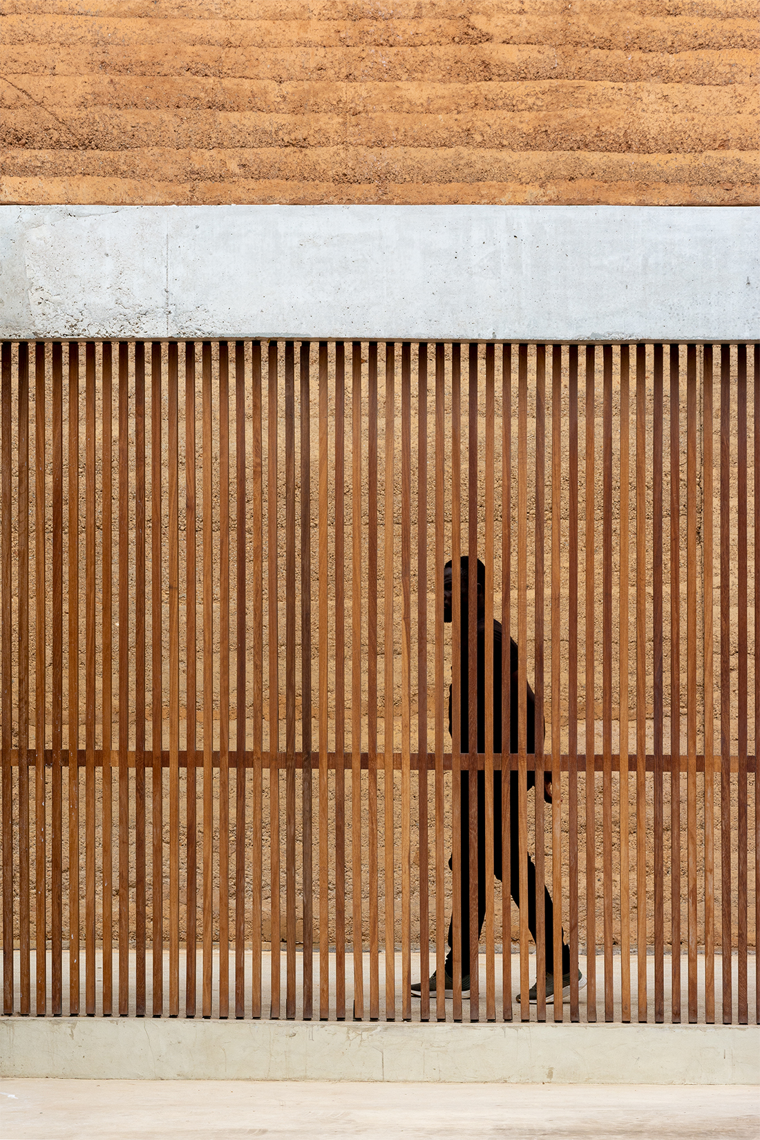 Nestled within a midblock plot, a perforated wooden structure offers a tranquil entry from the busy street. Designed as three stacked volumes, each floor expands in scale and height to accommodate internal programming, from the external garden, café, office, and library, to the studio and gallery space. A double envelope rammed earth façade extends from the ground floor to the highest level, leveraging the natural insulating properties of local earth to foster a healthy environment, ecological sensitivity, and a low carbon footprint.