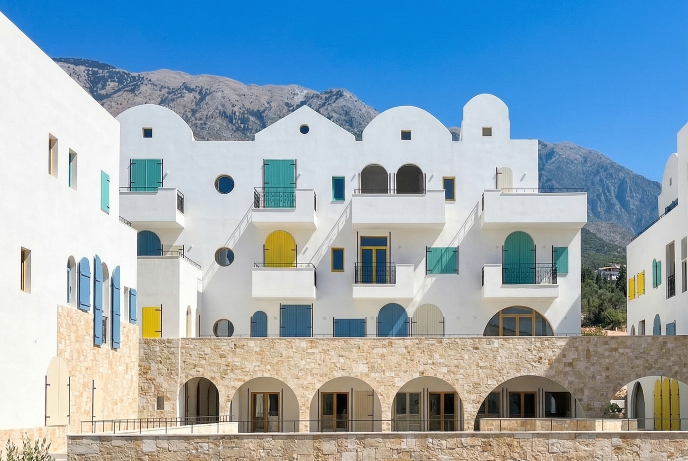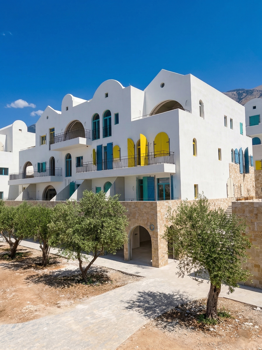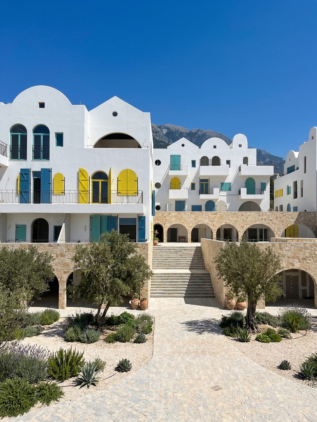 Located in Drymades beach, the holiday resort Drymades Village is composed of a series of stepped courtyards framed by architecture blending the project into a cohesive village feeling. Following the topography with a 15-meter height difference, the architecture articulates the ground levels to the stepped courtyards, bringing an introverted feeling, while on the three upper floors, the units incorporate extended terraces and balconies, expanding the public life to all the levels.