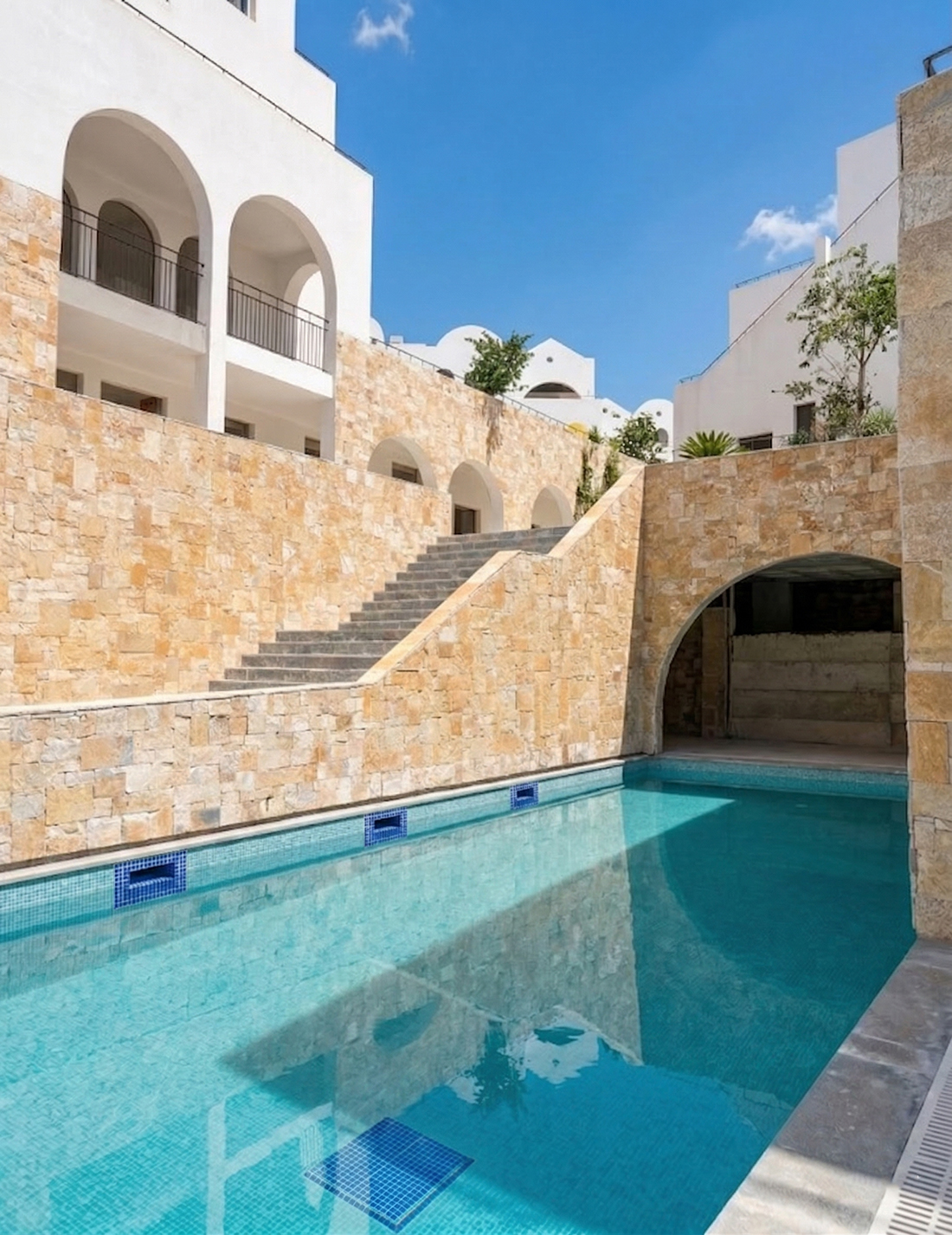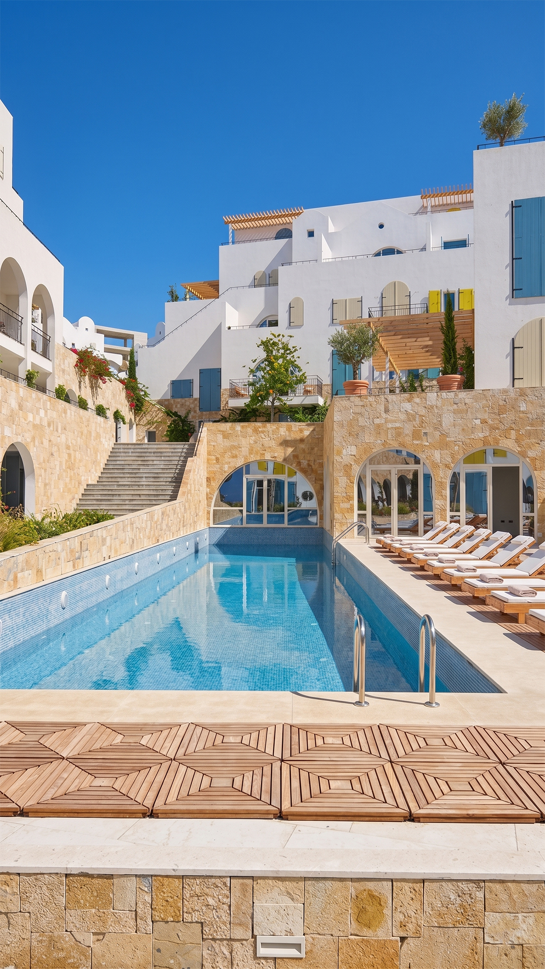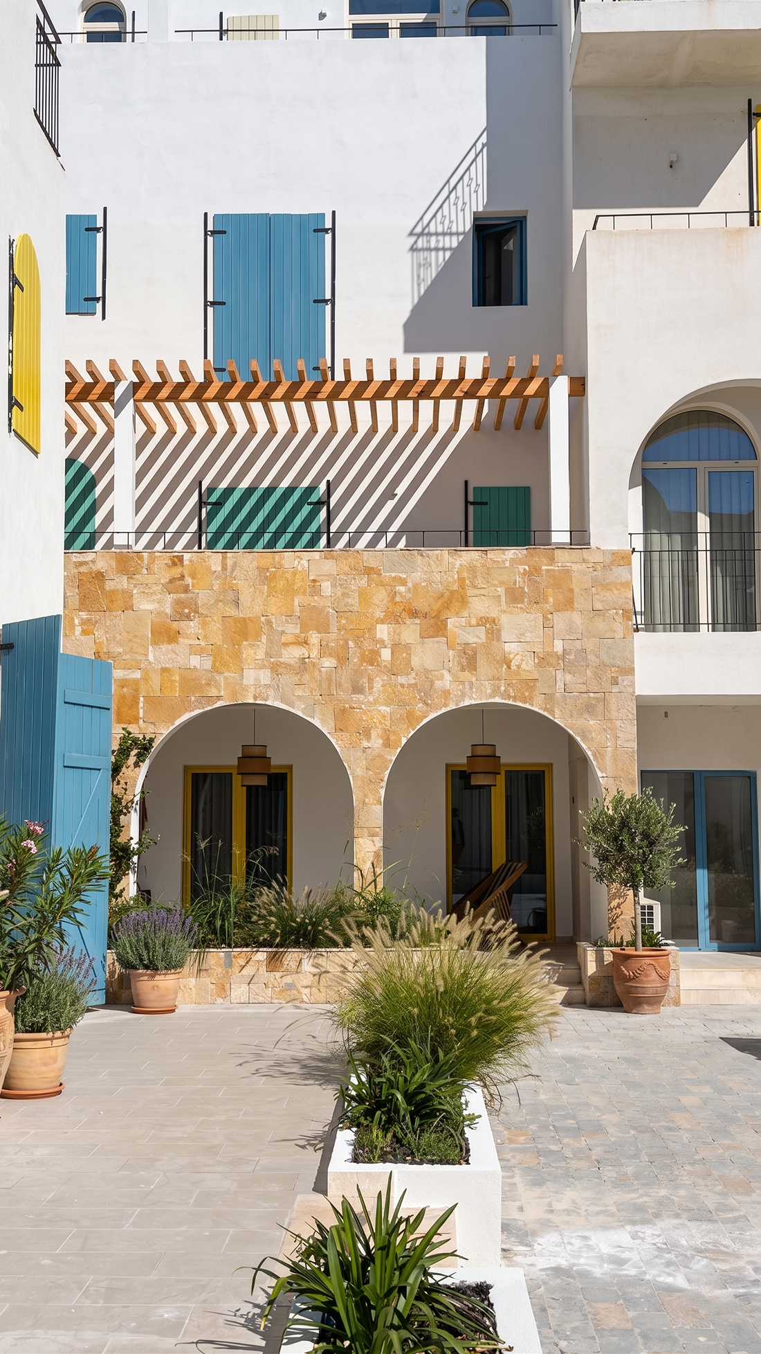 Located in Drymades beach, the holiday resort Drymades Village is composed of a series of stepped courtyards framed by architecture blending the project into a cohesive village feeling. Following the topography with a 15-meter height difference, the architecture articulates the ground levels to the stepped courtyards, bringing an introverted feeling, while on the three upper floors, the units incorporate extended terraces and balconies, expanding the public life to all the levels.