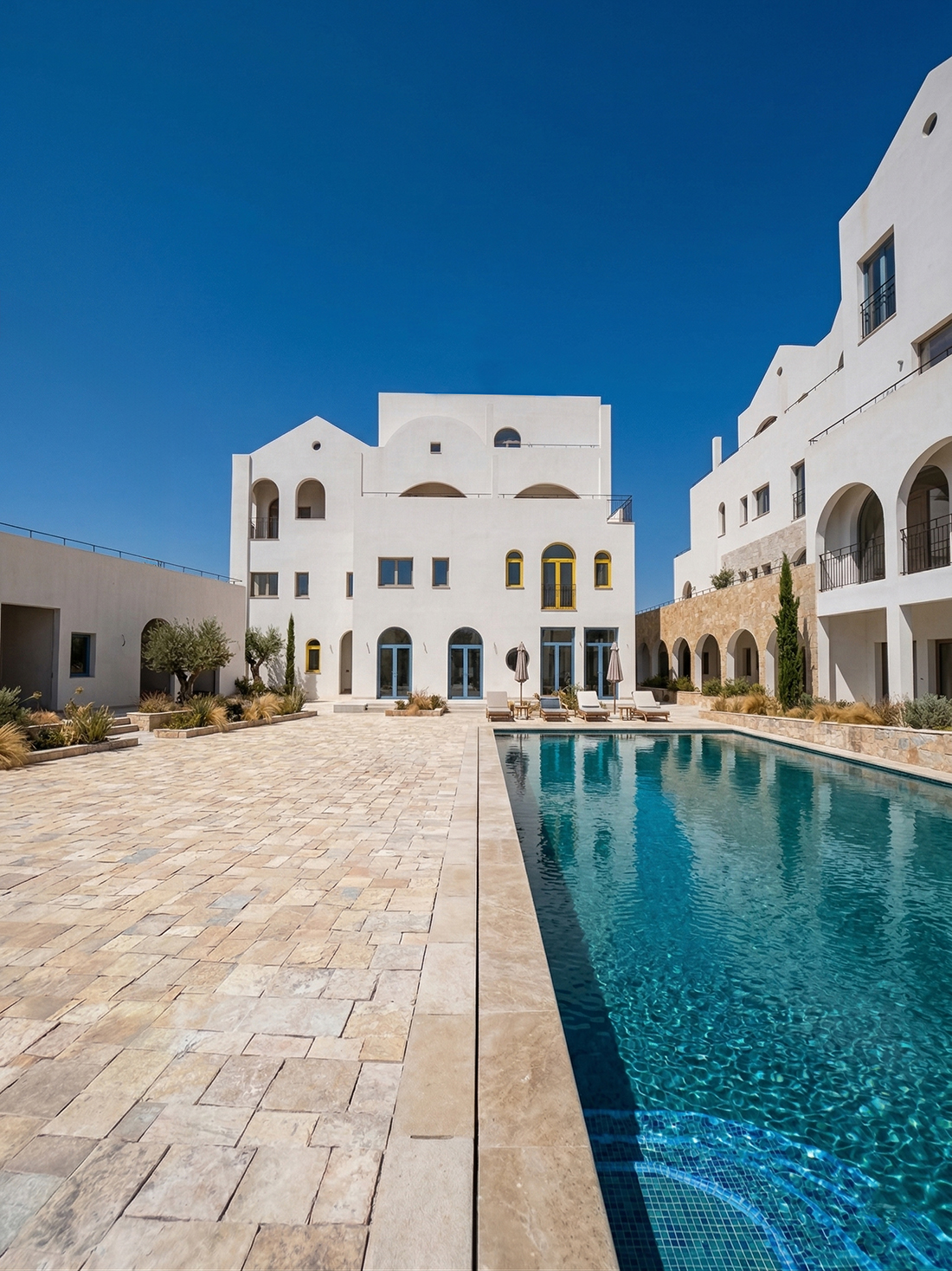 In total, six plazas are interlaced to each other, forming a large interior courtyard that articulates the private with the public space through openings in the architecture. Located at different heights and alternating one to the other, they open up the views of the seafront and offer a range of activities to the visitors. The main approach for the landscape is to keep as much as possible existing vegetation. The landscape changes its composition from a dense forest in the lowest part of the plot to an urban plaza in the highest part. Native species (Cypress and Olive trees), and plants with low maintenance (Bougainvillea, Cacti), constitute the selected vegetation.
