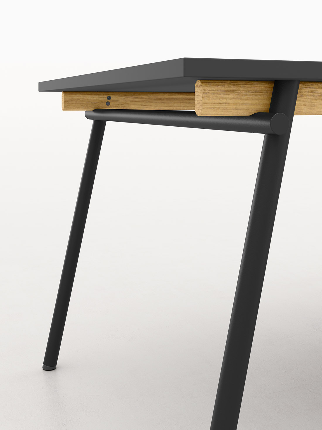 The DV821-Knot collection is a distinctive line of office furniture that stands out due to its unique design language, particularly the identifiable joint that connects the vertical and horizontal structures of each piece. This connection detail is central to the collection’s visual identity, offering a blend of functionality and aesthetic appeal. The trestle structure, featuring a round section, redefines traditional office furniture aesthetics, providing a modern and sleek look.