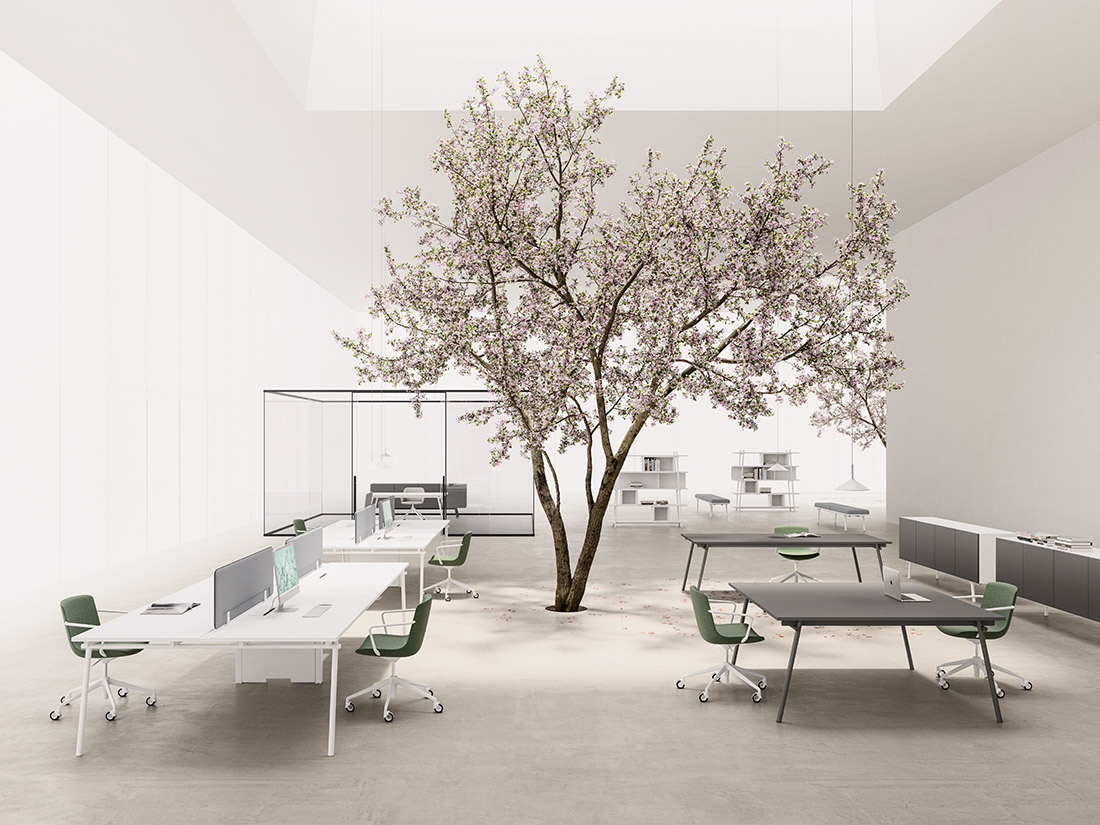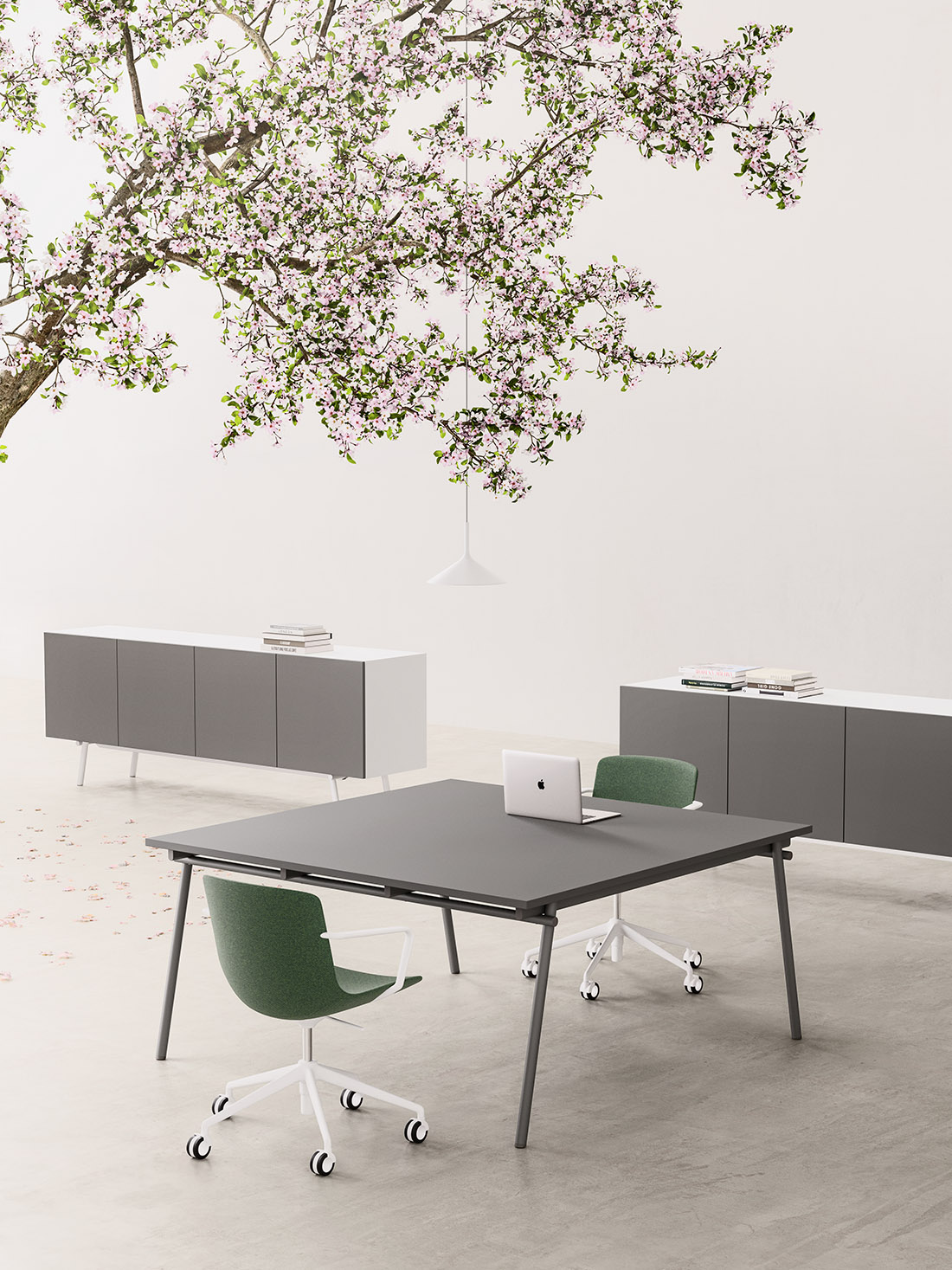 Developed with eco-design principles, the DV821-Knot system emphasizes environmental sustainability and circular production processes. This commitment to sustainability is matched by its adaptability, with workspace solutions ranging from desks and benches to meeting tables, high tables, bookcases, dividing panels, and storage units. The DV821-Knot desk system is designed to be modular and informal, offering a flexible approach to organizing and experiencing office space in a way that meets contemporary needs.