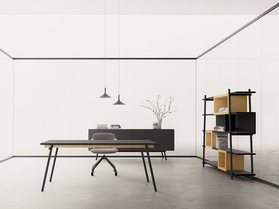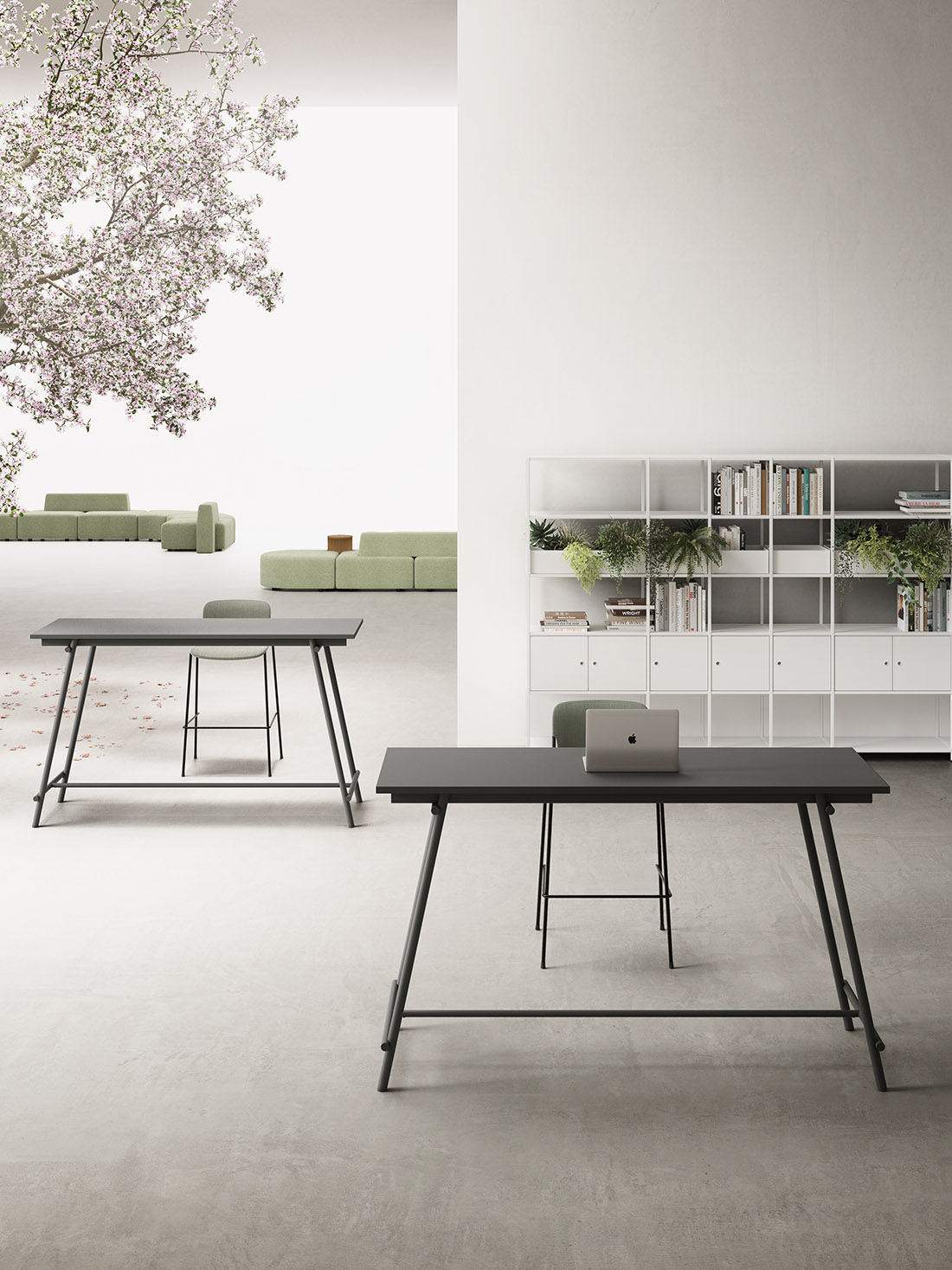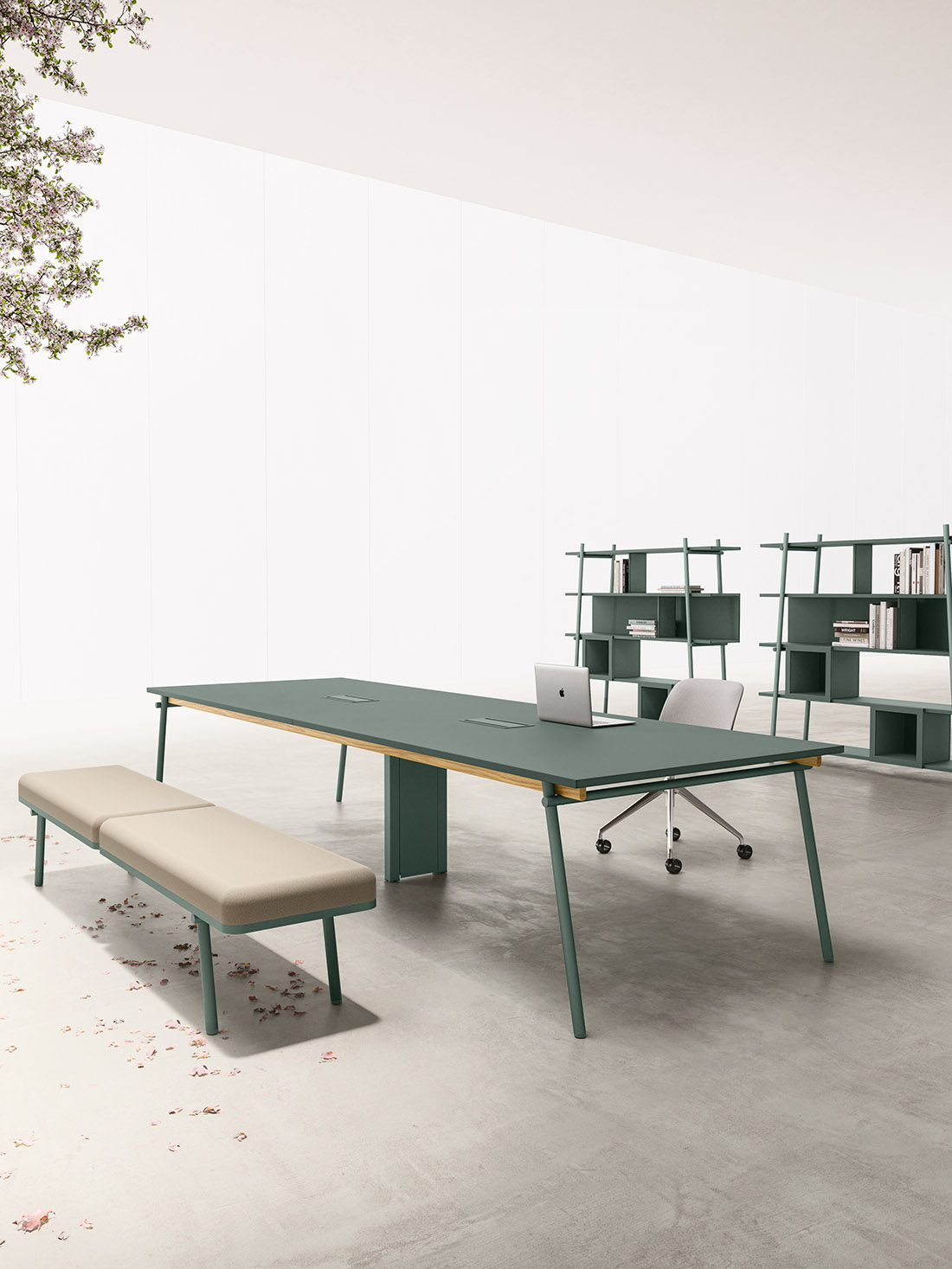 The collection is versatile, with materials like metal or wood that allow users to choose between a contemporary feel or a warmer, more inviting atmosphere. The table tops come in three configurations: a single-piece top for a clean, minimalist look; a top with a central space for easy access to electrical connections; and a version with a technical guide rail, allowing for the integration and repositioning of accessories as needed. The end tops, with a depth of 80 cm, provide an additional complete workstation at each end of the table, enhancing functionality.