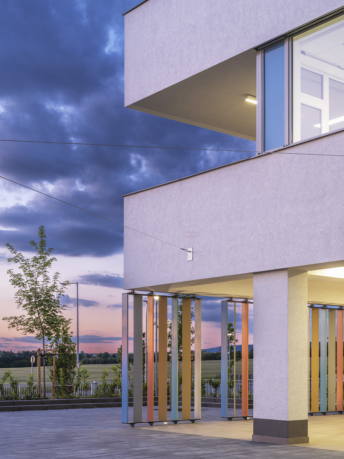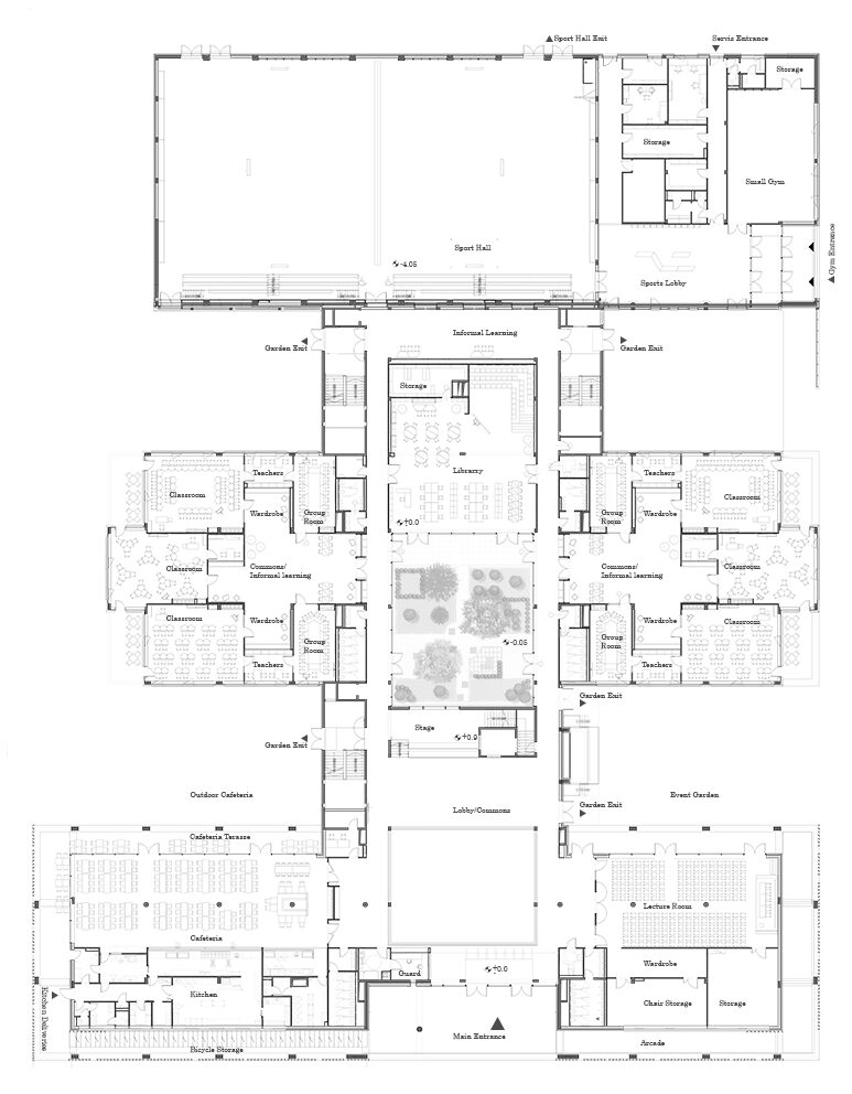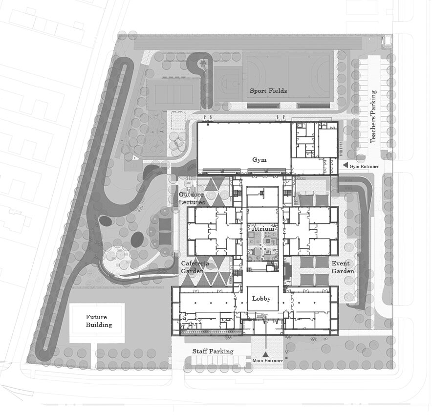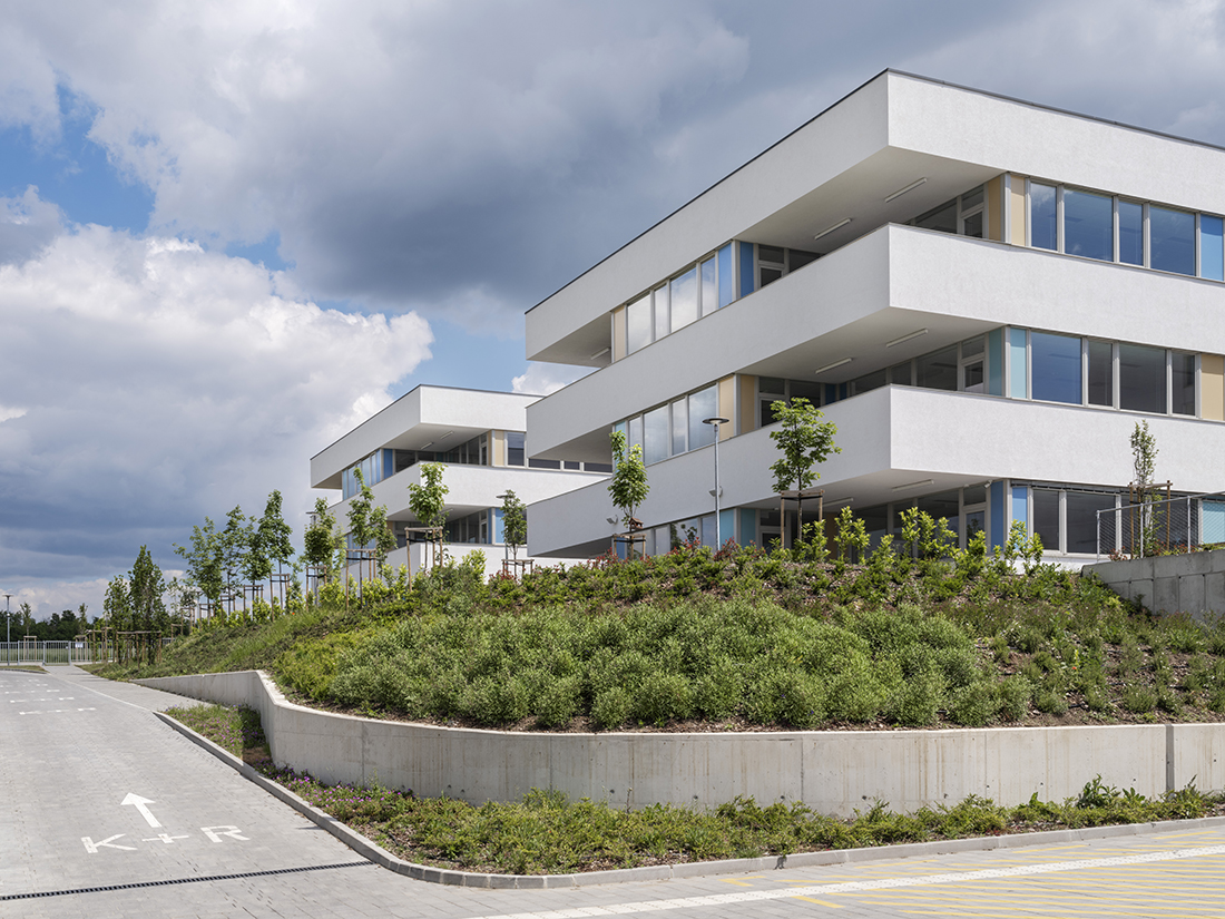 The institution accommodates 18 classrooms in addition to a dividable gymnasium, lecture hall, dining hall, warming kitchen, library, chapel, sports fields, and green spaces. Designed on a greenfield site, the building follows the natural 4-meter slope of the terrain, with a lowered gymnasium block directly connected to the outdoor sports fields and featuring its own independent residential entrance. The architectural concept aligns the building’s garden-facing classroom wings with the plot boundaries, gradually reducing the length of the wings towards the family house zone.