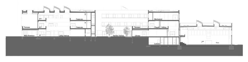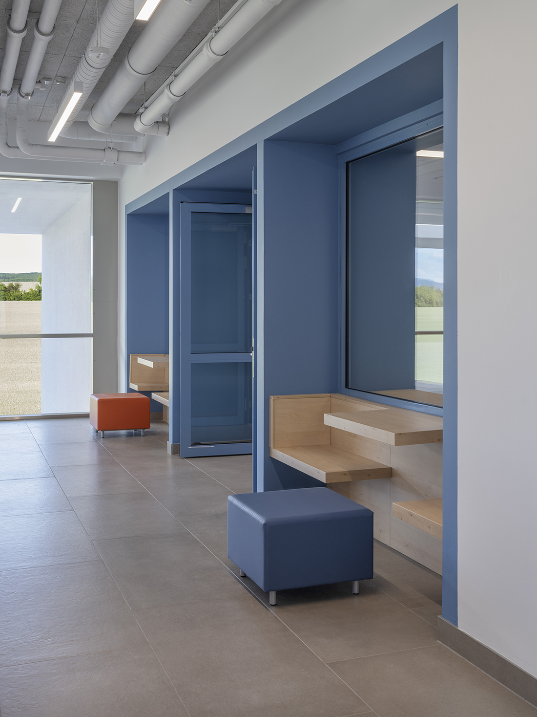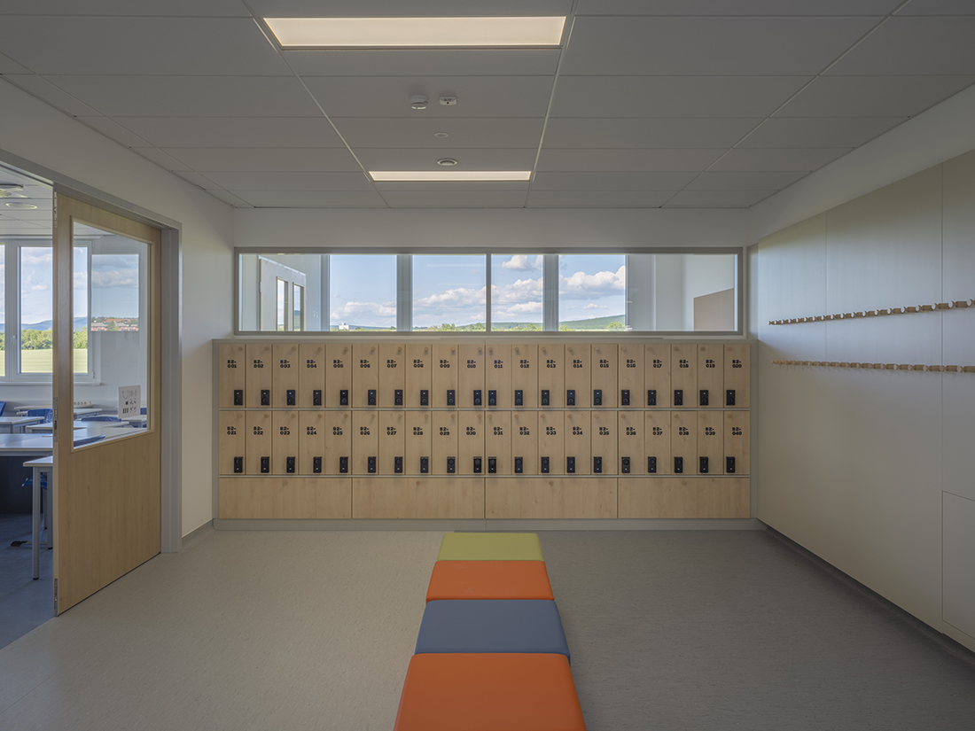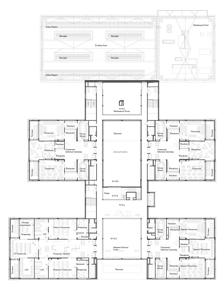 The institution accommodates 18 classrooms in addition to a dividable gymnasium, lecture hall, dining hall, warming kitchen, library, chapel, sports fields, and green spaces. Designed on a greenfield site, the building follows the natural 4-meter slope of the terrain, with a lowered gymnasium block directly connected to the outdoor sports fields and featuring its own independent residential entrance. The architectural concept aligns the building’s garden-facing classroom wings with the plot boundaries, gradually reducing the length of the wings towards the family house zone.