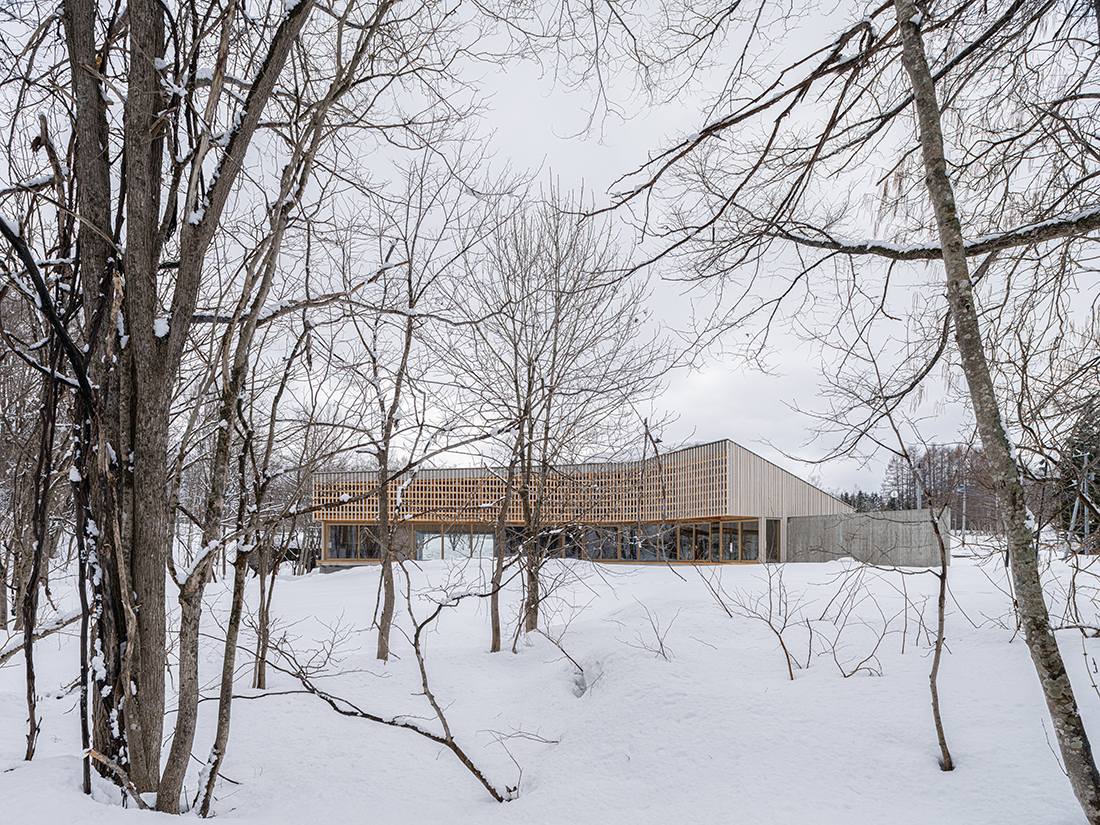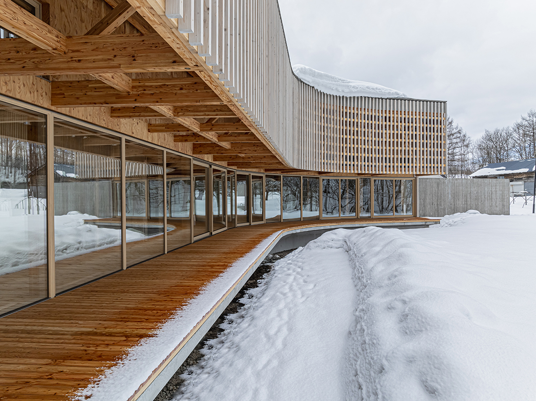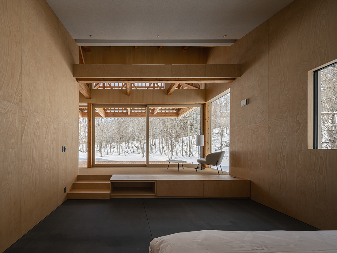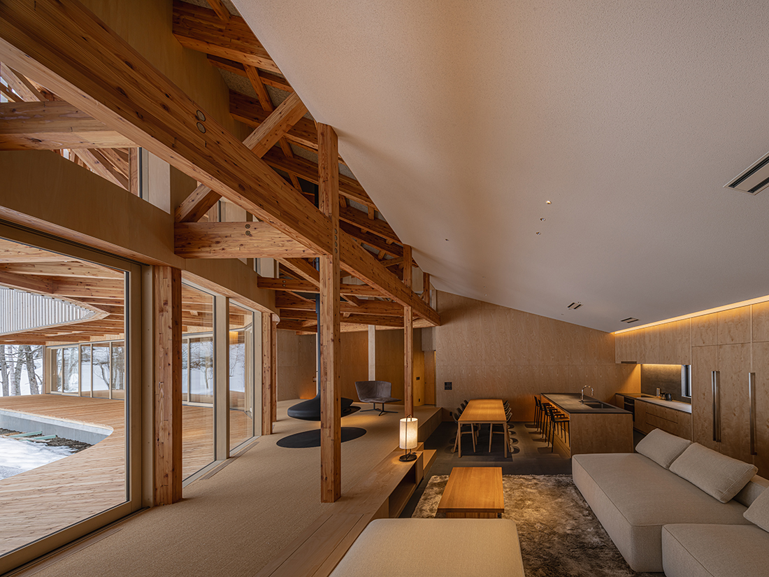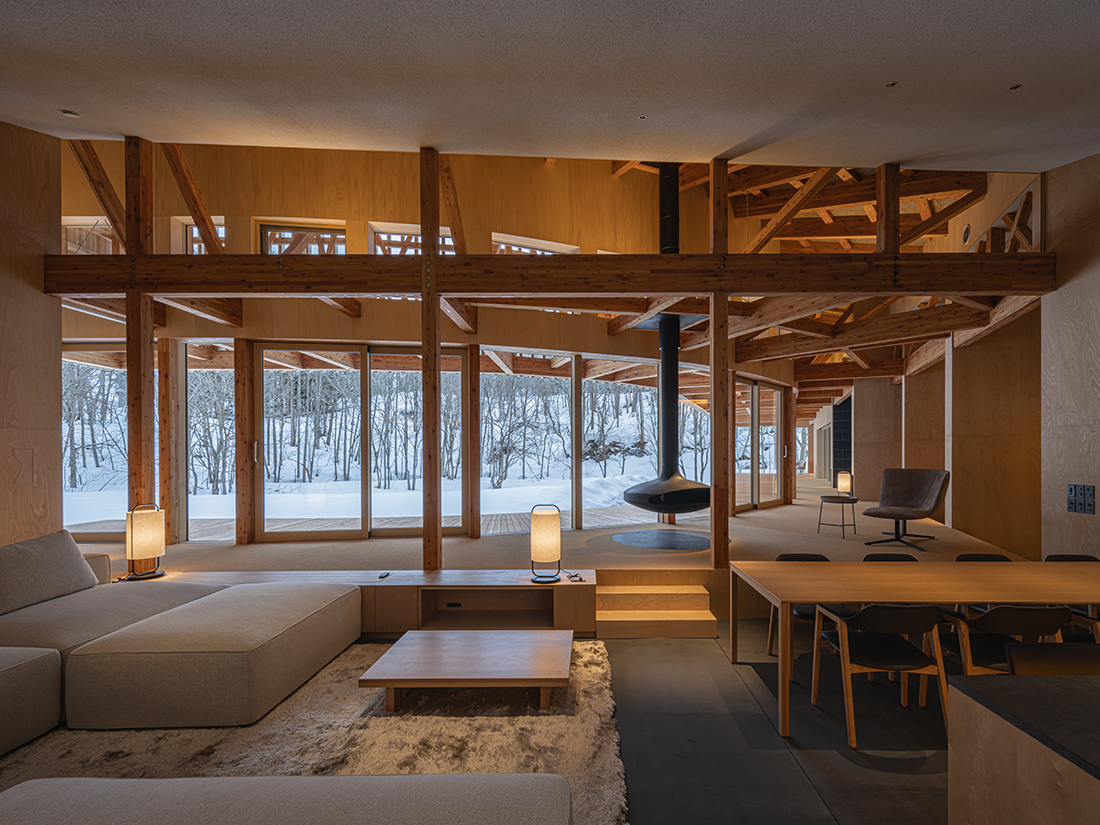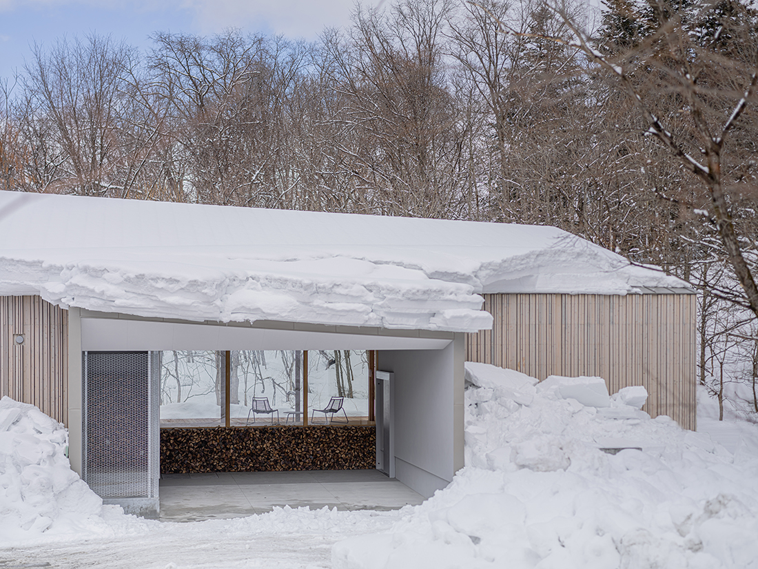 This holiday home, for a busy professional in Niseko, faces a stream leading to the Shiribetsu River, with a forest hill beyond. The one-storey building’s curved form mimics the stream’s fluid lines, with the shorter side facing the stream, traced by an engawa. This veranda, with full-height, operable sliding windows, connects internal and external spaces.