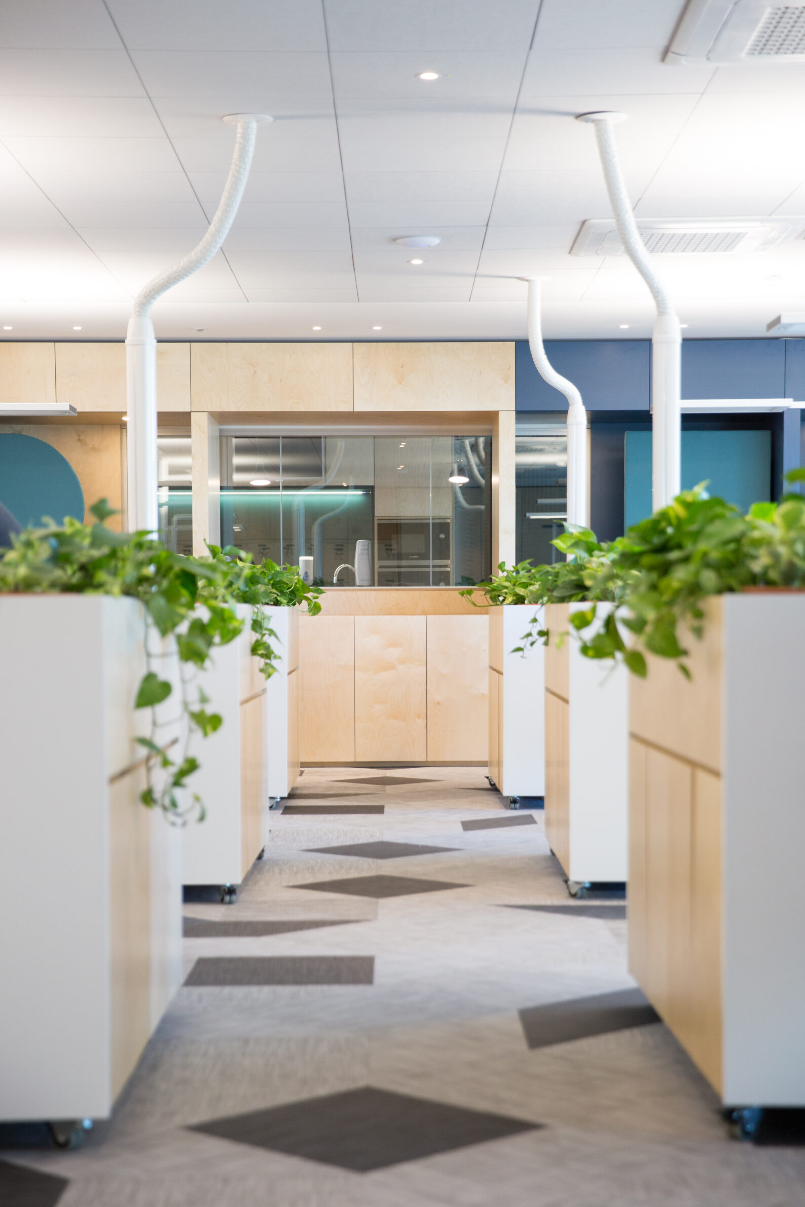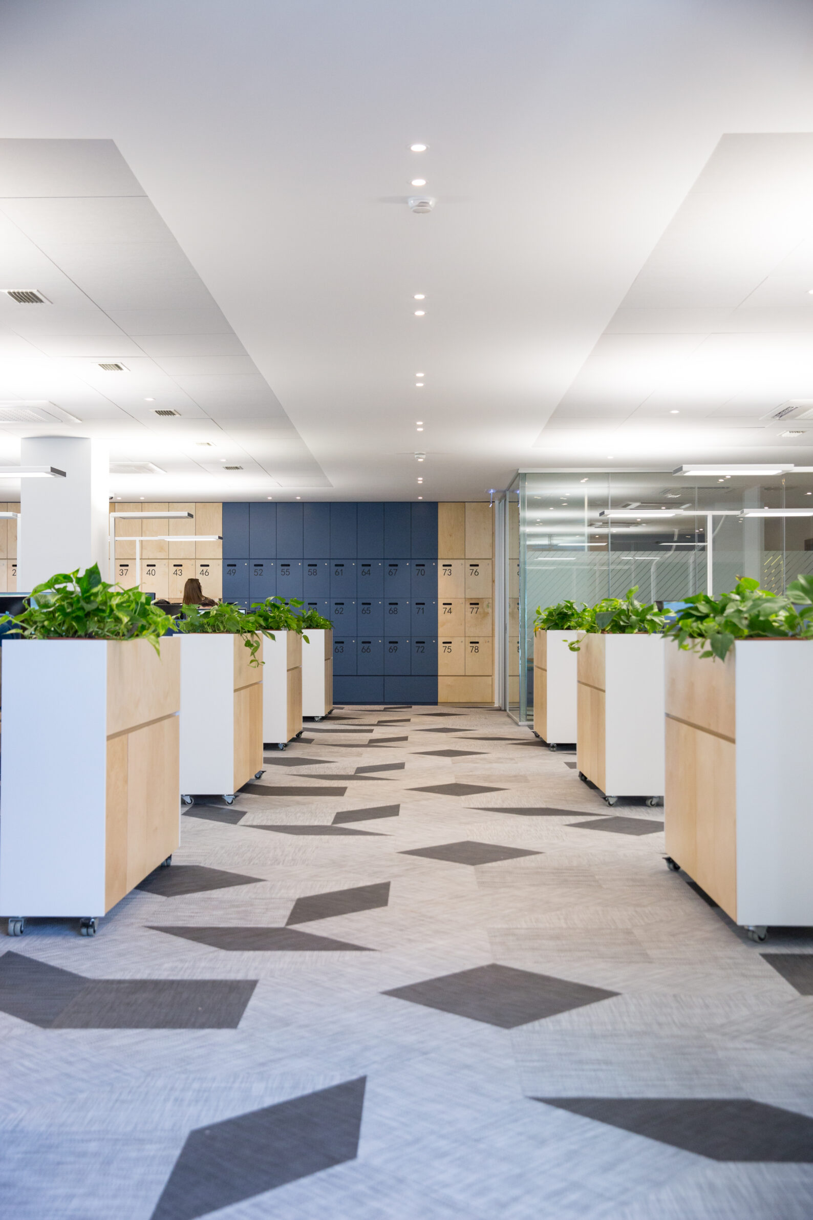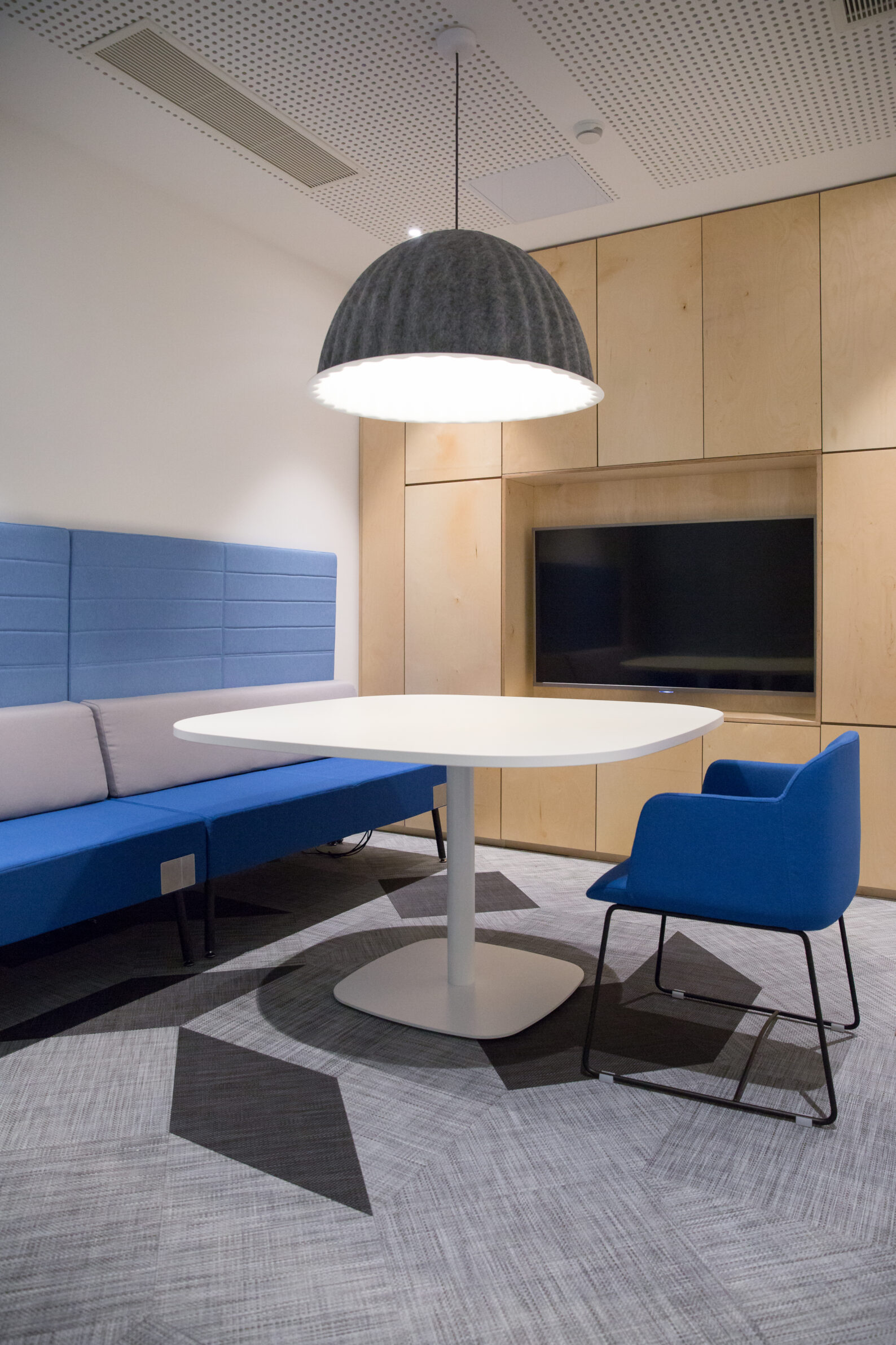 Positioned as a 24-hour operational hub, the Melar Operations office reimagines the workplace as a fluid, responsive environment. The design centers on an expansive open-plan workspace, where the entrance, two conference rooms, and kitchen are thoughtfully arranged along one edge, allowing these areas to function both as essential facilities and as adaptable breakout or collaboration zones. Acoustics and lighting were treated as fundamental design elements, shaping the atmosphere and functionality of the space. Working closely with a sound engineer, we incorporated acoustically treated soffits and partitions, desk dividers, and carpeted flooring to absorb noise and maintain a calm, focused environment despite constant activity. Lighting transitions are automated, orchestrating a seamless shift between day and night that supports a continuous workflow. Flexibility defines the office’s spatial strategy. Rather than relying on fixed services or immovable furniture, the space employs freestanding, plug-and-play electrical poles with a one-meter displacement range, providing power to clusters of desks that can be effortlessly reconfigured. This modularity allows the office to evolve with changing operational needs, accommodating different work modes with ease. Materiality and color palette further reinforce the office’s identity. Muted greys, soft greens, and deep blues are complemented by the warmth of birch plywood, creating a contemporary and inviting environment. Every detail, from finishes to furnishings, contributes to a workspace that is at once functional, serene, and visually engaging—a place where continuous operations coexist with a sense of calm and order.