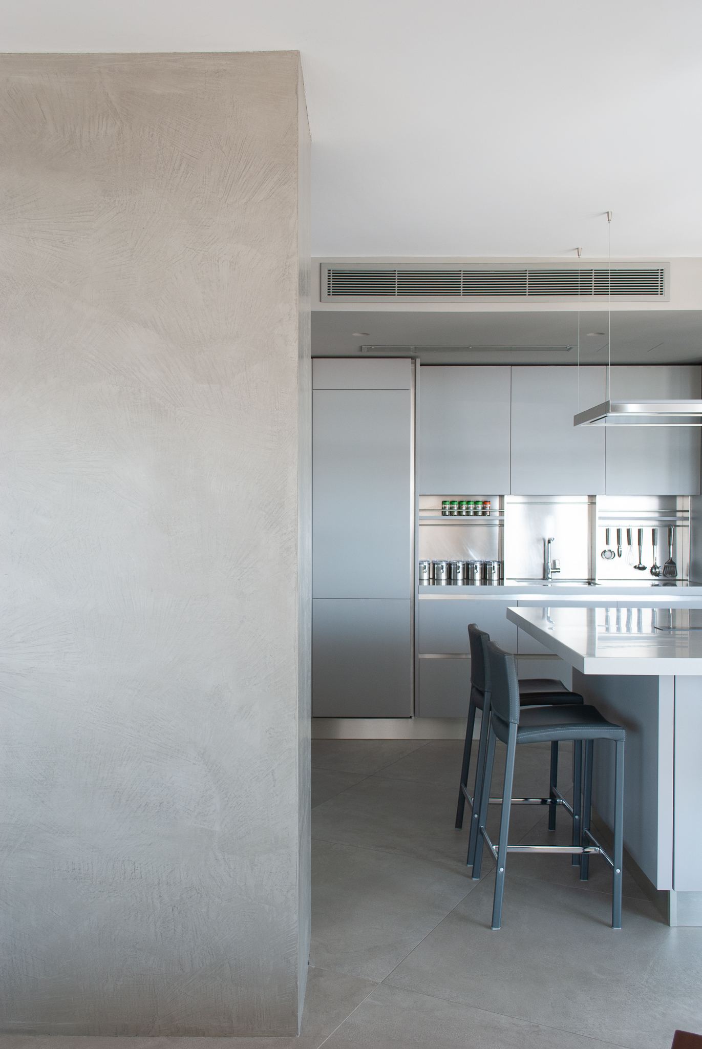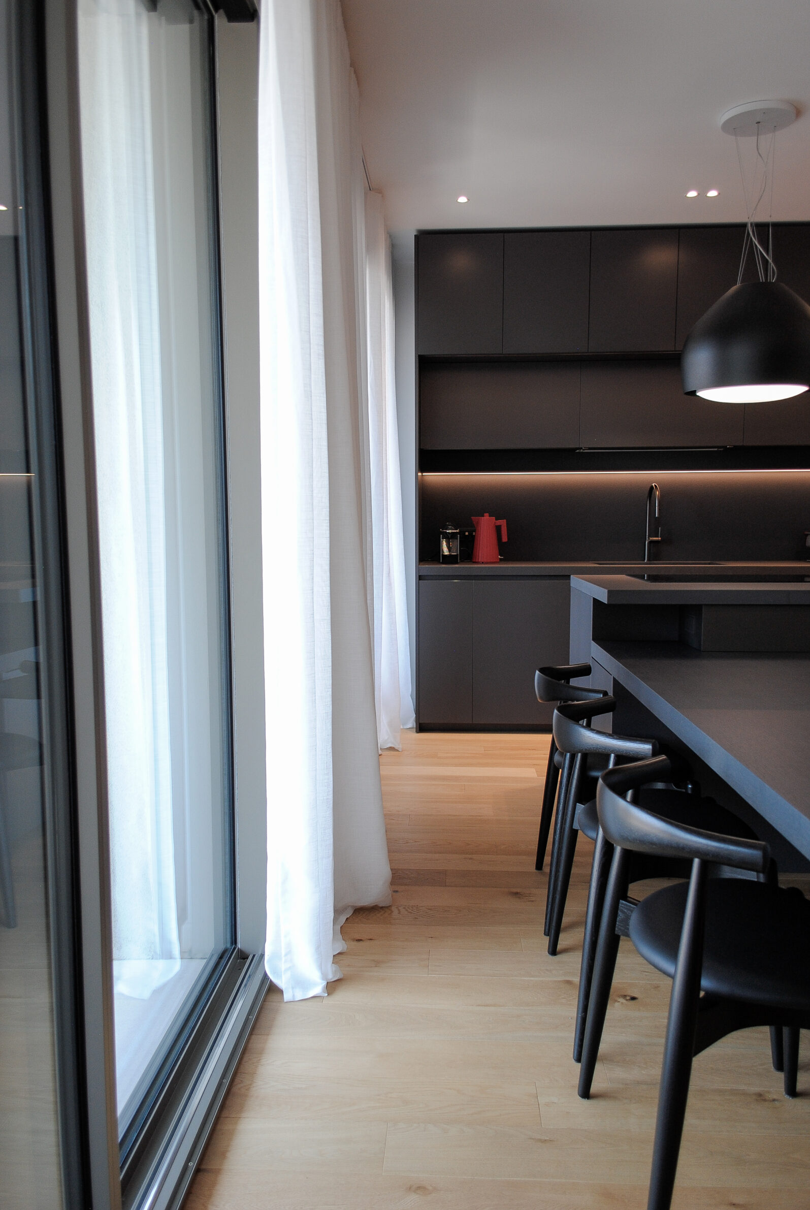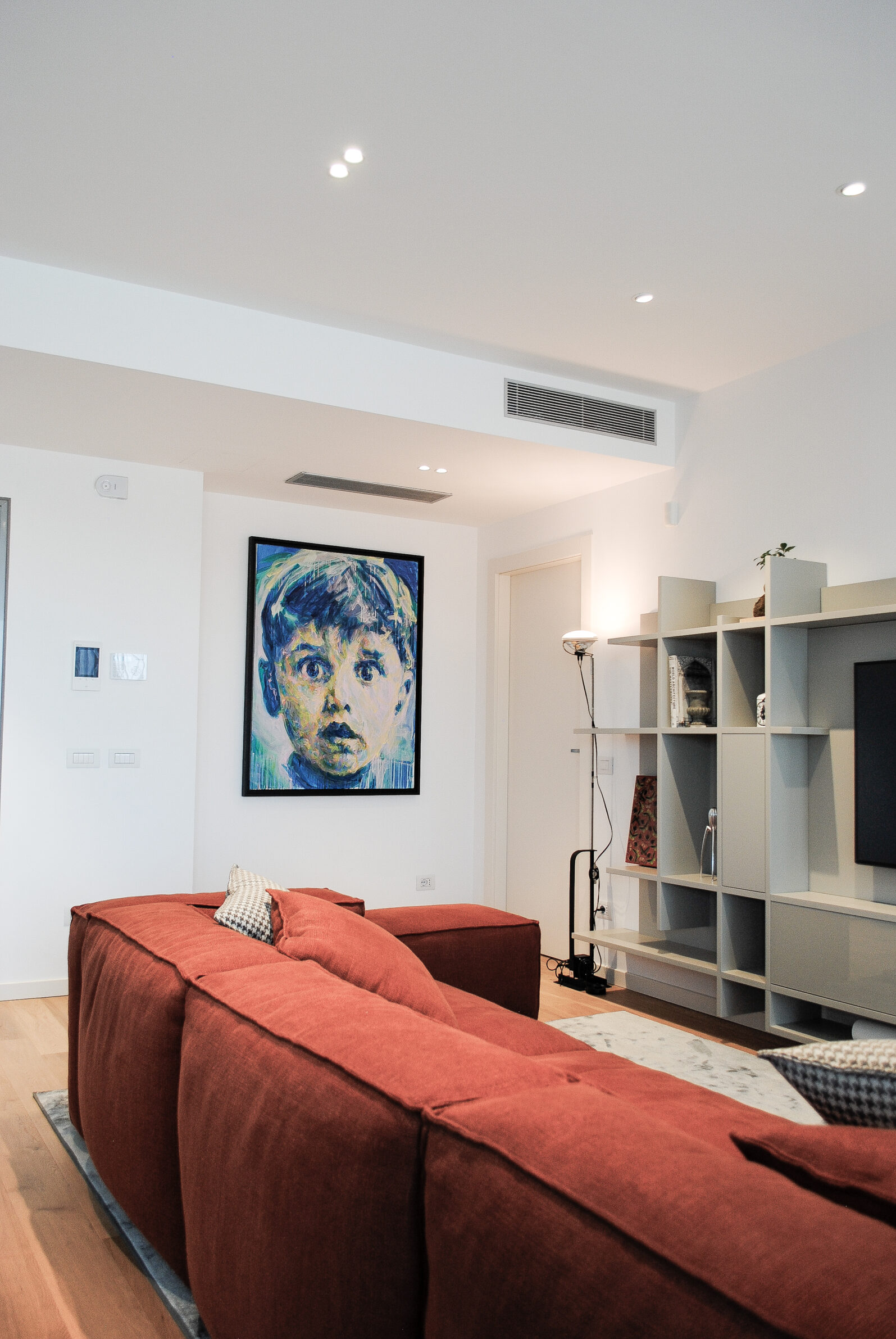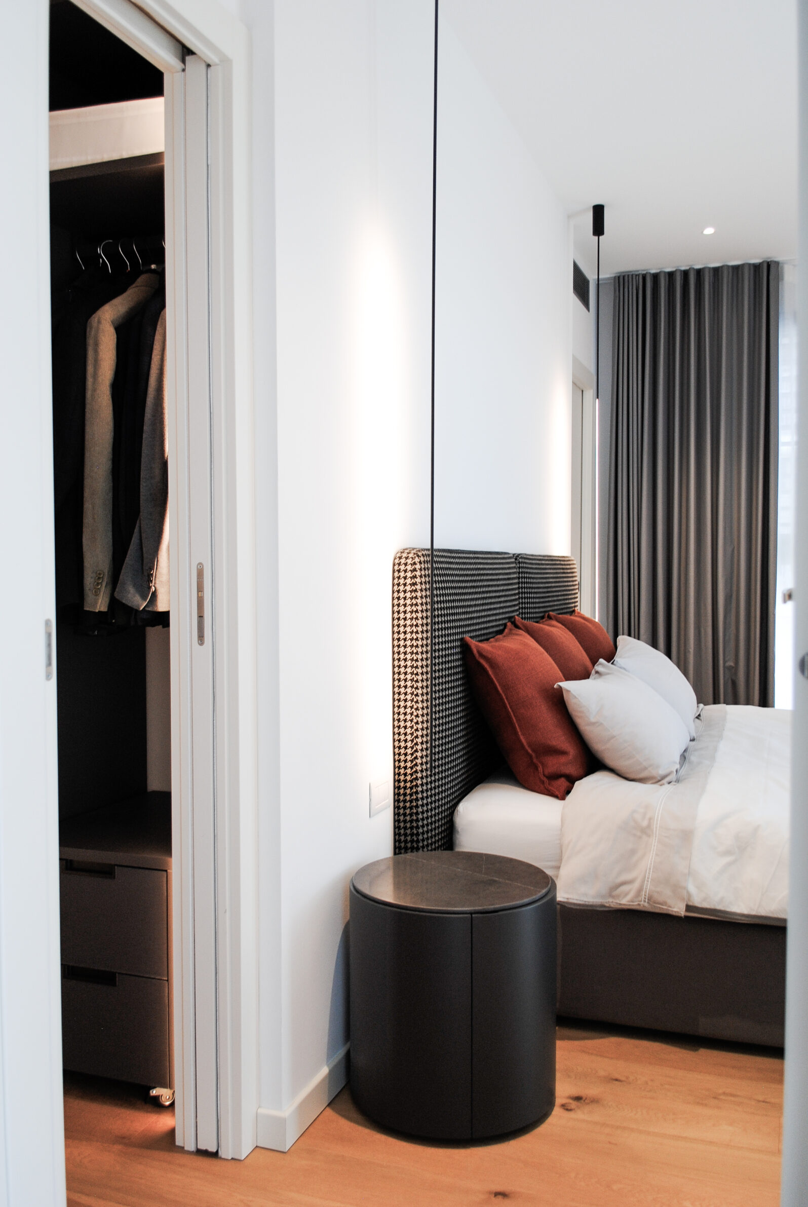 Perched above the Milan skyline, this duplex penthouse unfolds as a quiet dialogue between light, material, and emotion. The design embraces the duality of city life — vibrant and serene, structured and soft — weaving architecture and interior design into a seamless narrative of contemporary elegance. Sunlight drifts through generous glazing, softening the geometry of the space and tracing delicate shifts across the surfaces. The palette – a study in balance – pairs warm terracotta hues with muted greys and the natural grain of oak, creating an atmosphere both grounded and ethereal. Each space reveals its own rhythm: a living room defined by texture and intimacy, a kitchen conceived as a sculptural composition in black, and a bedroom where tactile fabrics and subdued tones invite stillness. Art, furniture, and architecture converge in harmony, every element thoughtfully placed to evoke both presence and pause. This penthouse is not simply lived in — it is experienced. A quiet retreat above the city, where design becomes a language of light, proportion, and quiet luxury.