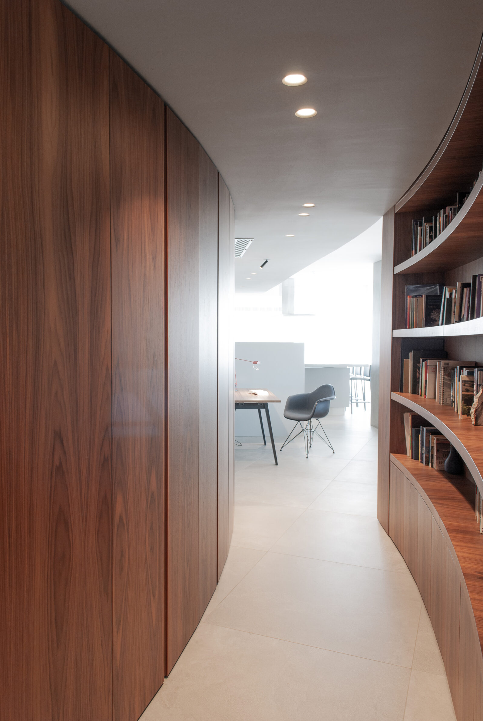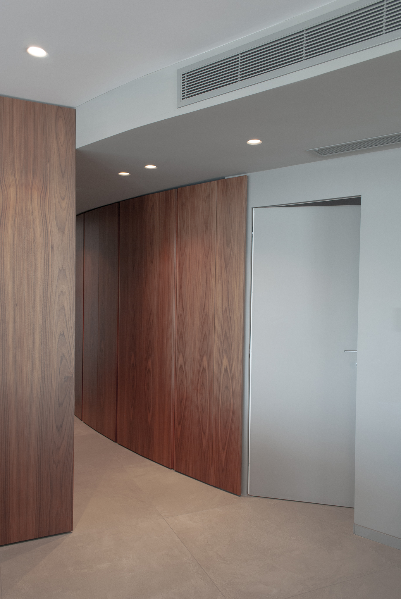 Suspended above the city, this high-rise apartment is conceived as a quiet observatory — a place where architecture meets the horizon. Framed by 180 degrees of uninterrupted views, the residence fully embraces its elevated setting, most dramatically to the east where dawn unfolds across Valletta and Manoel Island. A continuous ribbon of full-height aluminium sliding doors dissolves the boundary between interior and exterior, allowing light, air, and panoramas to permeate everyday life. These openings extend onto a deep, sheltered terrace — an outdoor room hovering above the urban fabric. The plan is organised around the choreography of views. Living, dining, and kitchen areas unfold as a single open landscape, anchored by monolithic sculptural elements that quietly define space. Bedrooms retreat to either end of the apartment, creating moments of privacy behind the veil of the landscape. Arrival to the living room occurs through a tunnel-like corridor wrapped in curved walnut timber. The passage compresses before releasing into light, intensifying the drama of the panorama beyond it.