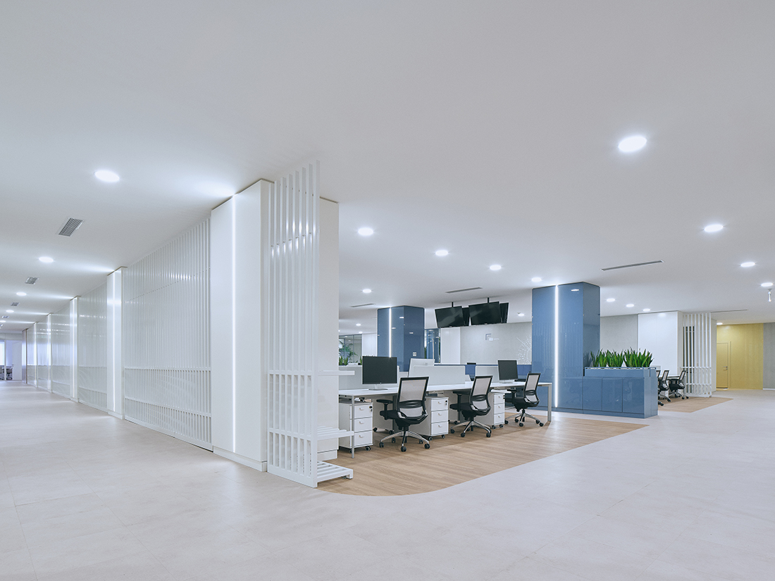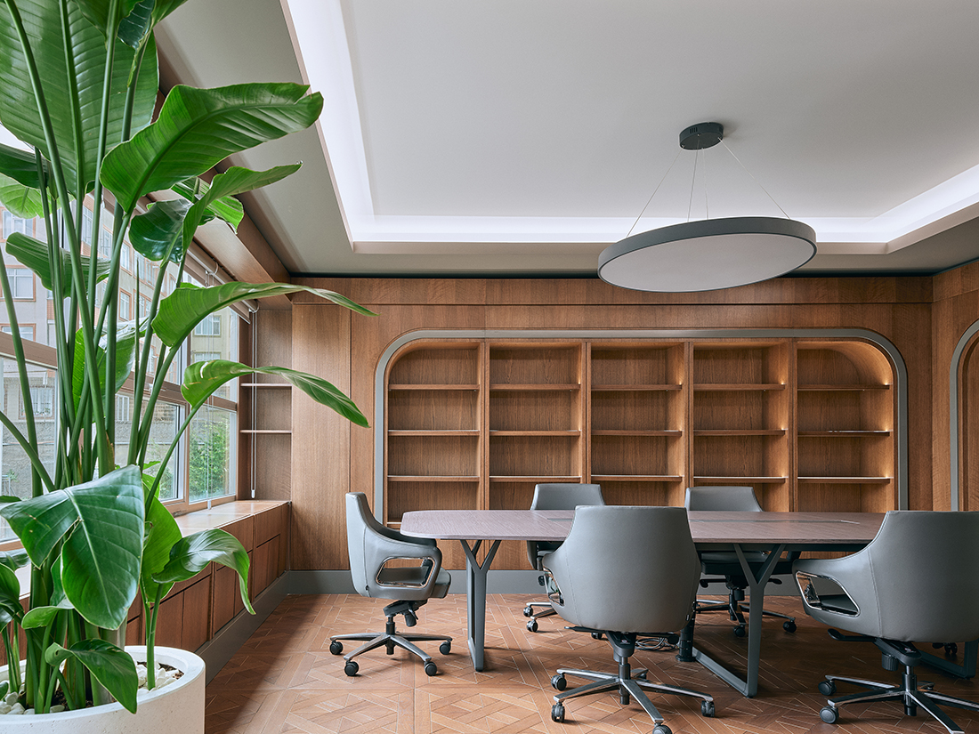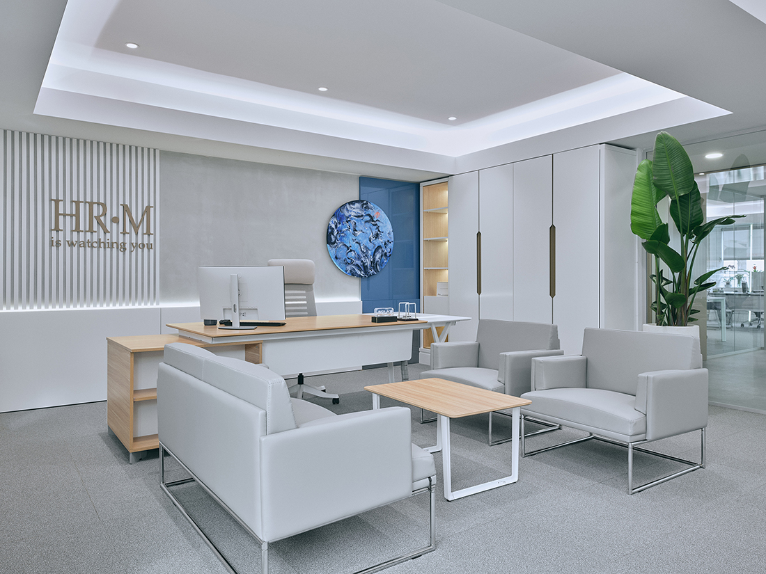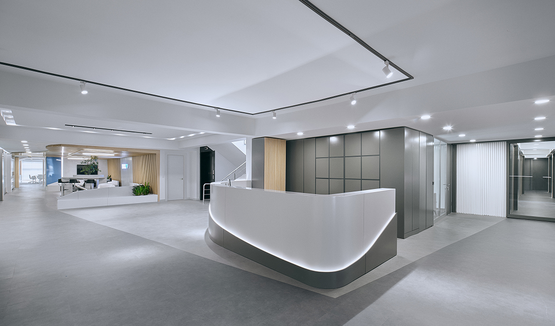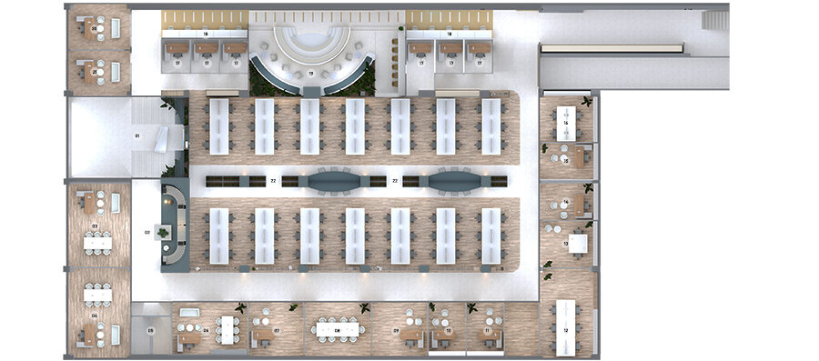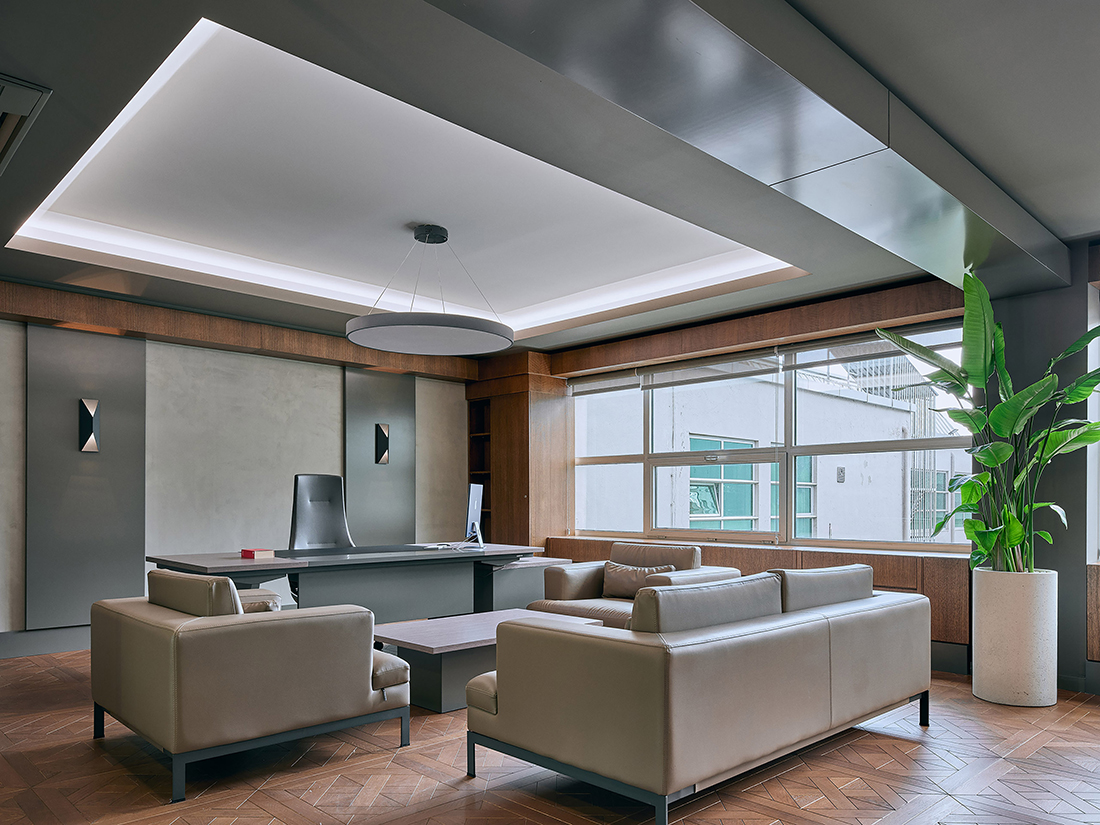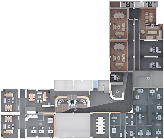 The executive floor includes a reception area, communal spaces, and executive offices, all designed with subdued colors to create a professional and refined ambiance. A combination of varied flooring materials and warm wood tones enhances the sophistication of the entire space.