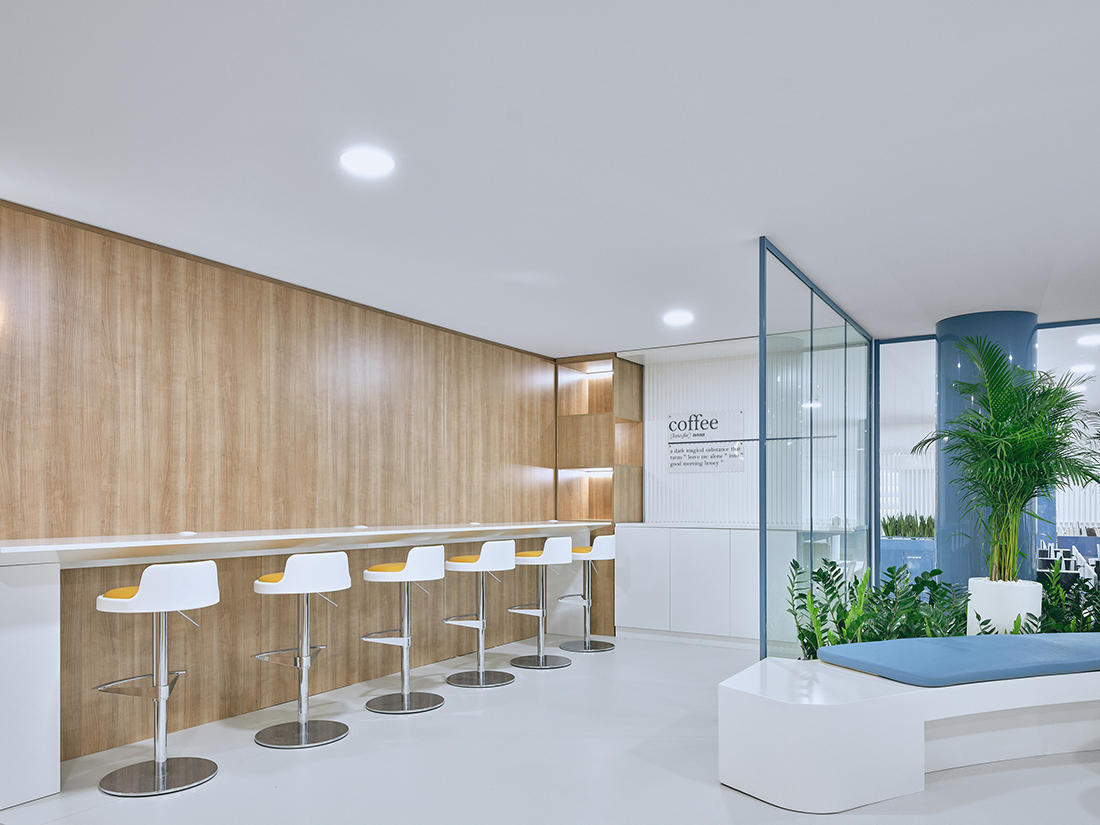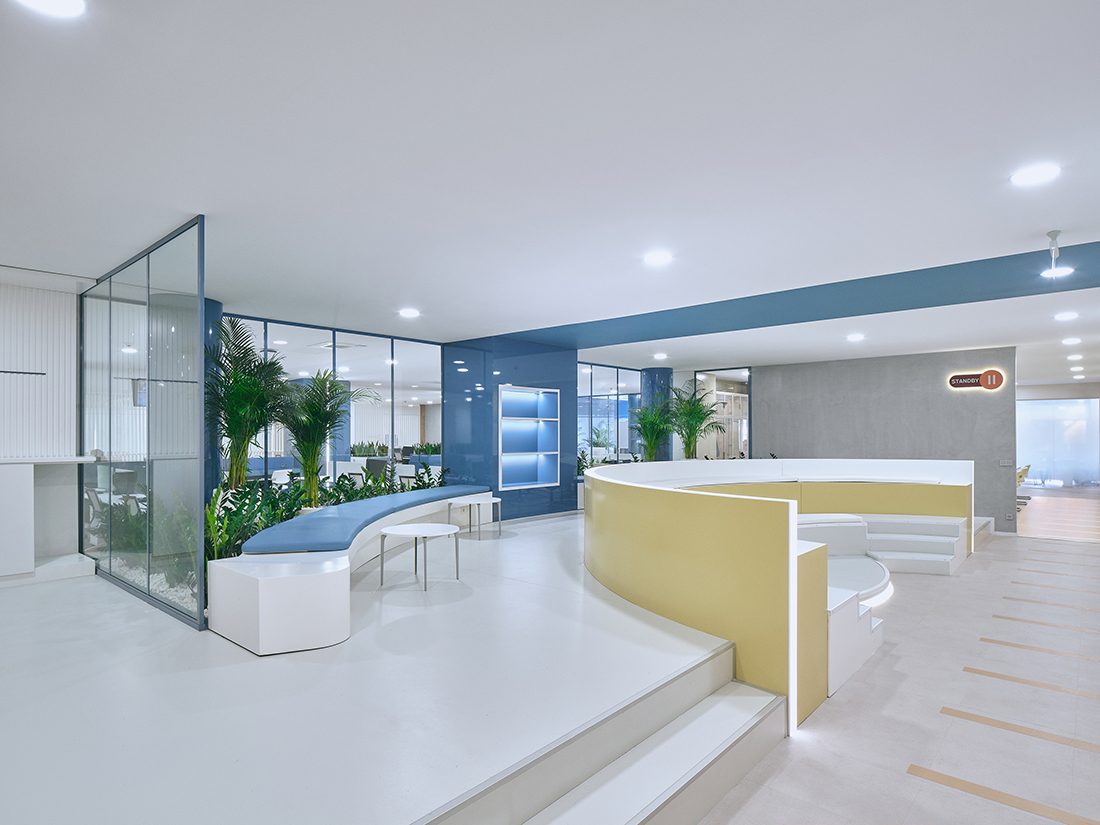 The open office floor, designed for the new TV channel team, fosters social interaction and collaboration. It features vibrant pastel colors, neutral concrete finishes, warm wood accents, transparent walls, semi-permeable furniture, and strategically placed graphics, creating an energetic and open atmosphere.
