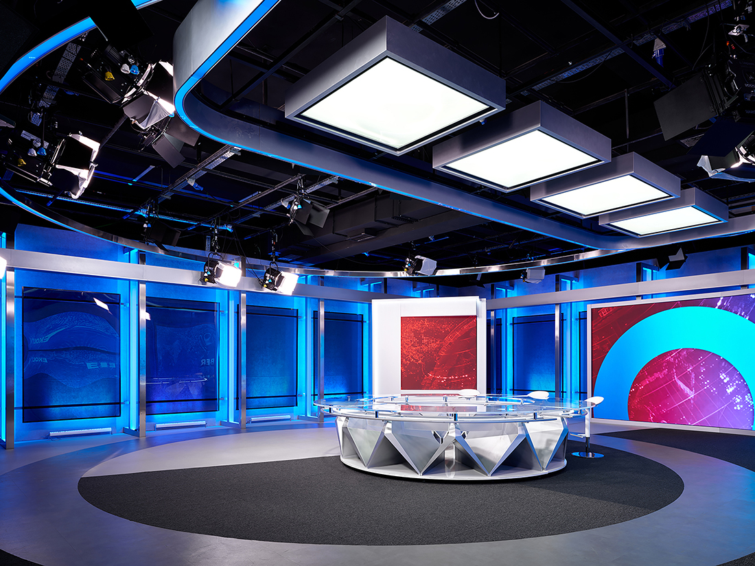 The studio floor houses two studios, one for programs and one for news, alongside technical areas like control rooms, meeting the demands of a cutting-edge media center.