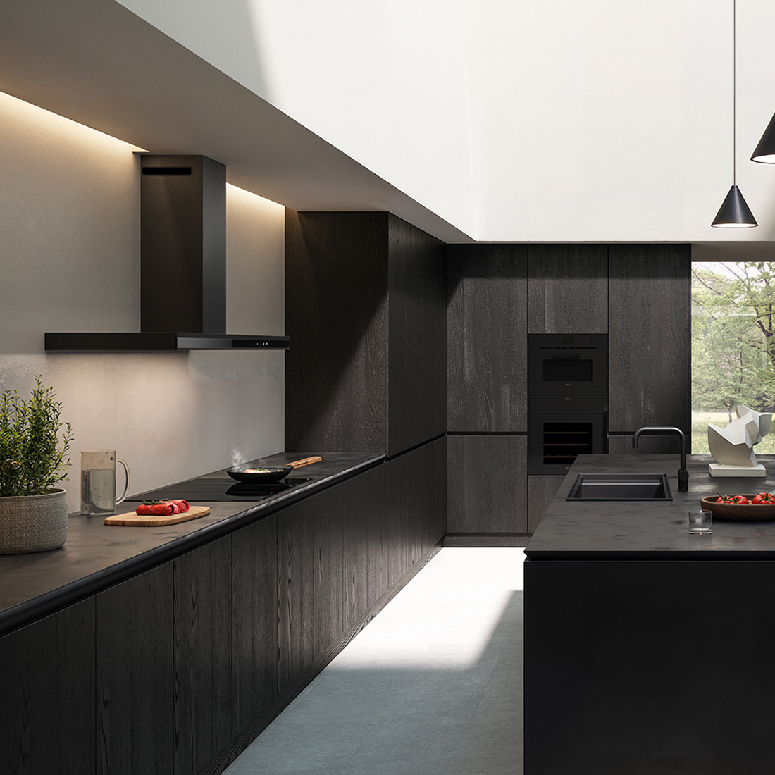 The lighting is diffused over the hob and is adjustable in intensity thanks to the dimmer function. The Bluetooth connection between hood and induction hob allows automatic adjustment according to the selected cooking level. Energy class A offers the best compromise in terms of performance, energy consumption, and Comfort Silence.