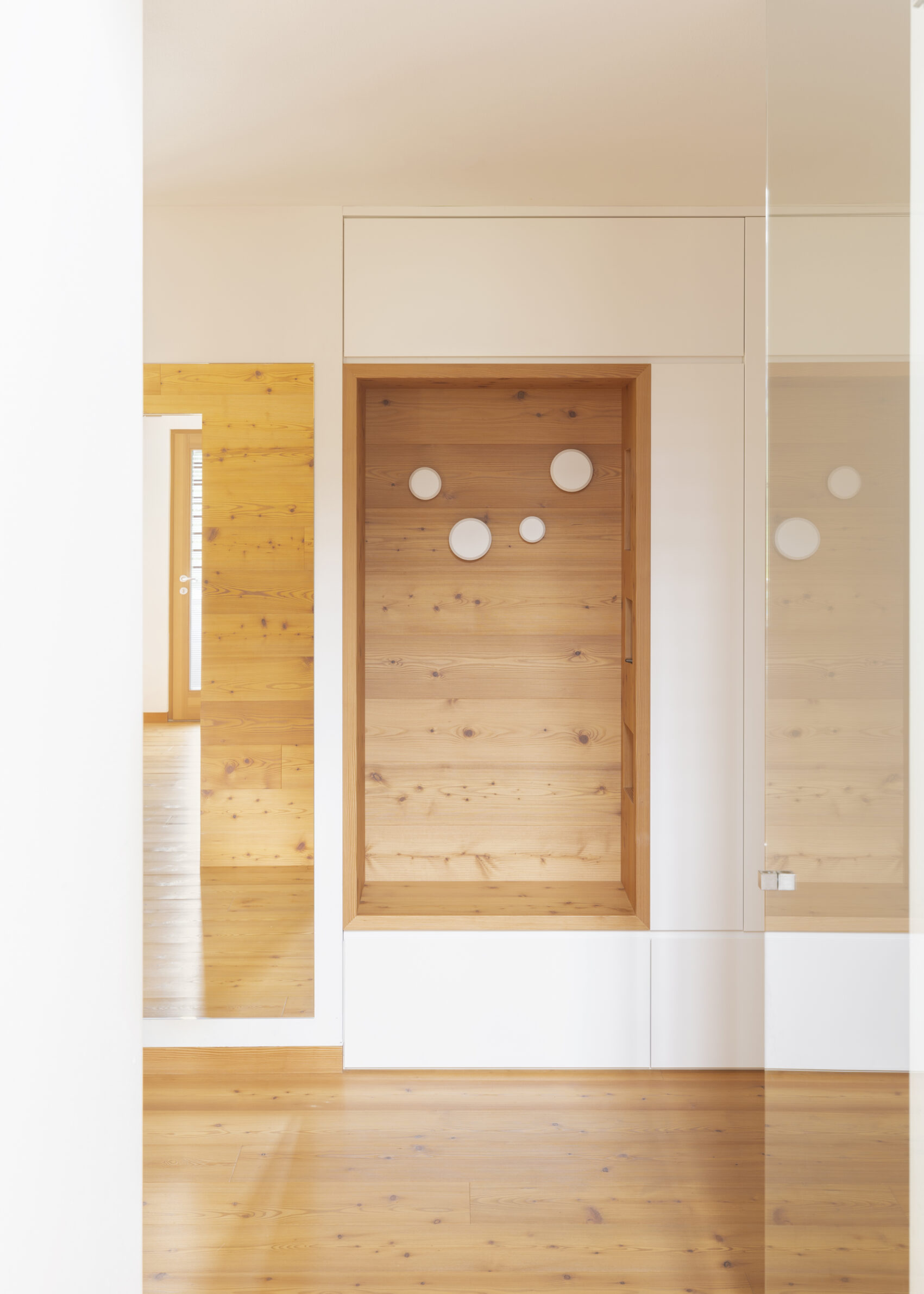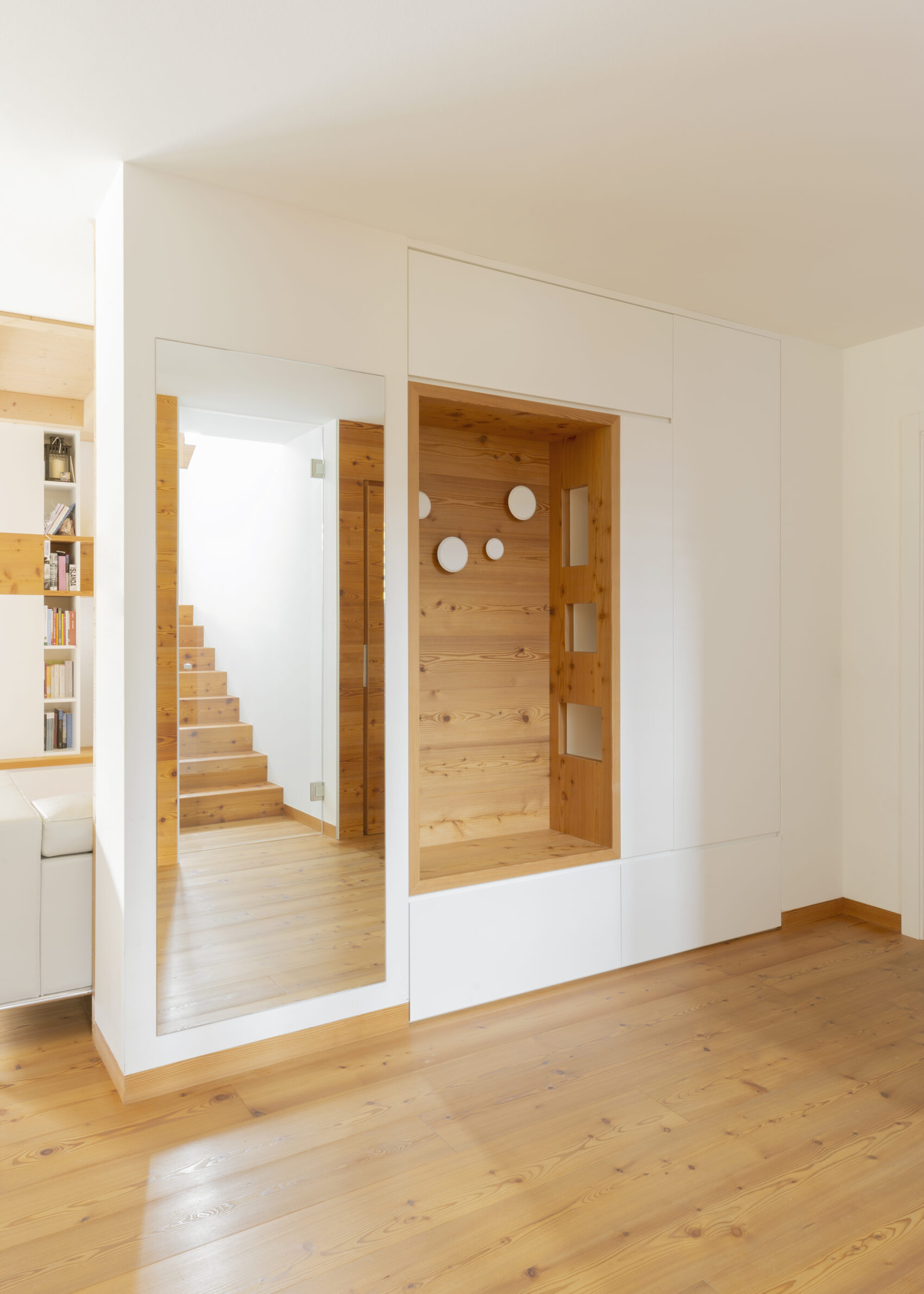 The brief was to define the living area from the apartment entrance with a spacious, streamlined storage unit. The integrated niche serves as a coat rack, a seating area, and hidden 'pocket-emptying' shelves, standing in sharp contrast to the surrounding cabinetry. The shift from occasional to daily use is further emphasized through the choice of materials: the white lacquered storage units blend seamlessly into the home environment, allowing the natural larch wood insert of the niche to emerge and welcome the guest.