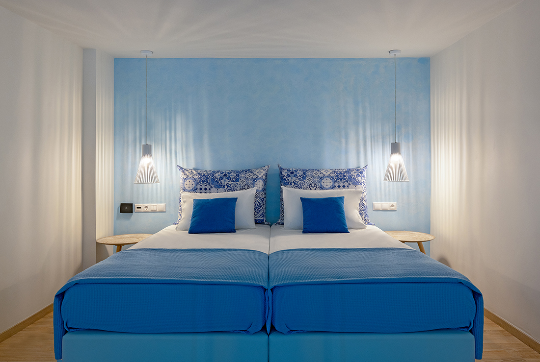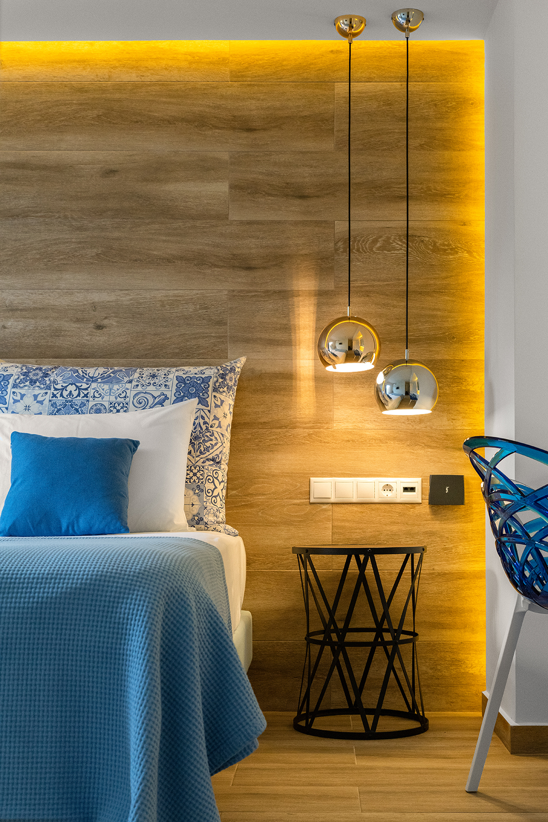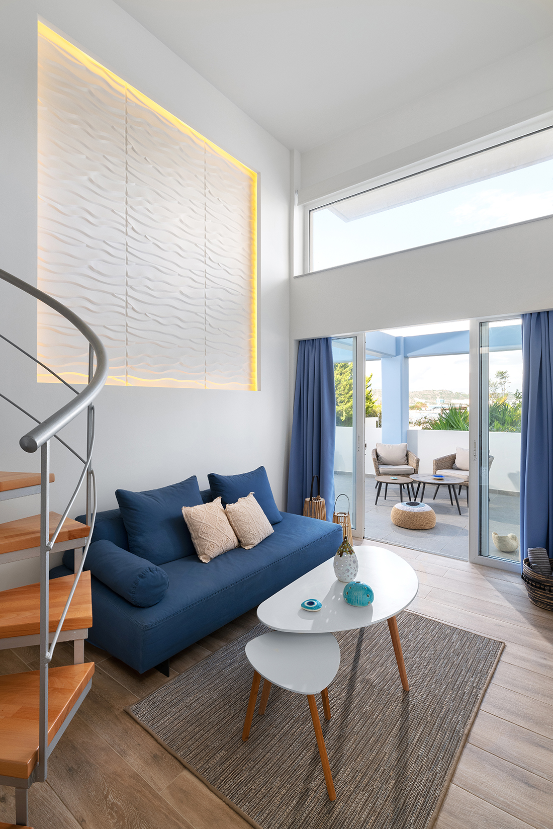 • Sky, Sea & Earth: Combination of “earthy” colors (the brown color of the wood), with the blue tones (the blended colors on the walls, the fabrics) of the sky and the sea. Selection of “wavy” 3d panels, referring to the waves of the sea,