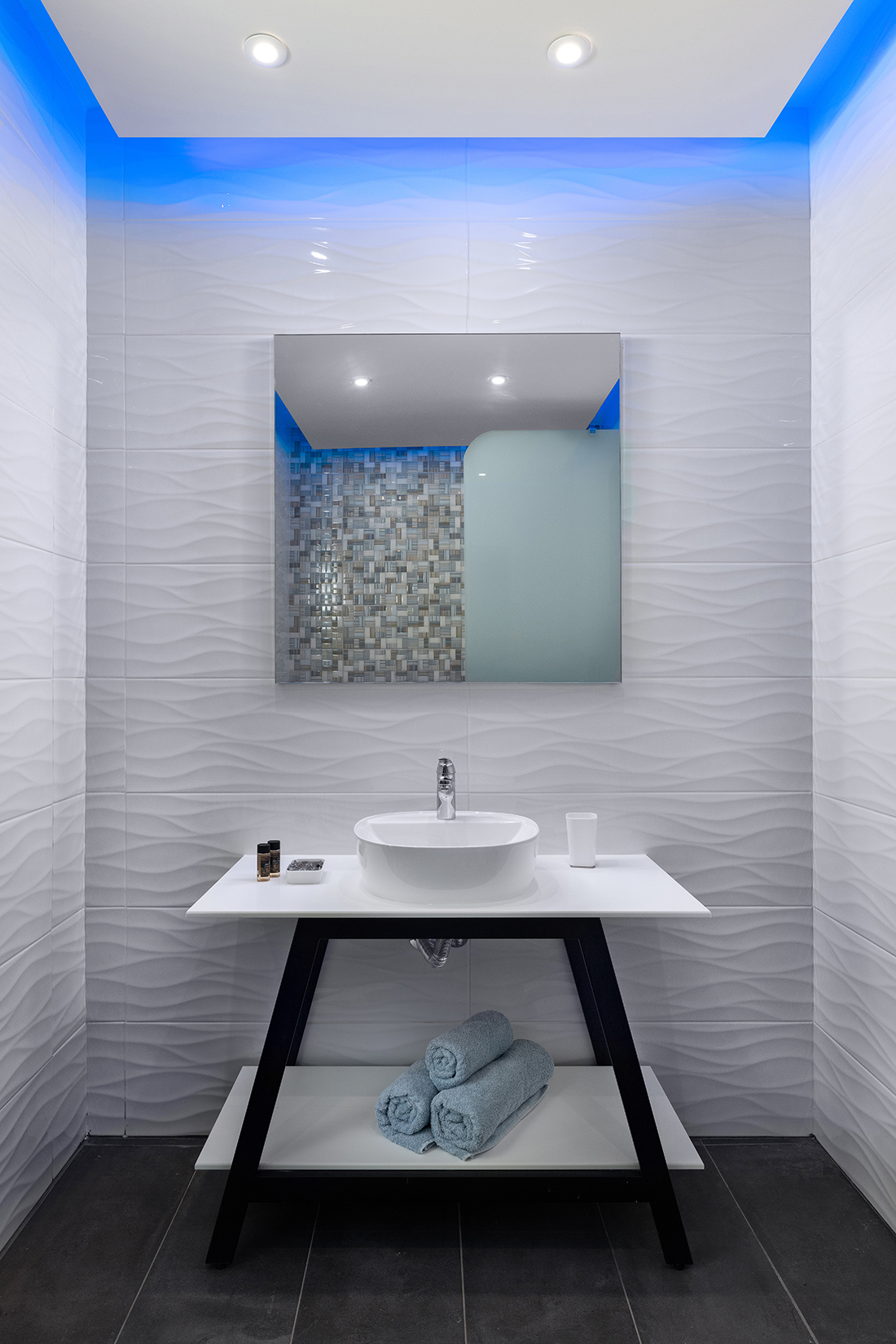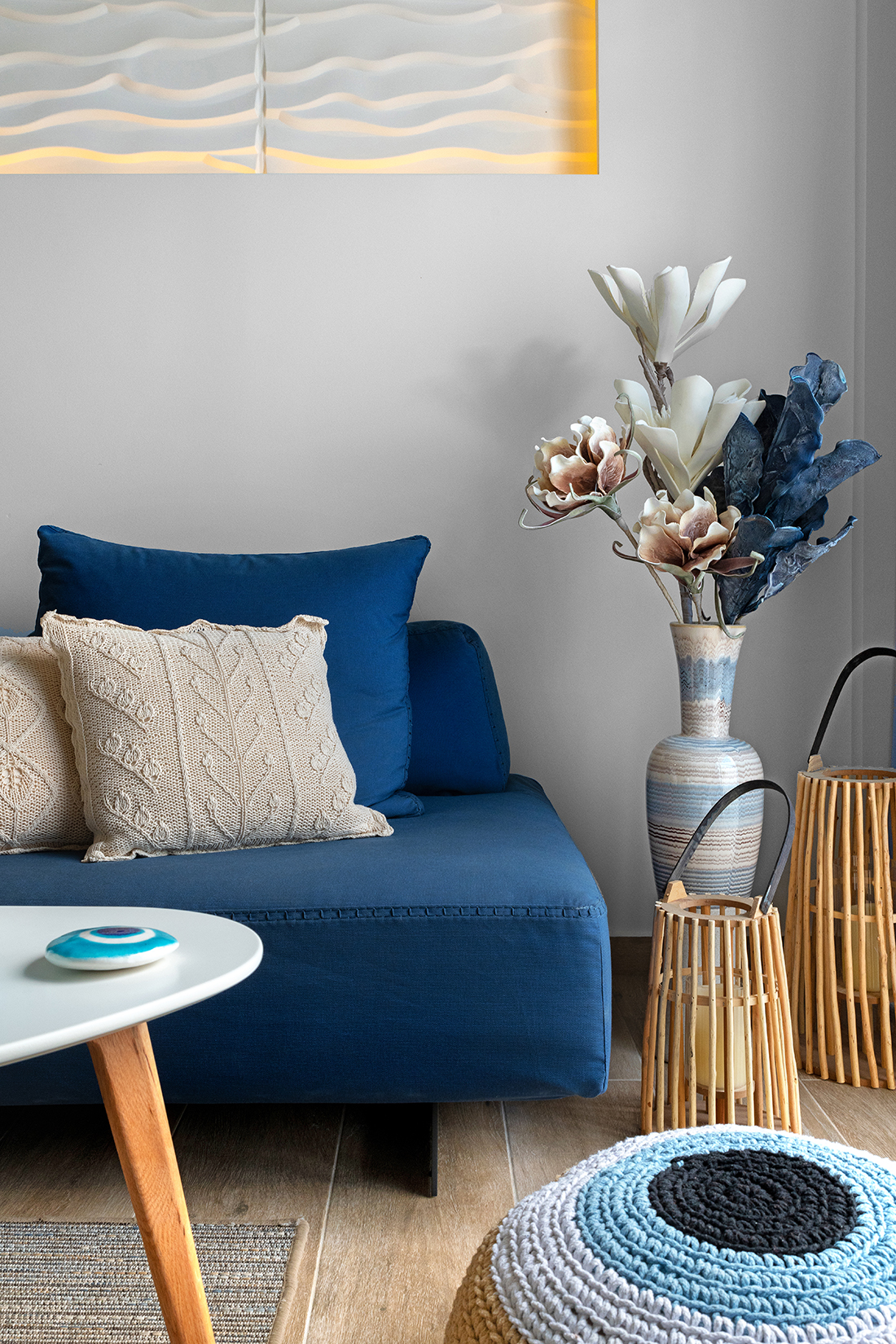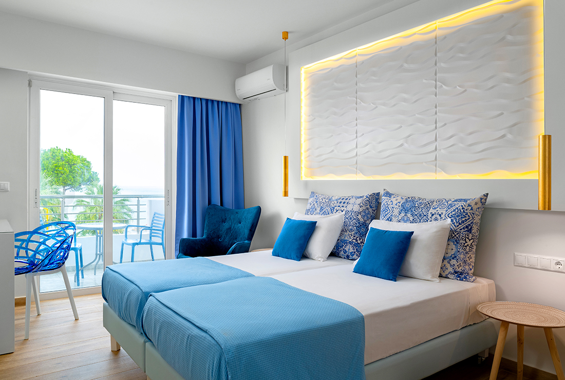 • Sky, Sea & Earth: Combination of “earthy” colors (the brown color of the wood), with the blue tones (the blended colors on the walls, the fabrics) of the sky and the sea. Selection of “wavy” 3d panels, referring to the waves of the sea,