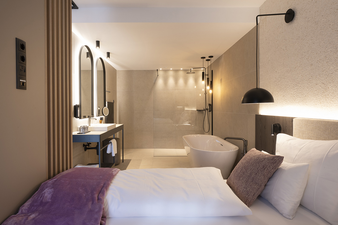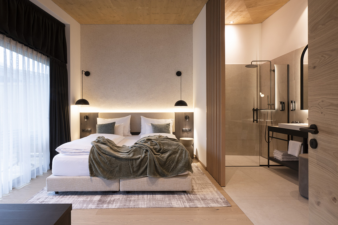 The dark timber façade visually separates the new structure from the existing building; light façade setbacks create private retreat areas for guests. Varied openings and cut-outs in the façade frame both near and distant views of the surrounding alpine landscape. The restaurant, bar, and lounge, as well as the Sky Spa with pool, fitness, bouldering, and yoga areas, offer diverse spaces for relaxation and recreation – all with direct visual connections to the Mountain ELFER, the hotel’s namesake. The aim was to combine a clear architectural language with bright, warm interior spaces, while designing efficient floor plans. Natural materials, textured plaster surfaces, light oak flooring, soft beige and green tones, and a carefully considered lighting concept create an atmosphere of calm and serenity – inspired by the nature of the Stubai Alps.