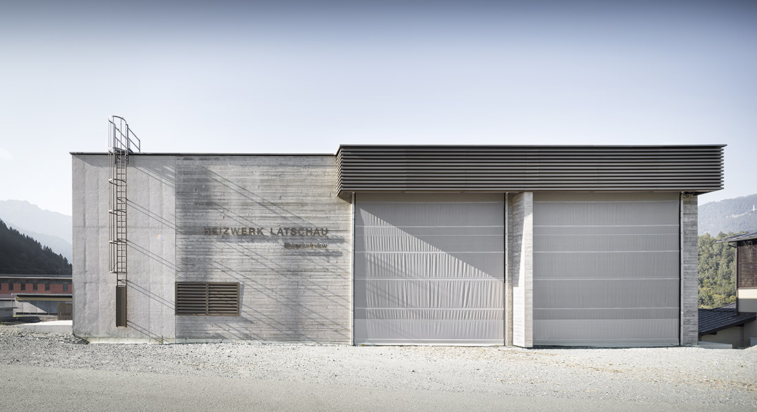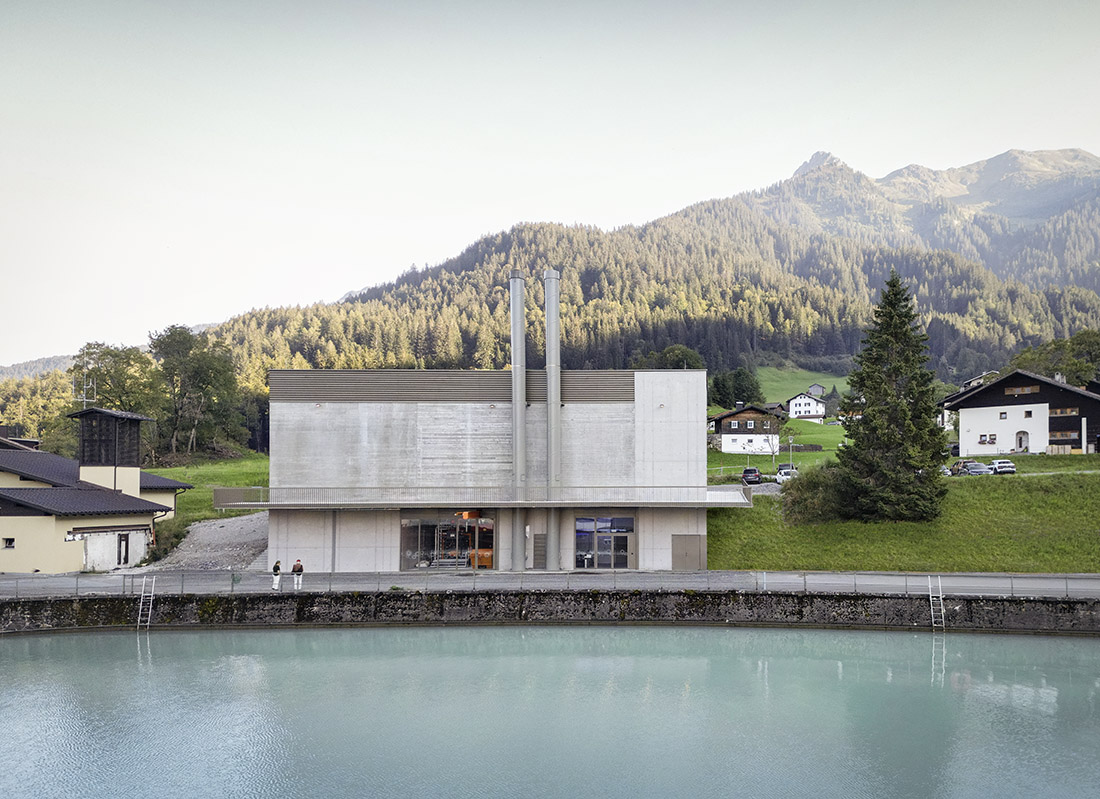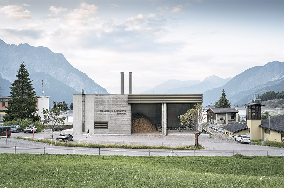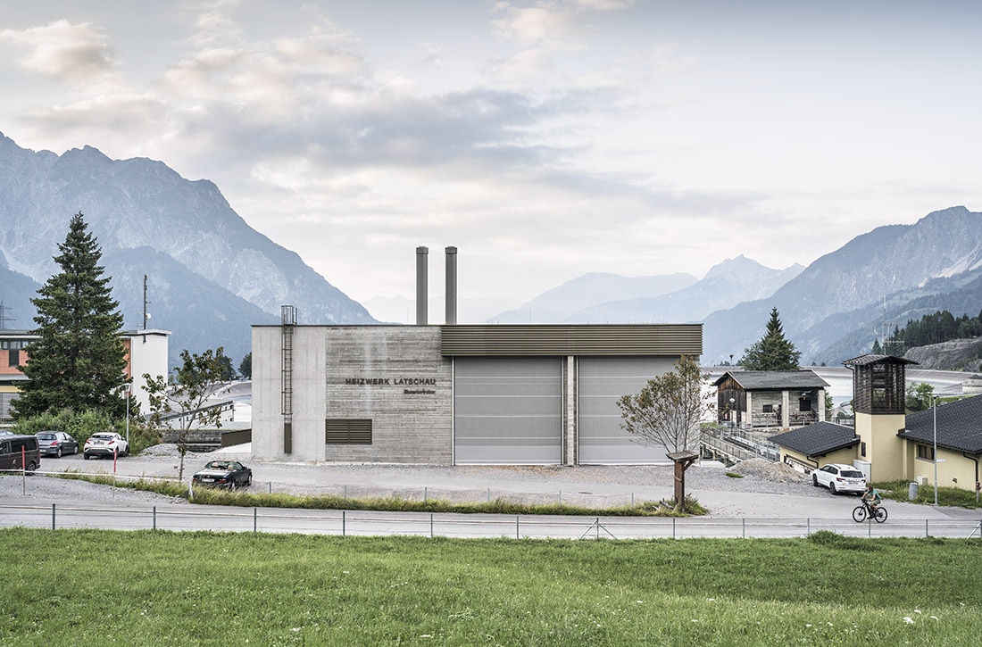 In the case of the Latschau heating plant, building in the Alps entails selecting materials and colors that allow the structure to blend into the landscape, reflecting the elegant monotony of the mountains. A solid concrete body, with various surface textures and a consistent spot color for all metal surfaces, harmonizes with the surrounding atmosphere. An ecological concept connects the building with its surroundings: biomass from the local area serves as an energy source for the heating network, free cooling from the reservoir offers cooling capacity for the hotel, and a combination of a photovoltaic system and a green roof using local topsoil supports the re-colonization of typical local plants.