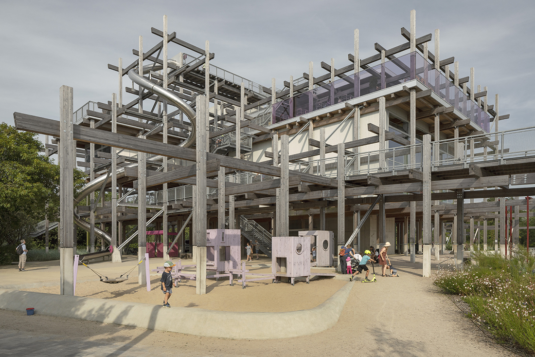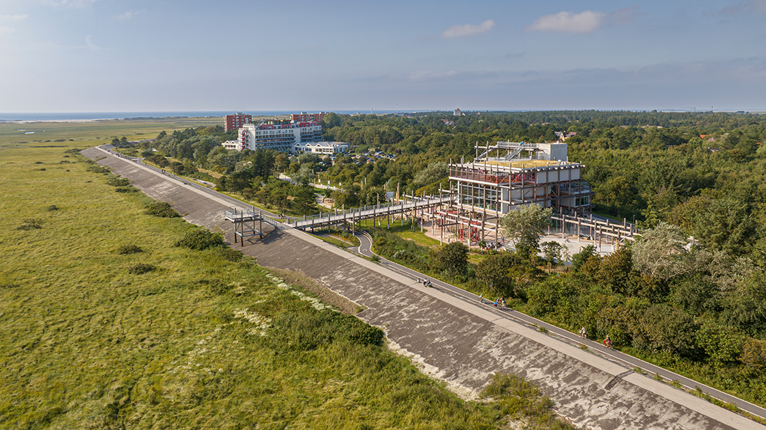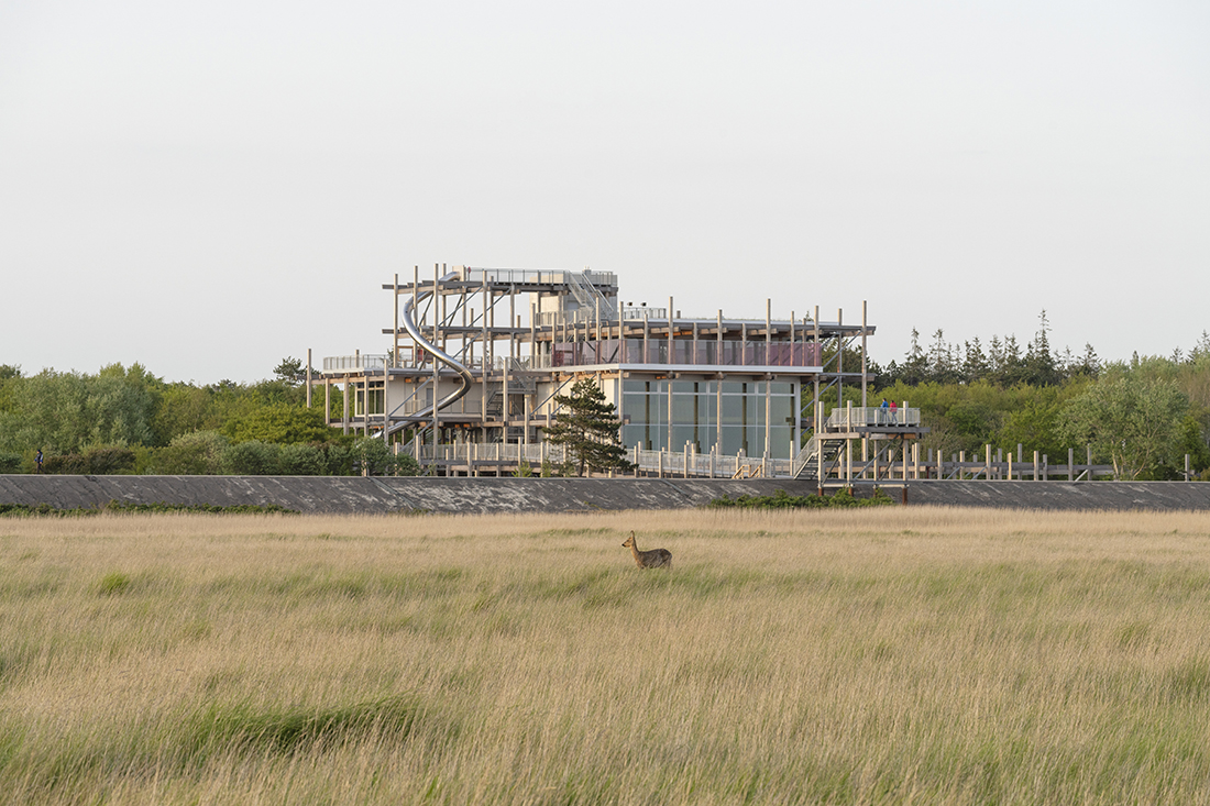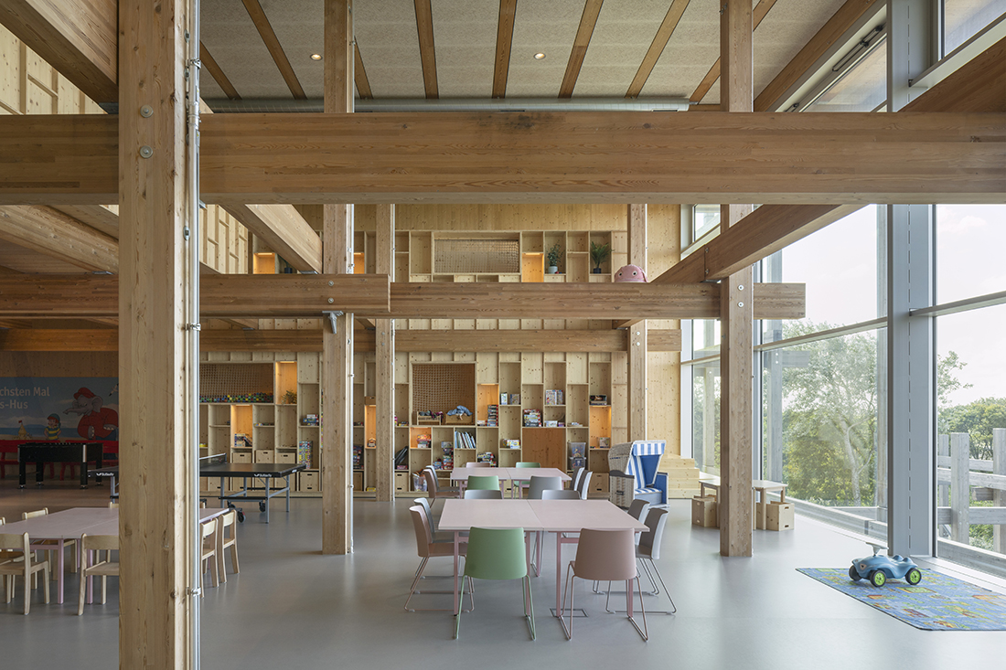 The new Erlebnis-Hus in St. Peter-Ording completes the expanded beach promenade and serves as an inclusive meeting place for visitors of all ages. Rooted in local identity, its design is inspired by traditional pile construction. An exposed laminated timber framework contains five oversized, solid wood cubes positioned at different heights. Developed as a sustainable and innovative solution, the building enhances the site socially and touristically.