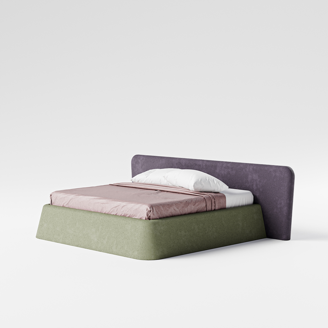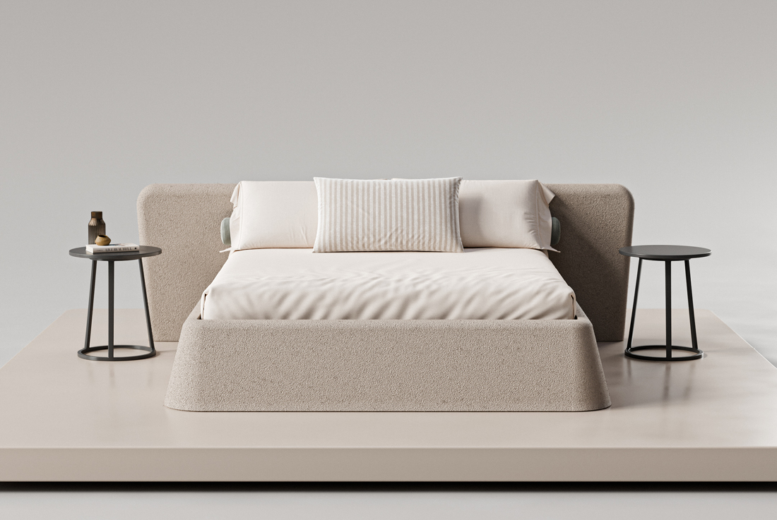 The Essence bed’s design emphasizes clean lines, harmonious proportions, and maximum comfort. Its minimalist aesthetic is accentuated by precise craftsmanship and the use of premium materials. The rounded shapes and soft upholstery transition seamlessly from the side panels to the headboard, forming a compact unit that appears visually light yet remains sturdy and stable.