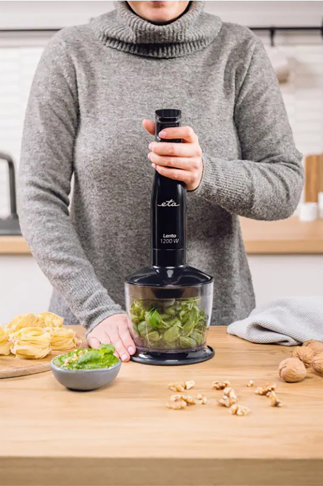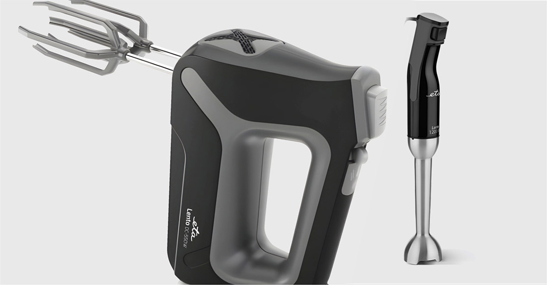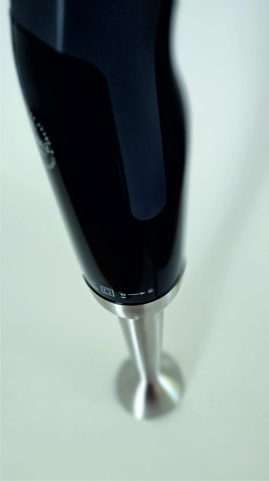 With an upper part that is slightly sloped, it provides a more natural and comfortable grip. Despite its affordable price point, the Eta Lento rivals professional-grade stick blenders in both design and functionality. The design draws inspiration from the Eta Lento hand beater, creating a cohesive and uniform look across both appliances. They share the same basic shape elements, details, and a sleek black color scheme, reinforcing the unified aesthetic of the set.