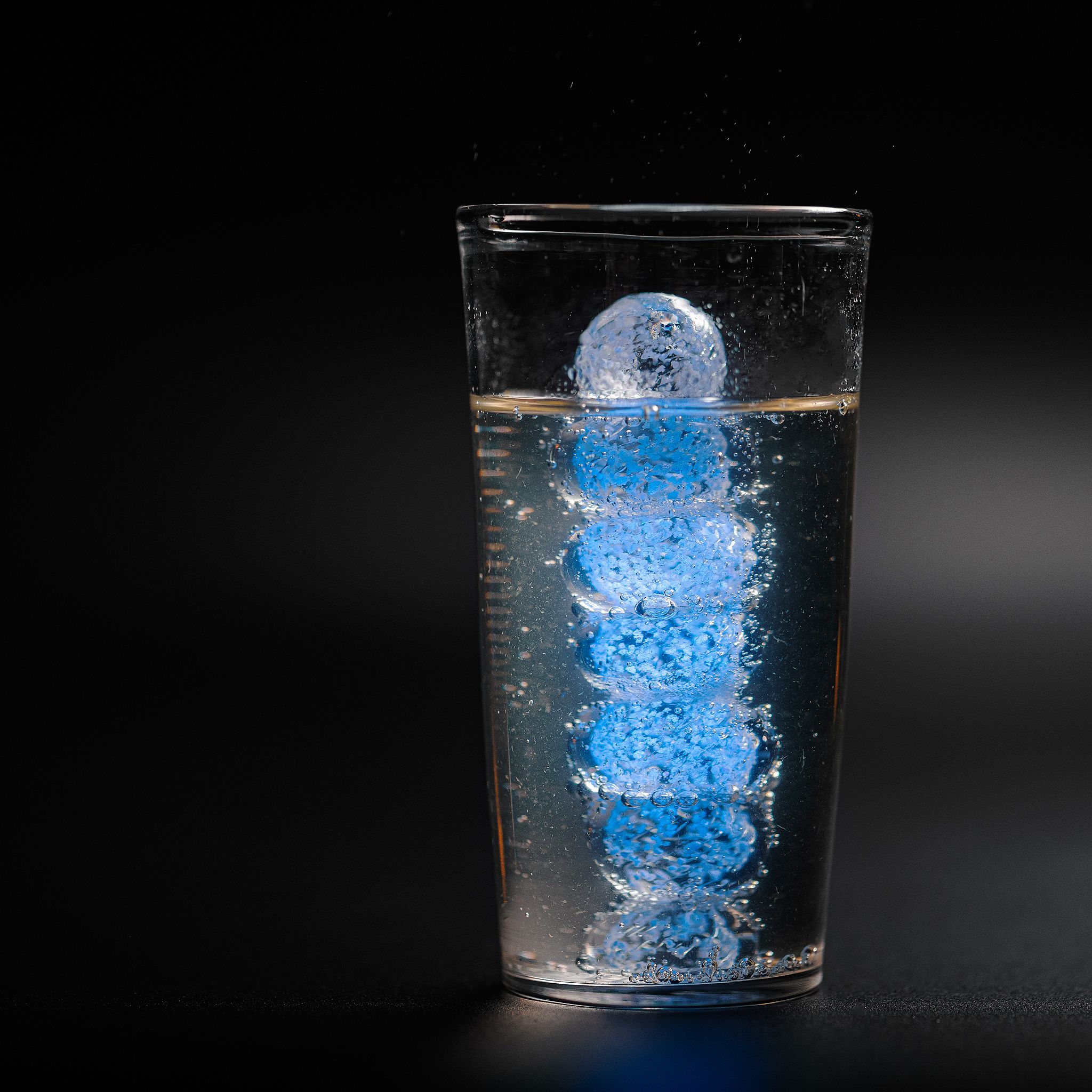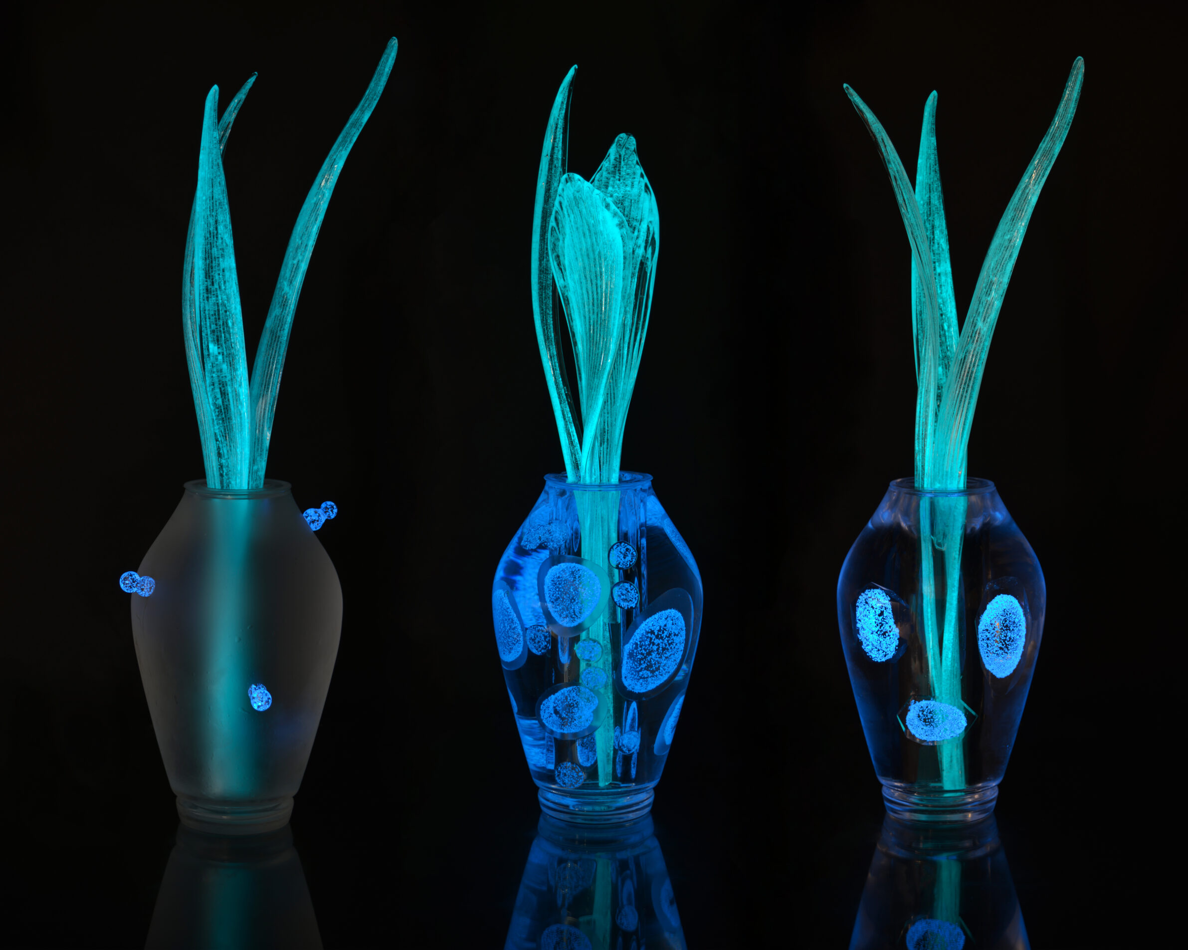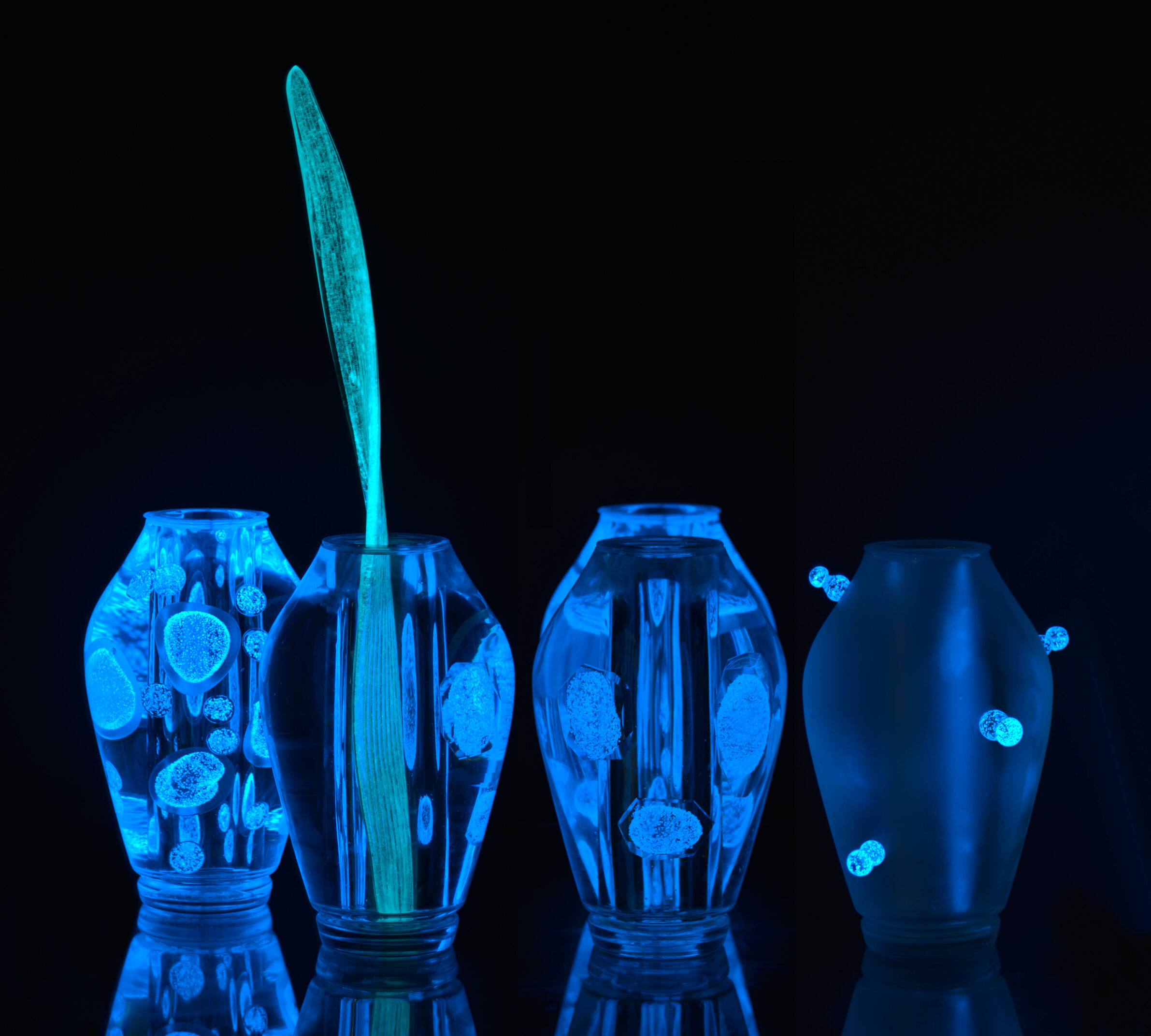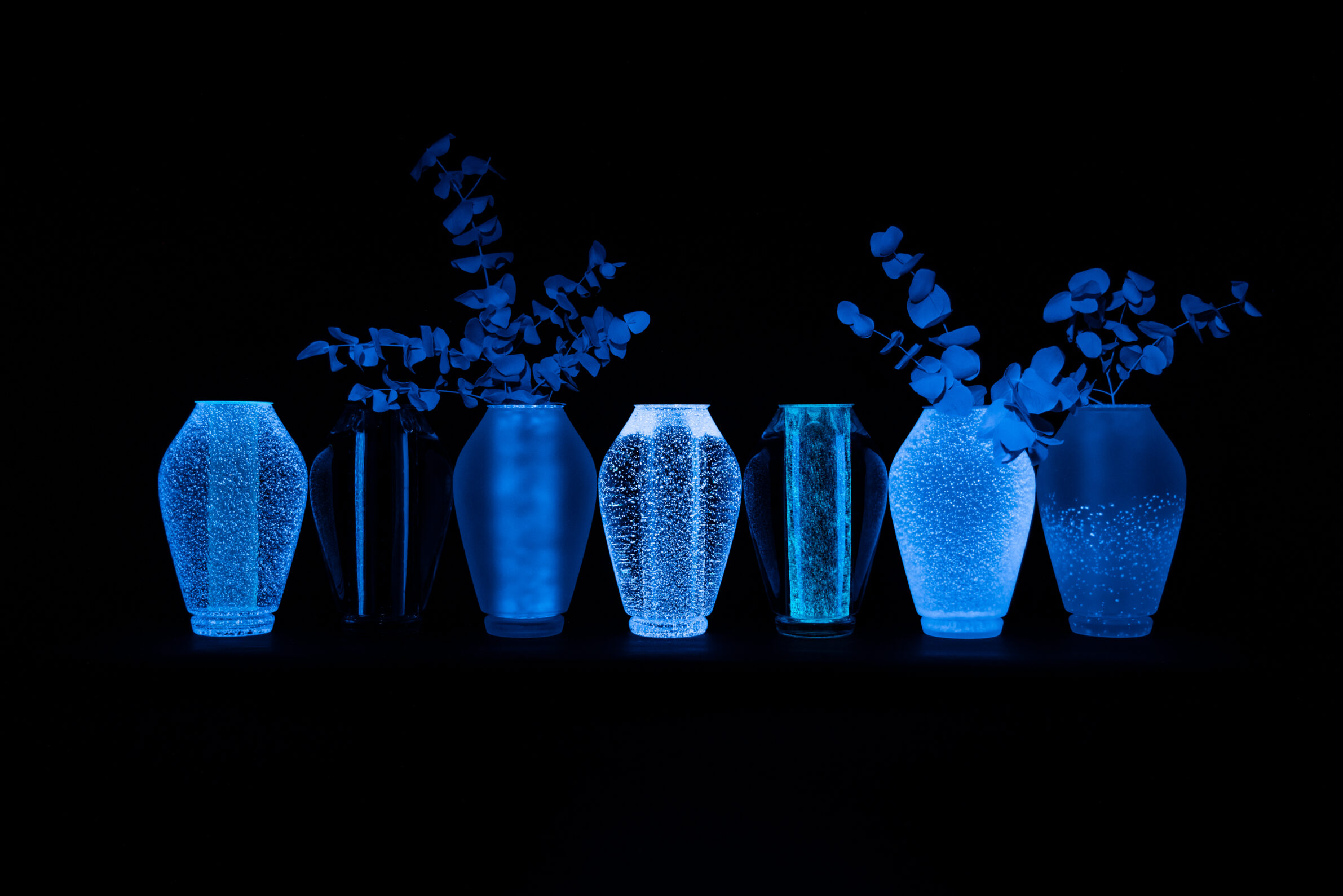 The BLUE project represents an authorial investigation into the relationships between light, material, and perception, in which glass becomes an active medium of visual transformation. Crystal glass, preserved in its inherent colorlessness, acquires its chromatic identity only through interaction with light, which activates a fluorescent pigment embedded directly within the glass matrix. As such, the color does not originate from the material itself but emerges as a light-dependent phenomenon, continuously shifting according to the spectral qualities of the surrounding environment. Formally, the vase consists of two rotating glass volumes that create an interstitial cavity filled with mineral oil, functioning as an optical interface that modulates the transmission of light. At the same time, the object exhibits properties of a lens system—its form and material transform the visual perception of elements placed within the cavity, producing optical distortions, magnification, or softened contours. The BLUE project thus articulates fluorescence as a design tool while exploring the boundaries between material reality and an ephemeral, light-constructed visuality.