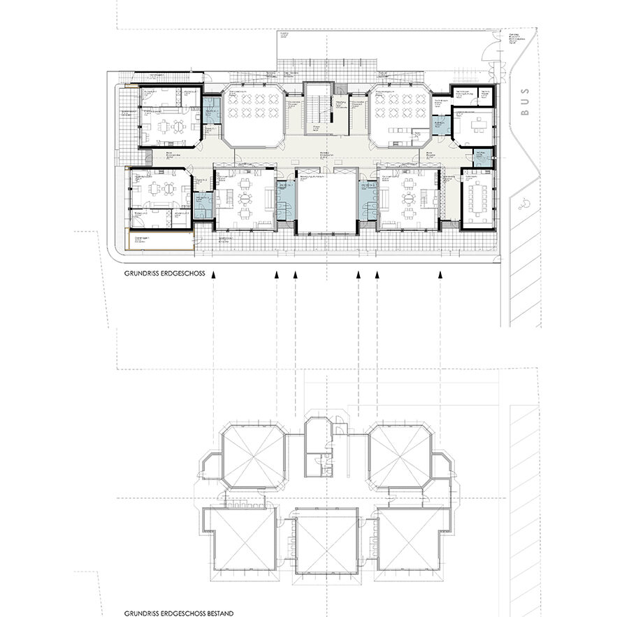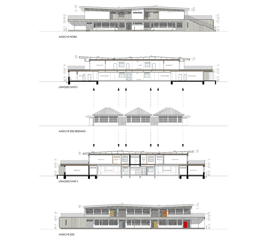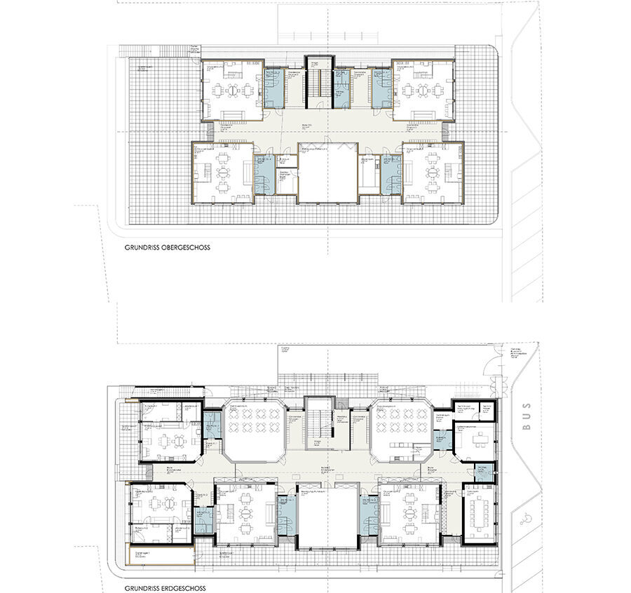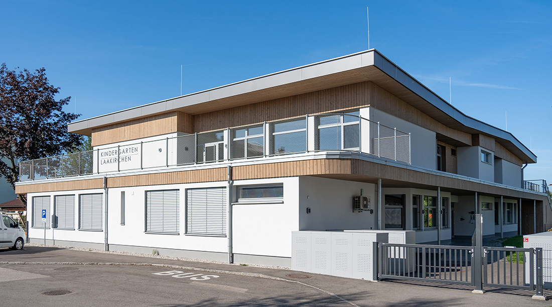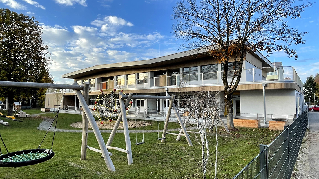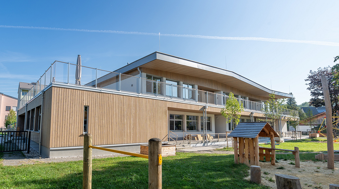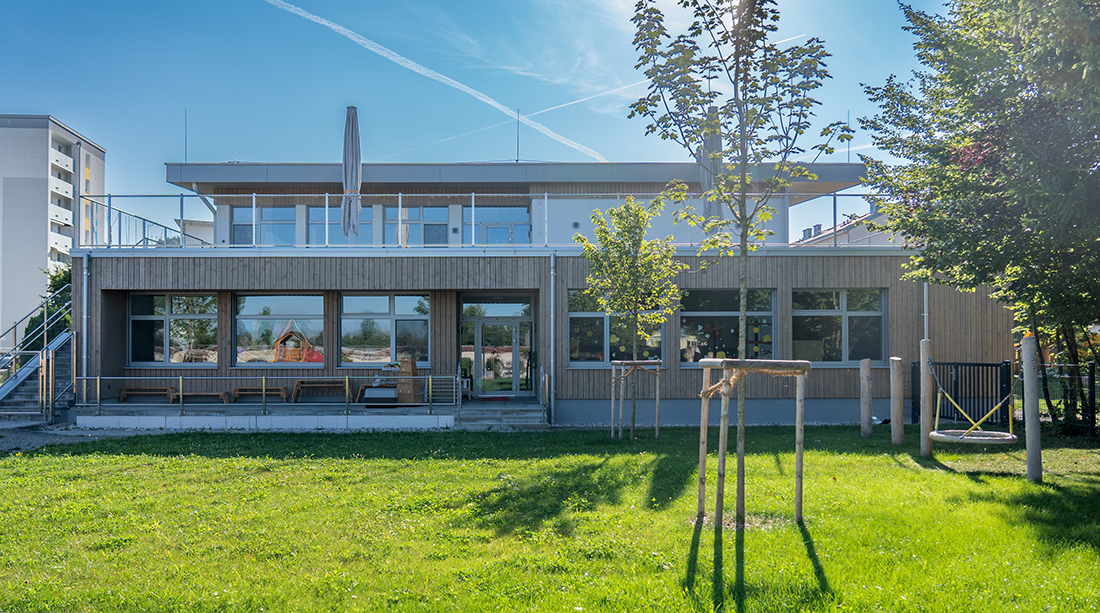 Horizontal and vertical additions transformed the former Caritas kindergarten with three groups into a contemporary elementary educational facility with six kindergarten groups and two toddler groups. The elongated building structure is segmented by projections and recesses in the outer shell, a transition from plaster to wooden cladding, and a reduced surface area. This design creates protected outdoor play areas on two levels, located in front of and around the group rooms. The extensions and superstructures were constructed using sustainable wood panel construction with high-quality hemp insulation.