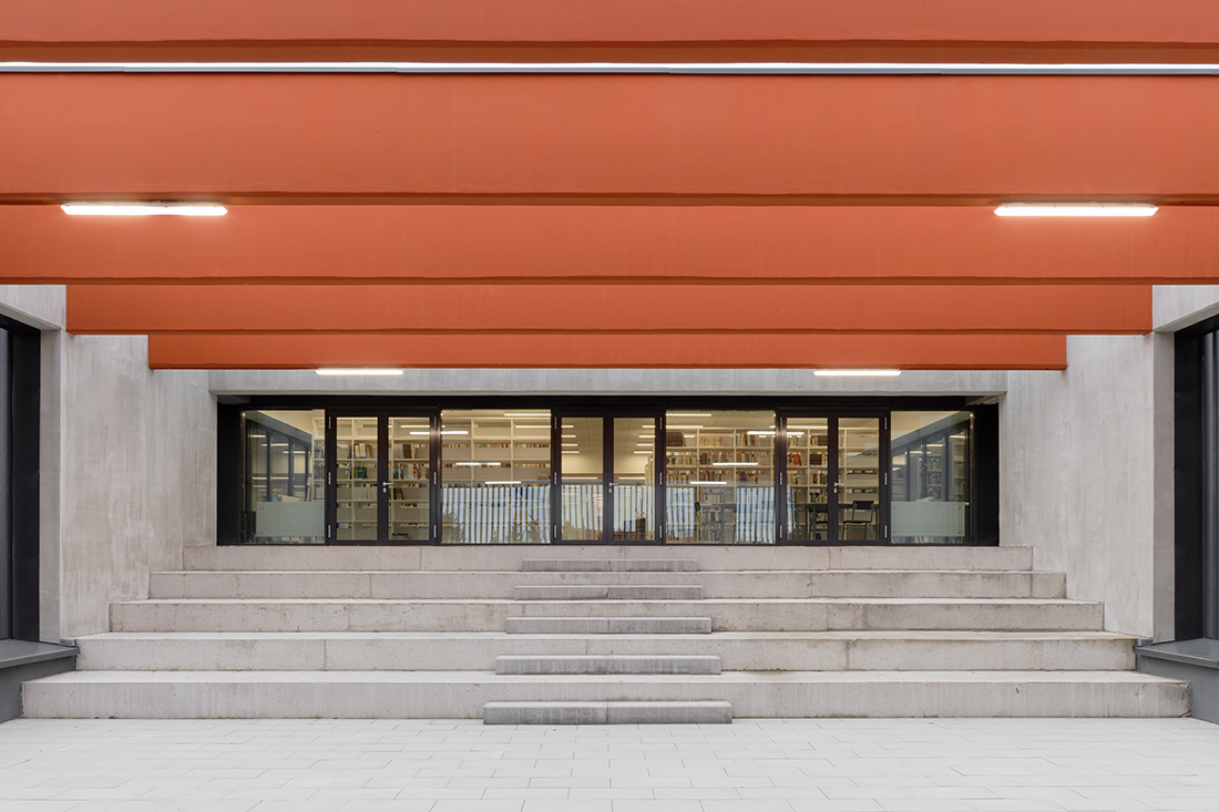 Radiating from the axis, like the spokes of a Segner wheel, are the classrooms, the underground gymnasium, workshops, and the cafeteria, located across both the existing and newly added structures. As a complement to the existing building, this axis – highlighted by a library situated on a bridge and an adjoining atrium – establishes a connection between spaces for learning, practical education, and community life.