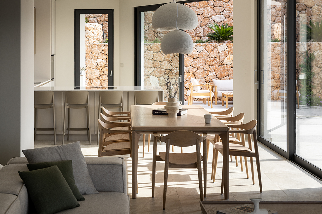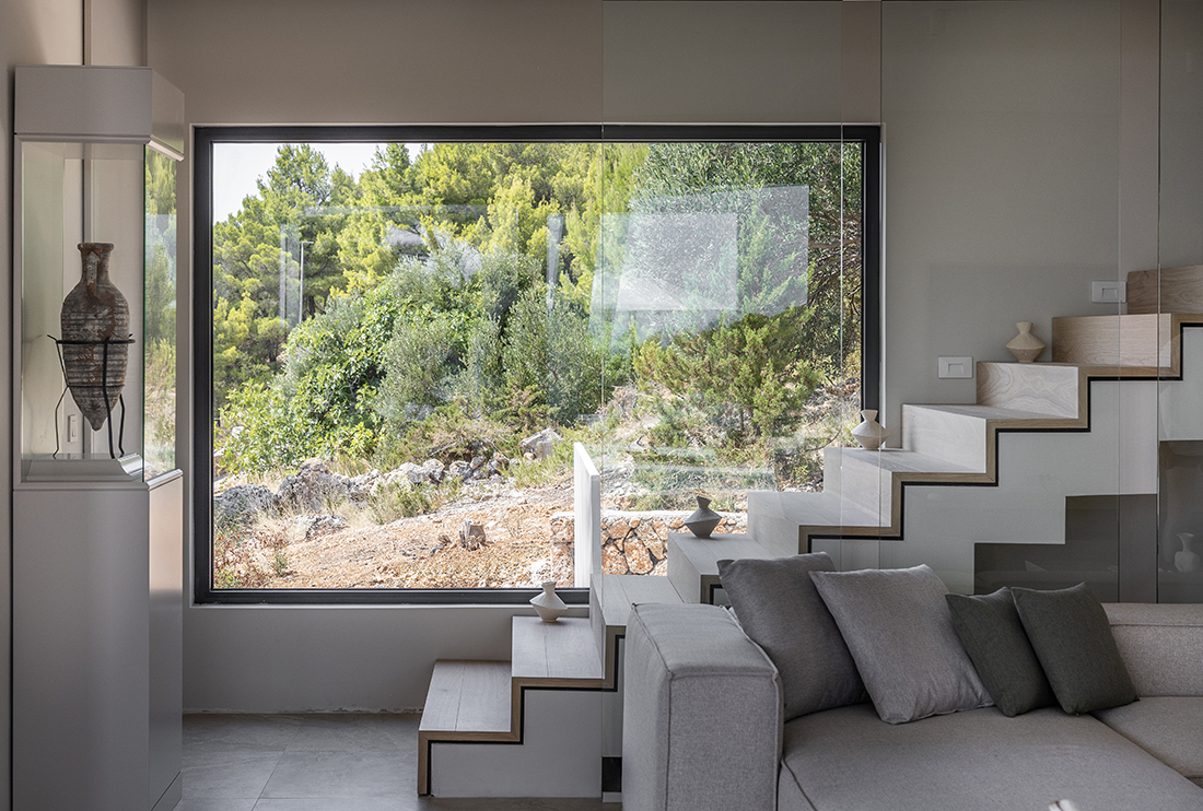 The basement floor is treated with limestone rock, cut into the bowels of the plot. Above it, like a deck, rises the white, two-story space of the house, holding by two white, triangular supports. The southern terrace ends with the console plate – like the prow of a ship that “sails” towards the island of Šćedro. While from the north side it seems as if it is about to set sail, the building is shyly hidden behind pines on the west side, while the eastern part is reserved for the pool and outdoor living. However, the most important part of the house is the covered patio of the ground floor: it is the main place to stay in the shade, with a view of the pool, sea and pines. The building responded in the right way to the microclimate of the region by letting in: wind, shade, and sun, and providing comfort to its users throughout the day.