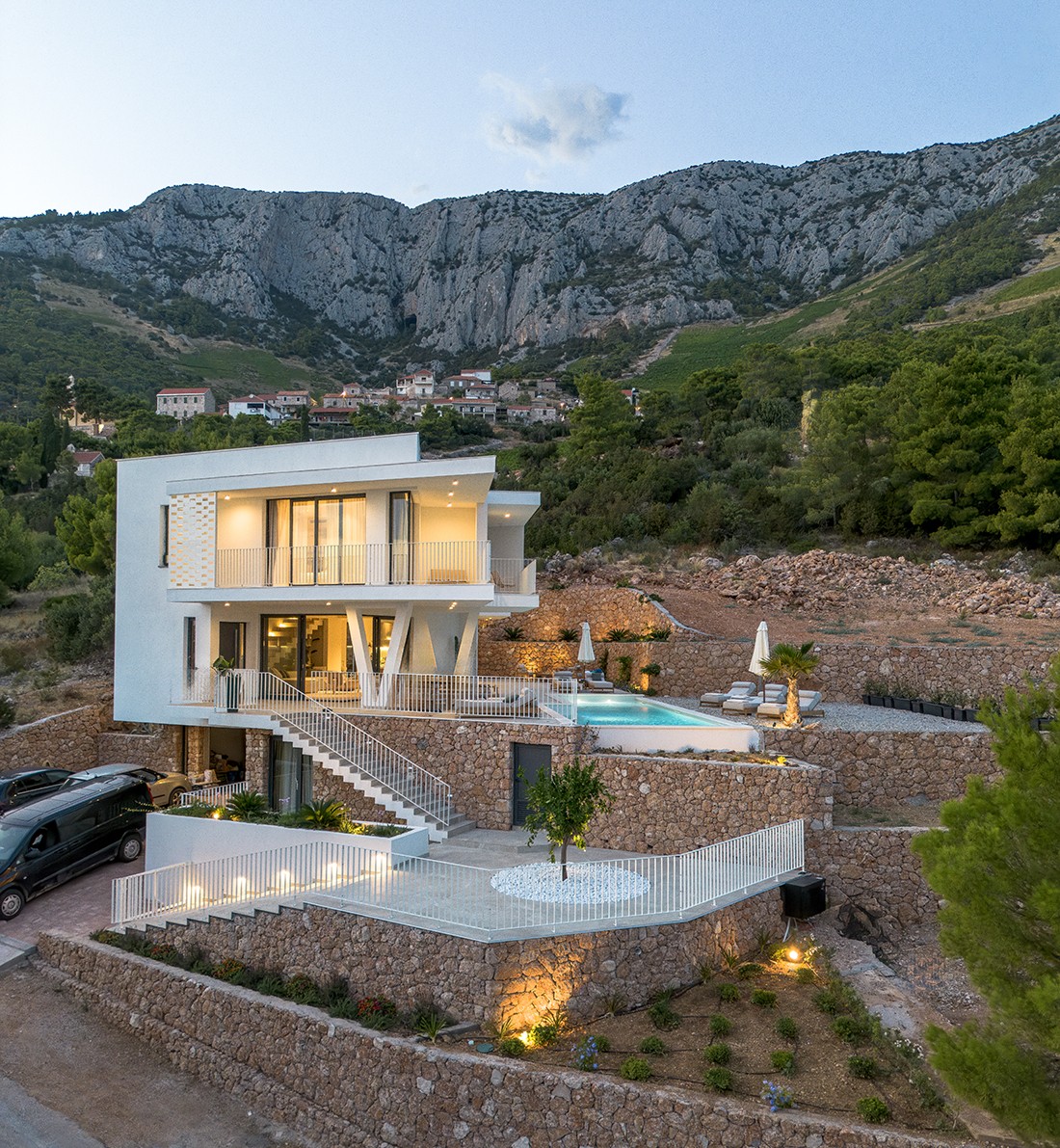 In the specific landscape of the island Hvar: Sv. Nedilja, between slopes and the sea, is located a plot where holiday home is being designed, as an anchored ship between rocks and sea. The whiteness of the building is in strong contrast with the limestone rock – reddish breccia – that characterizes the entire space and is emphasized throughout the layers, from south to north.