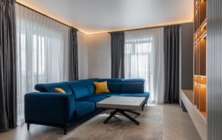 The house is composed of individual functional cells, placed within the garden to weave between the trees. The interior is designed so that the garden visually extends into the living space through large glass surfaces, becoming an integral part of it. The entrance hall opens onto a terrace facing the garden, separating the technical and living areas. The technical facilities include a double garage, laundry room, gym, and dressing room.