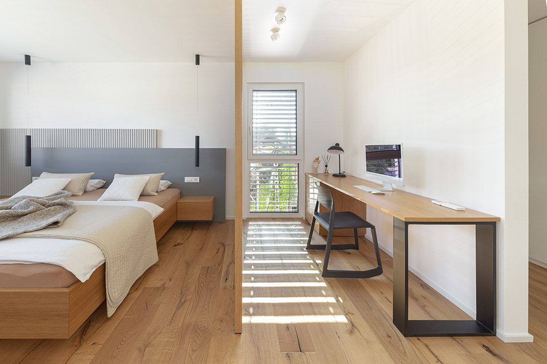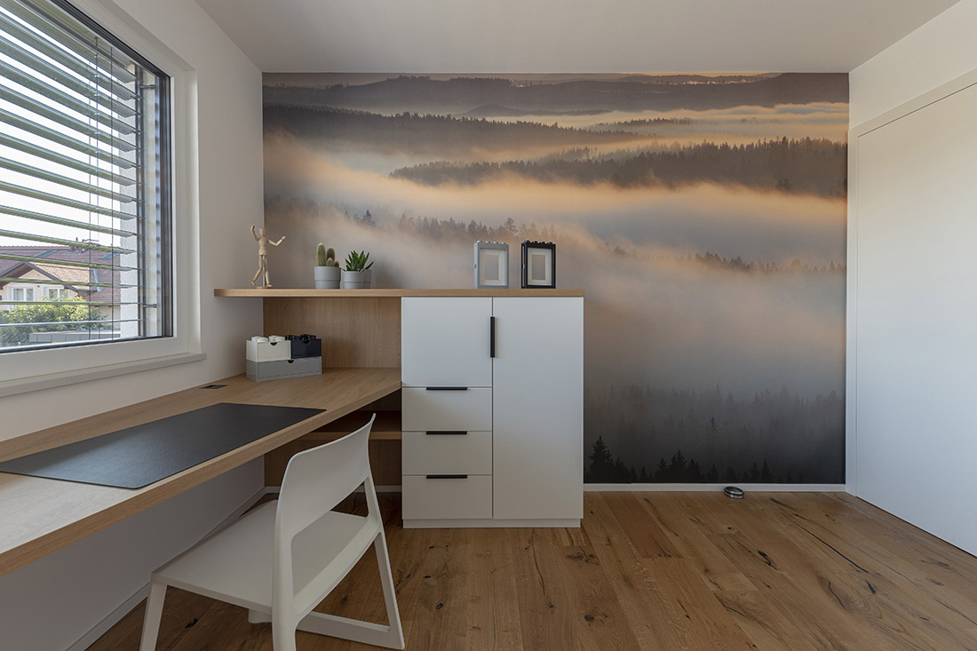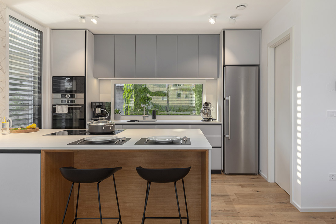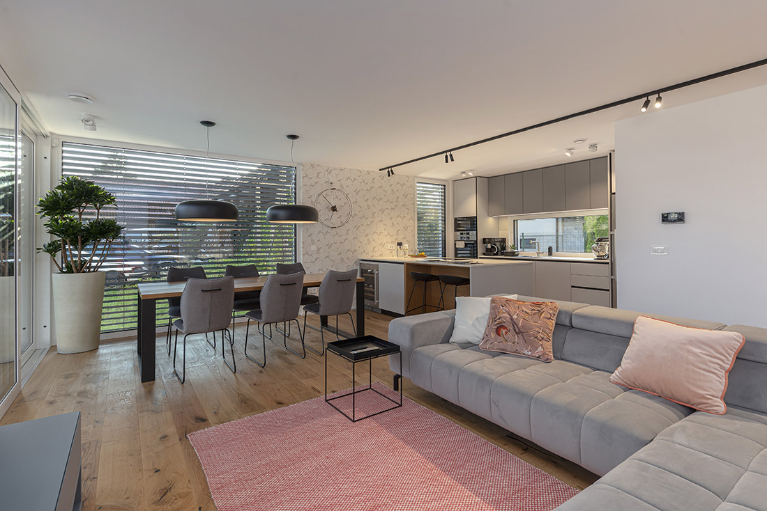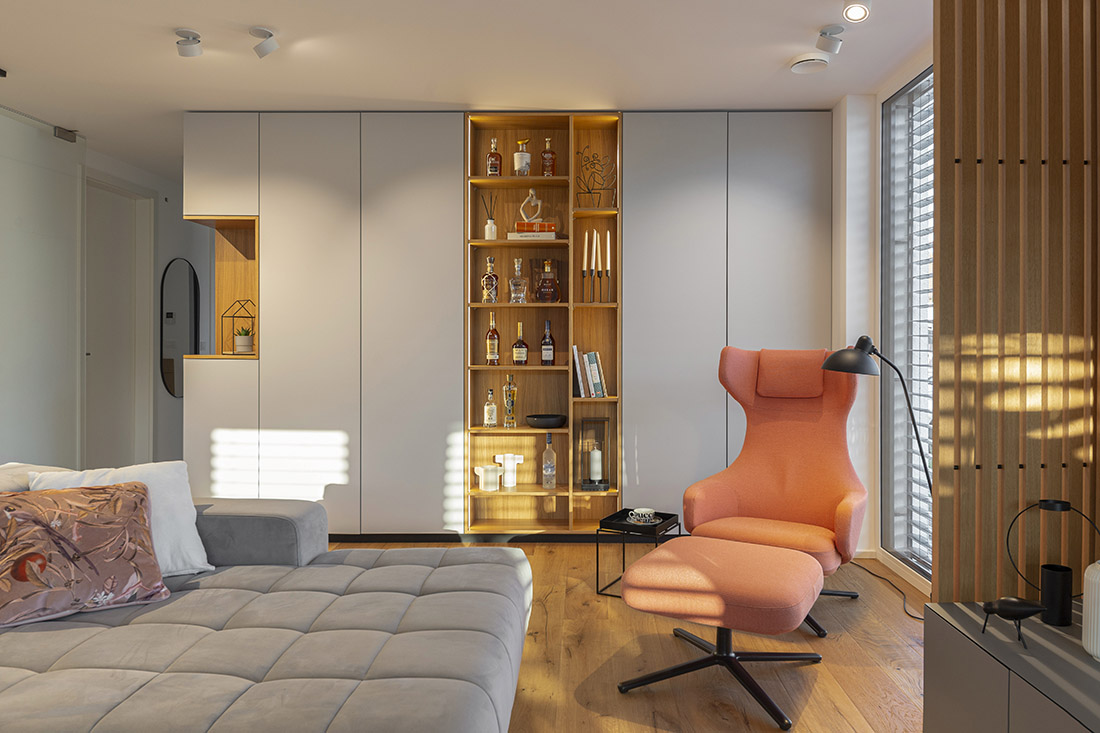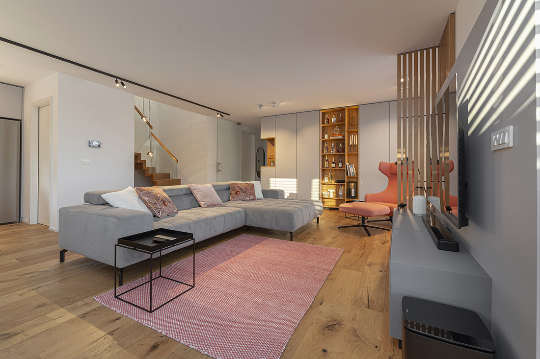 The interior of the elegant and bright family house is made with neutral tones of light gray colors and oak veneer with color highlights. The goal was to create a functional, warm and cozy environment for a family with two children.
