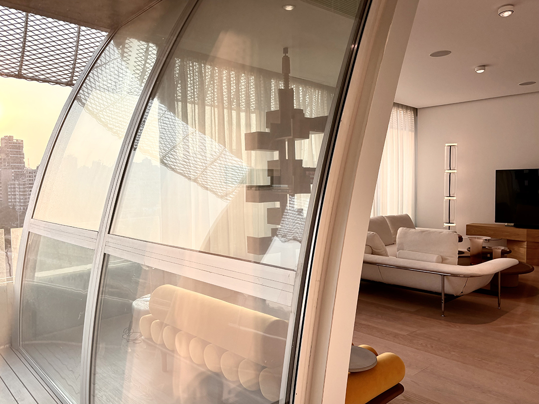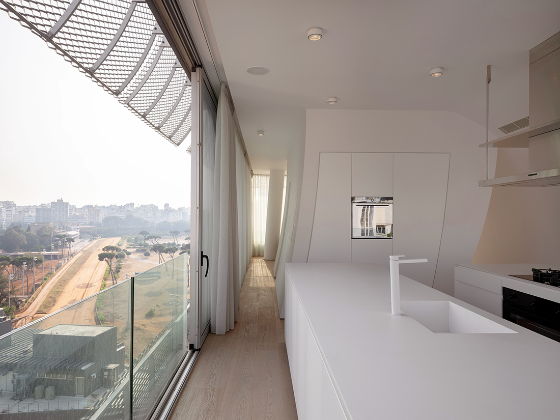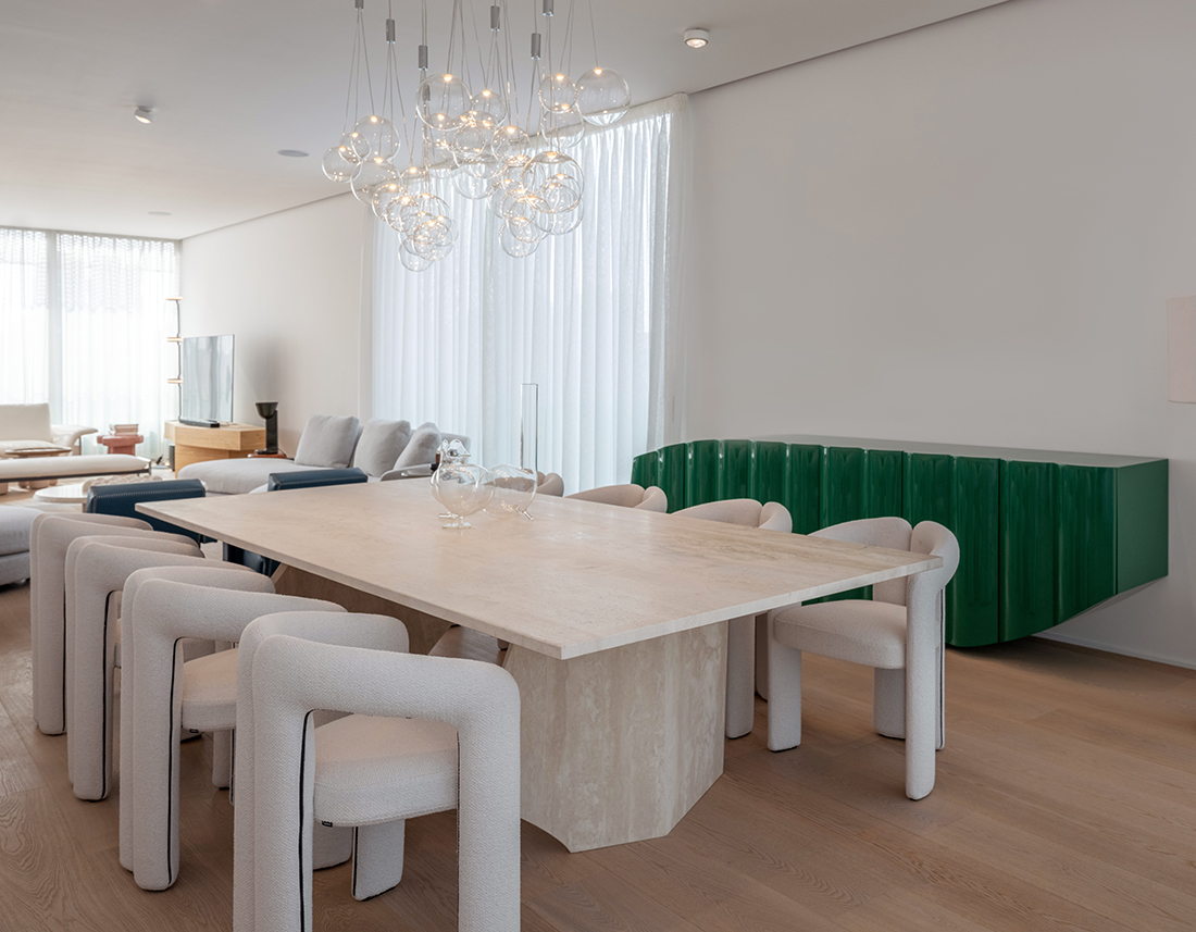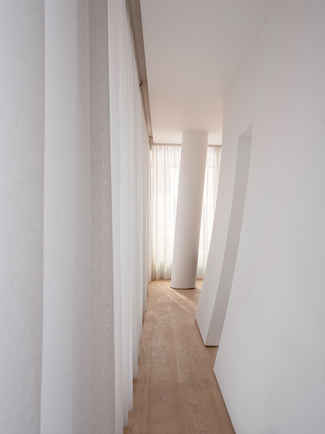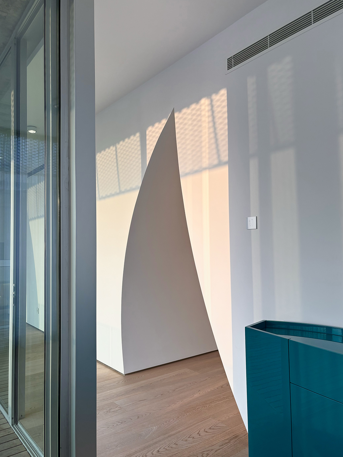 Crisp white walls emphasize the seamless curves of the architecture, creating a striking interplay of light and shadow. This minimalist approach enhances the natural views, while providing a tranquil, timeless aesthetic.