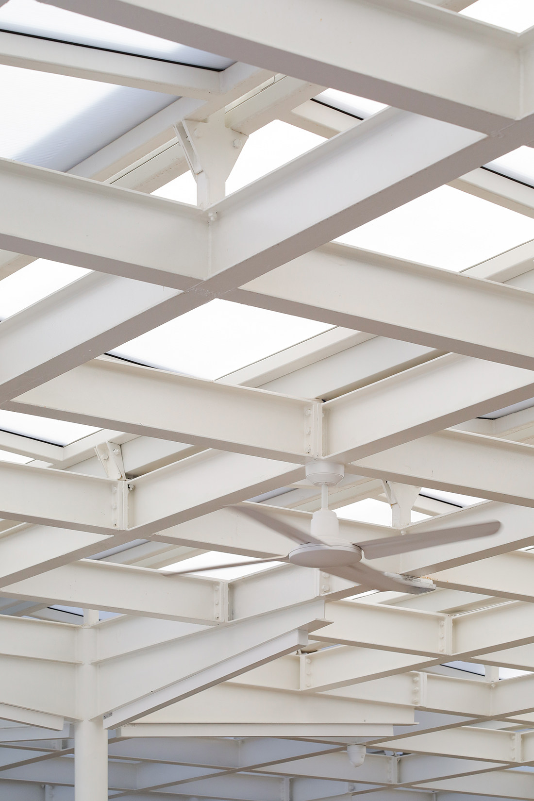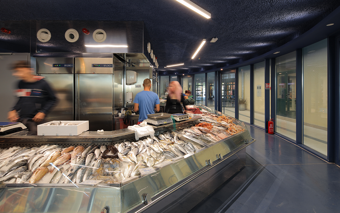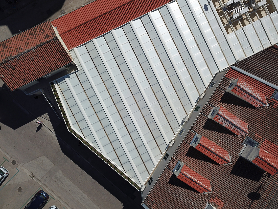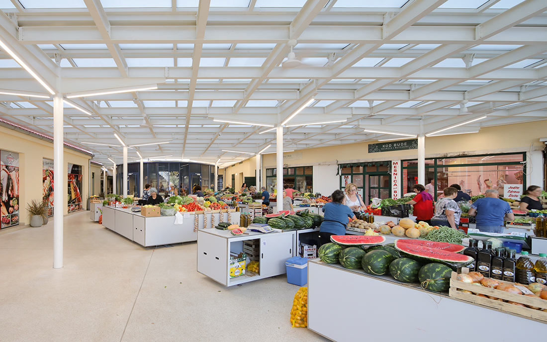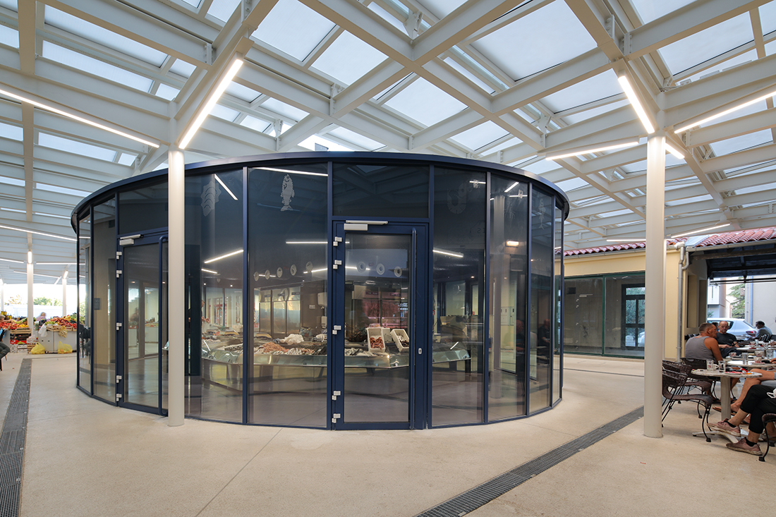 The new fish market is relocated deeper into the plot. Its elliptical, glass structure enables smoother pedestrian circulation and clearly expresses its function, replacing an inadequate and unhygienic facility with a contemporary space. A shared canopy spans the entire site, precisely fitted between existing buildings. A white steel structure unifies the previously fragmented visual context. The canopy integrates rainwater drainage, natural ventilation, and polycarbonate cladding that provides daylight, UV protection, and shade. Microclimatic comfort is improved with assisted air circulation. Columns supporting the canopy also function as lighting elements, creating a floating effect.