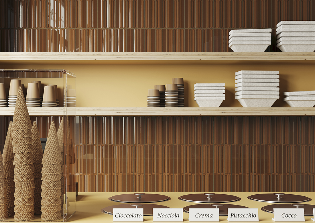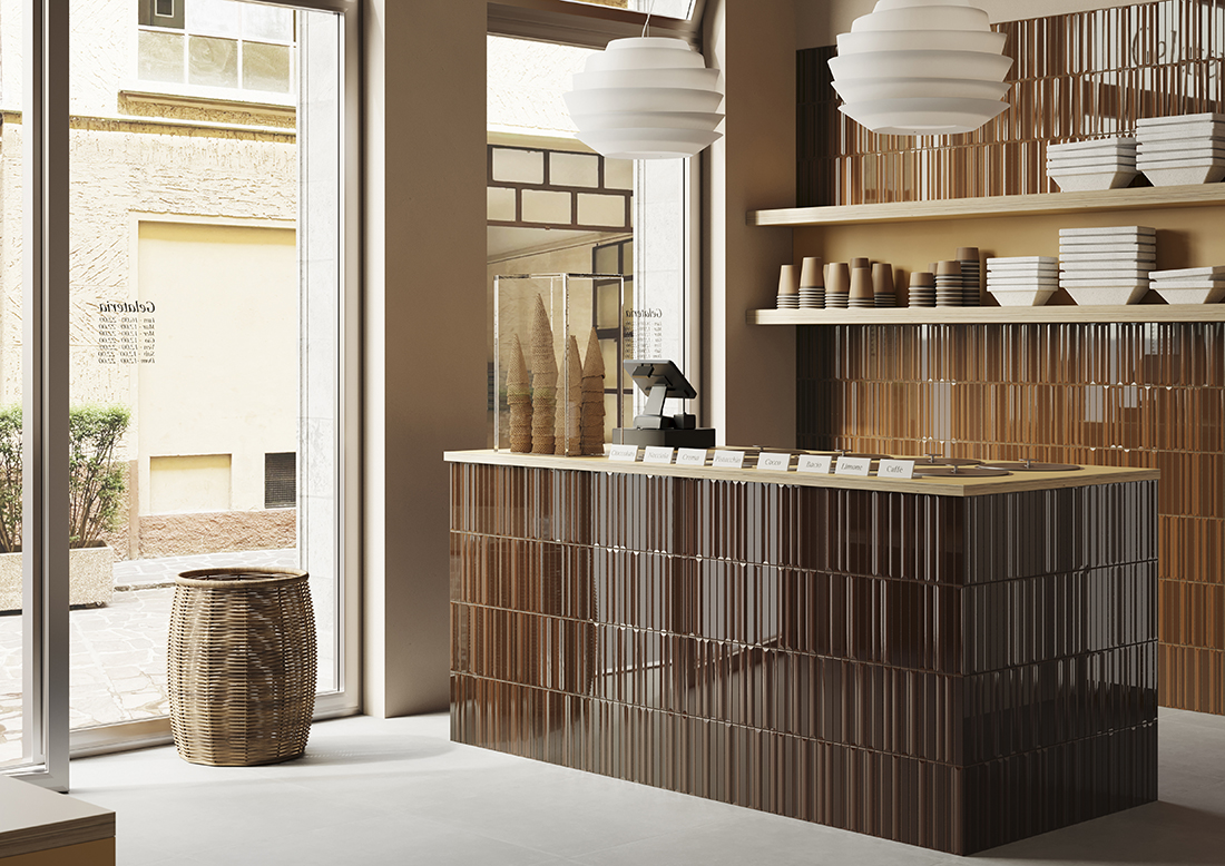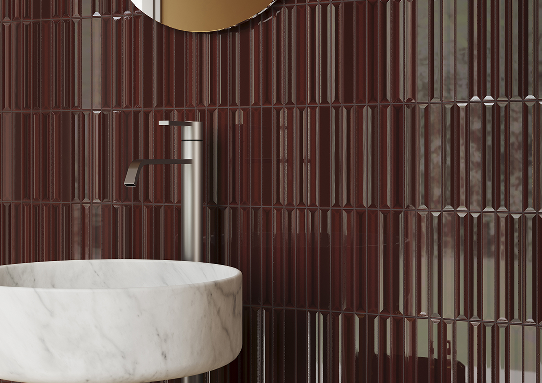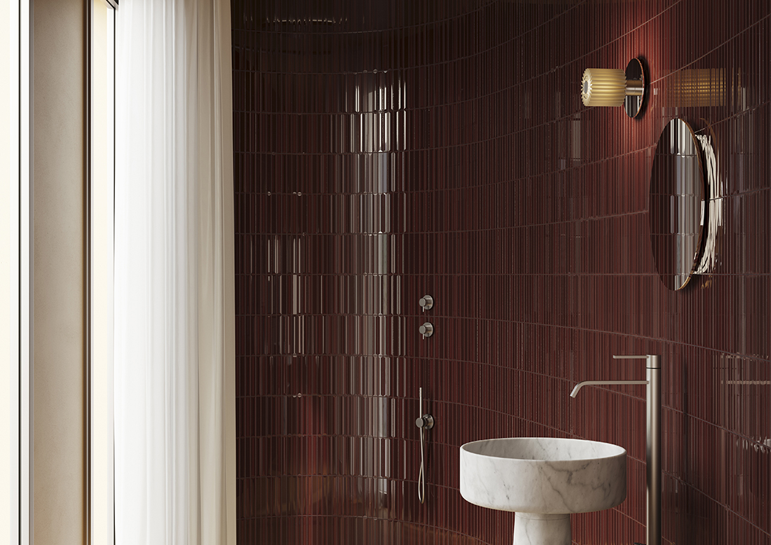 Flautini by Ceramica Vogue is a collection of ceramic tiles defined by a three-dimensional fluted surface that creates a dynamic interplay of light and shadow, transforming walls into expressive architectural elements. The tiles are mounted on mesh sheets, ensuring ease of installation and flexibility in design compositions.