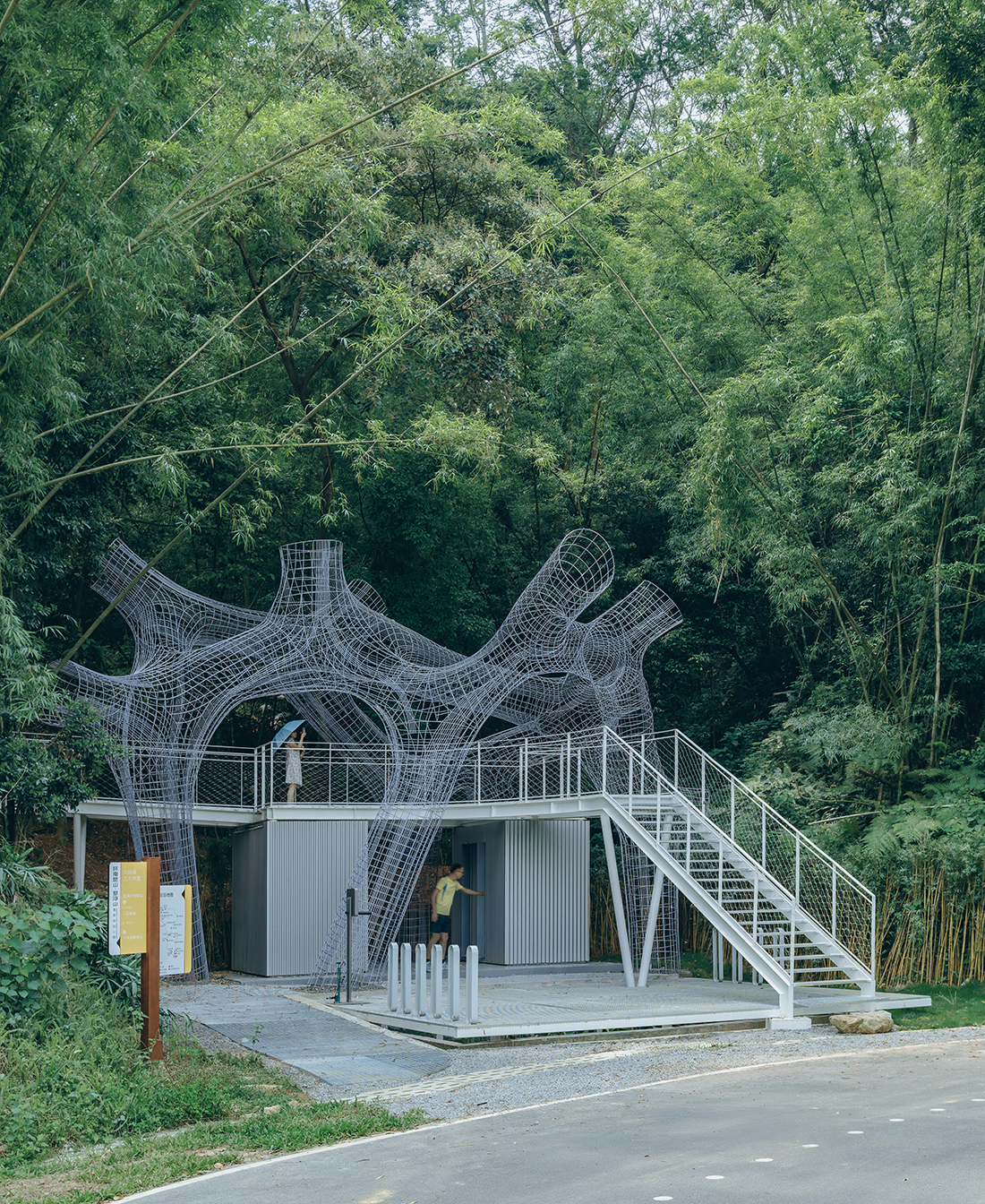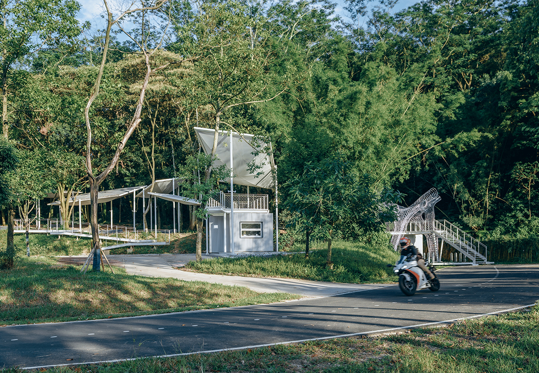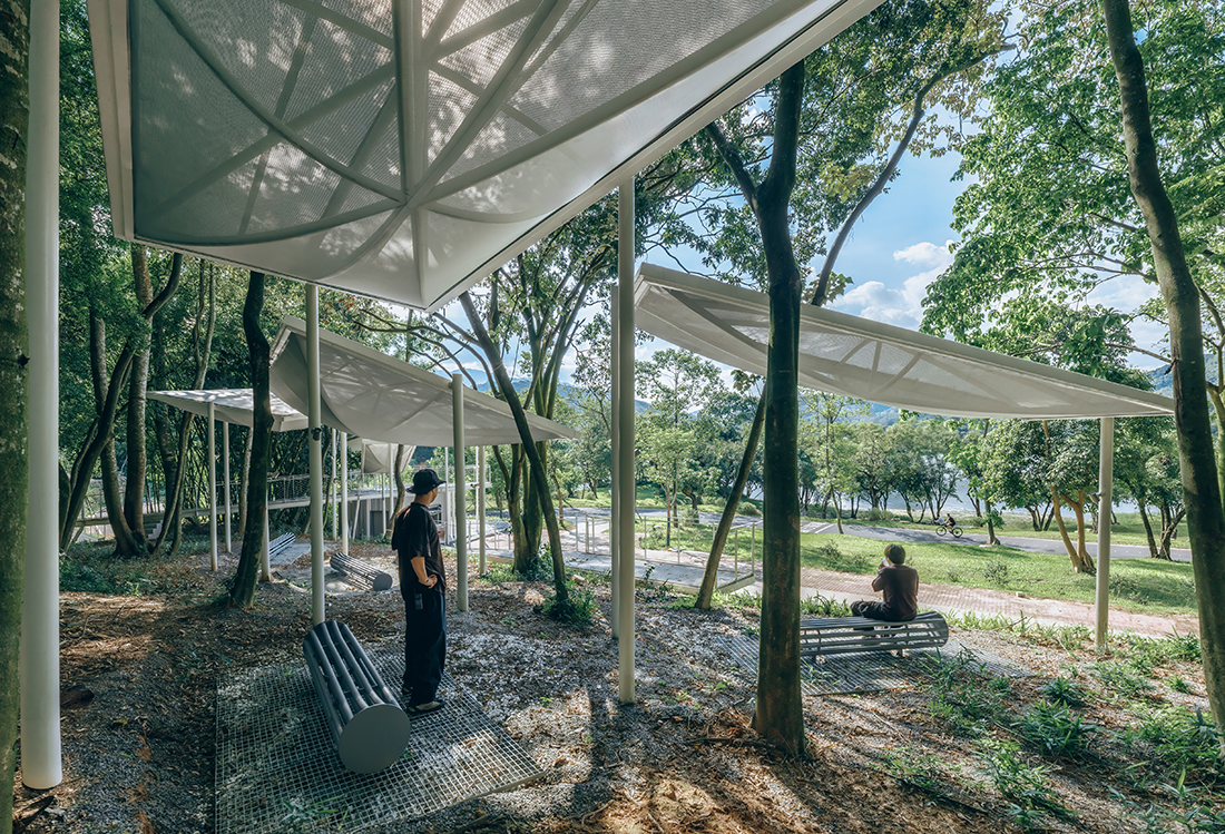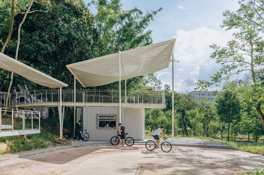 A rest stop for bicyclists with café and floating canopies within native woodlands – blending architecture, art, and ecology. Floating Canopy Grove is an architectural intervention in the forest – an ensemble of small public structures that bring together architecture, art, and nature to create a place of pause and reflection for bicyclists. Tucked within the dense woods beside Guoqian Village, near Xiangang Reservoir at Luofu Mountain in Huizhou, China, the project replaces two outdated public restrooms.