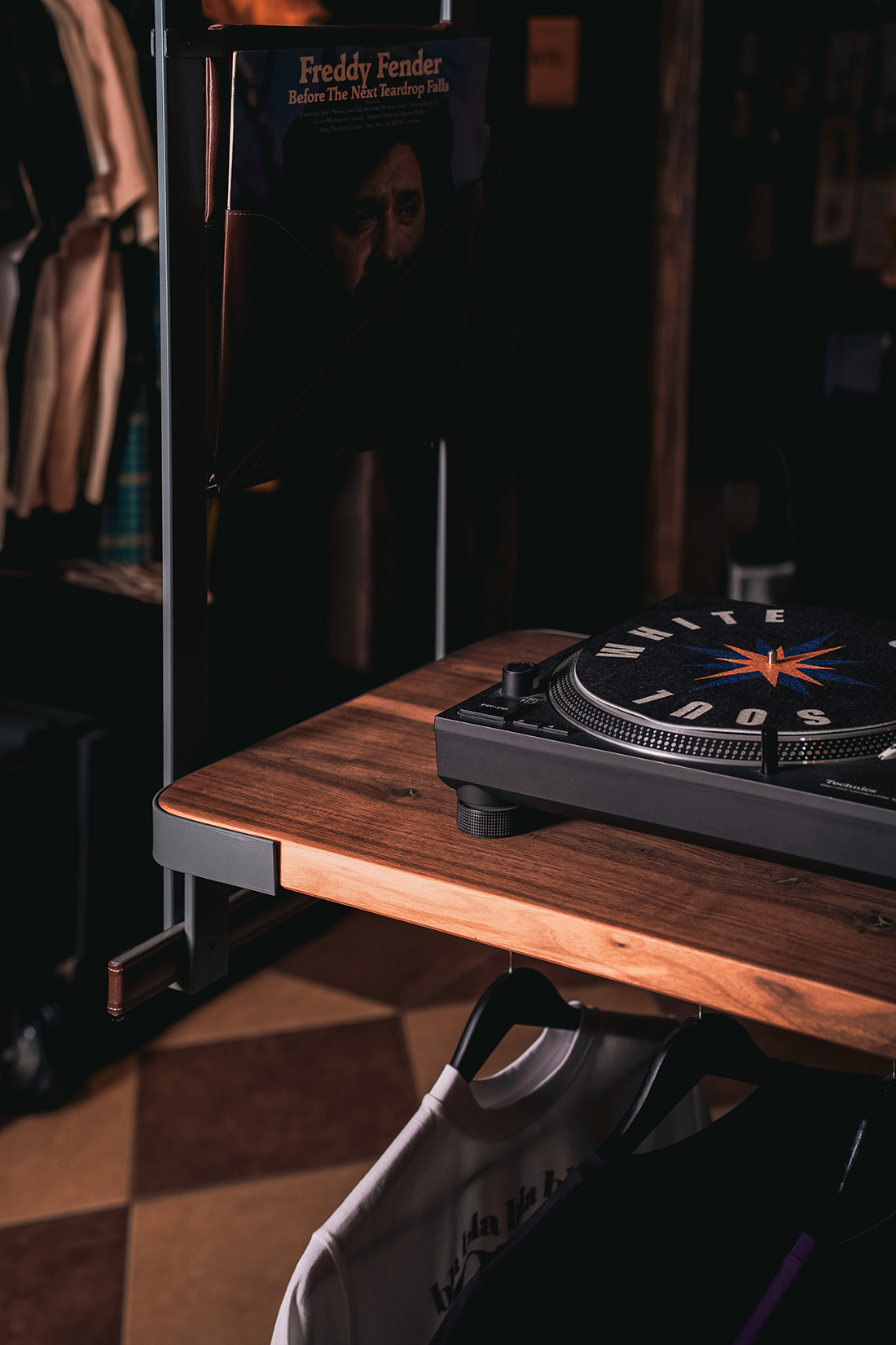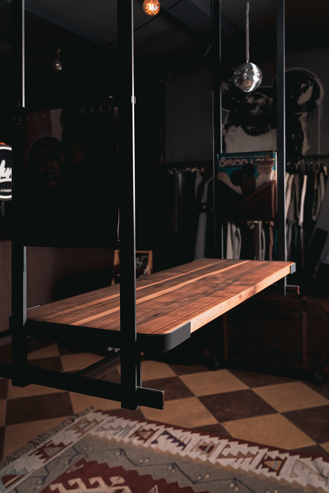 The client requested a DJ booth that would not dominate the space, would appear elegant on camera, and could also function, during the day, as a clothing rack and display counter. The result is a fully demountable structure, designed for long-term use and easy reassembly at potential future locations, and therefore built from durable, long-lasting materials.