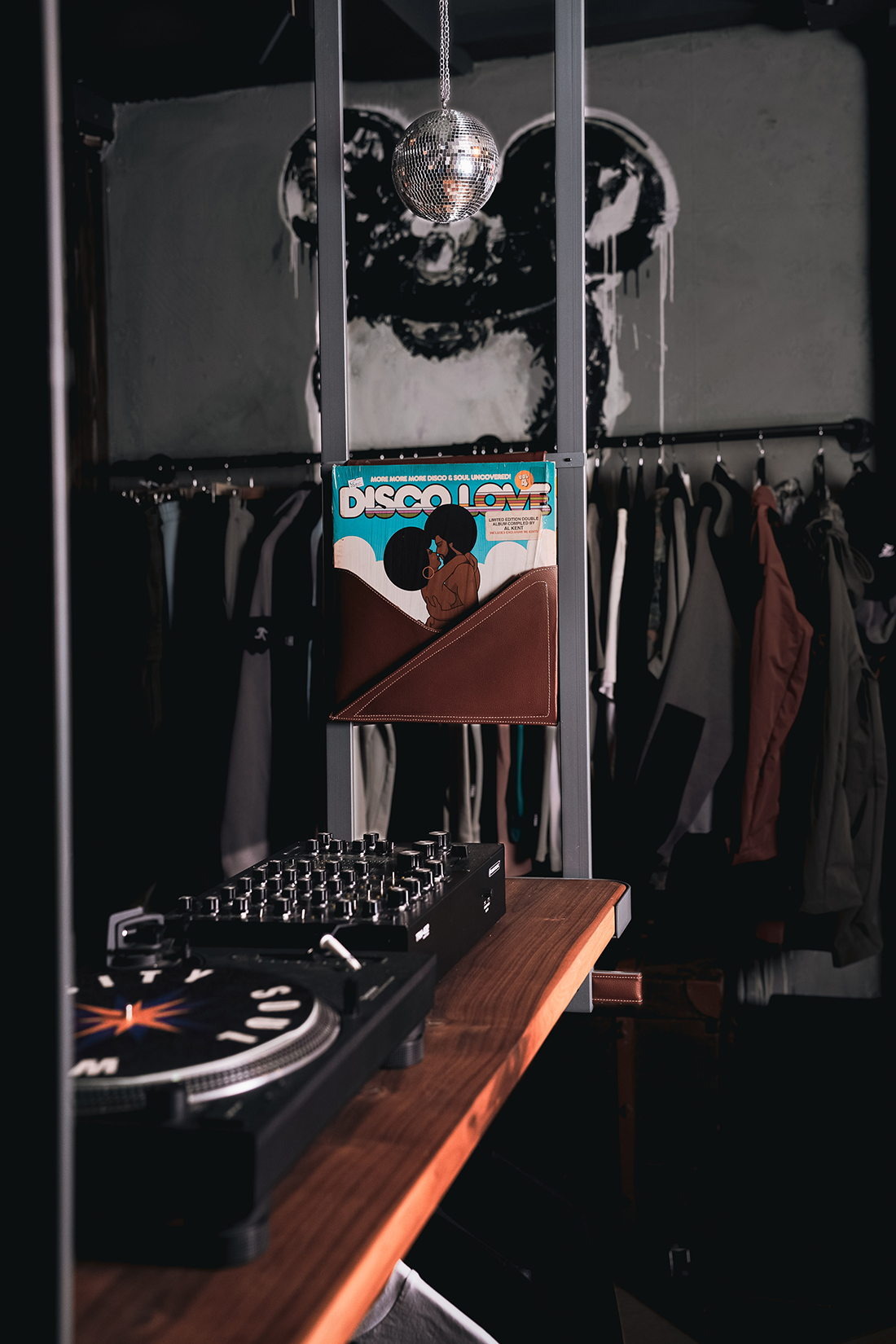 The booth was entirely produced in Podgorica, then transported and assembled in the boutique in Belgrade. Inspired by the form of a leather belt, it merges the tactile nature of the boutique with the functionality and requirements of a DJ setup, highlighting the dual identity of the space through fashion and sound. The horizontal bar connecting the two main sections serves as a clothing rack (stand) and is leather-covered, while the metal side frames are reinforced with a solid wood panel that also functions as the DJ counter. The two pockets for vinyl records are also made of leather, combining practicality with refined detail.