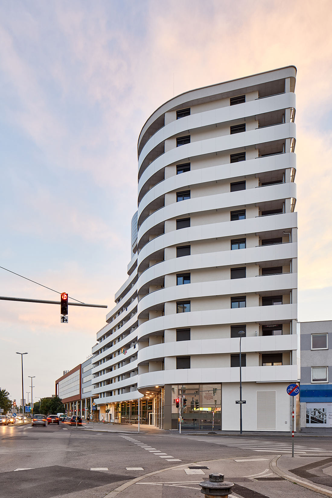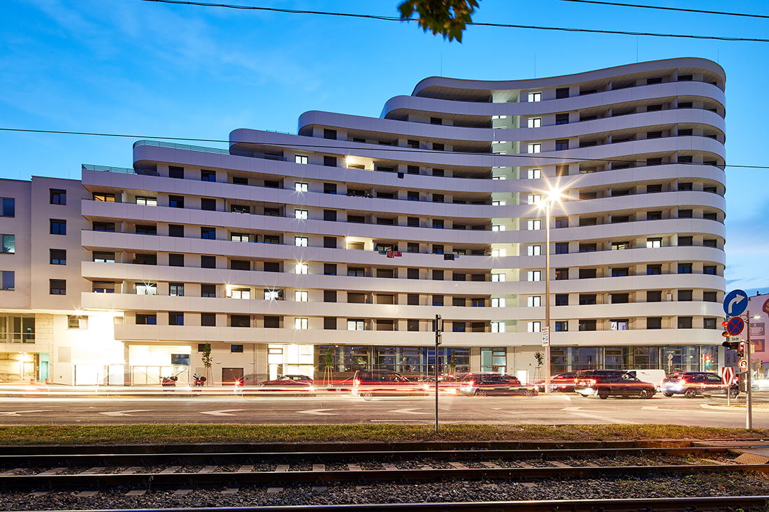 Our design envisions a horizontally articulated building that integrates seamlessly into the surrounding urban fabric with a gentle, elegant gesture. At the block’s corner, five additional floors are stacked in terraces, creating a dynamic silhouette. Together with the opposing residential building, they form a visual dialogue – establishing a gateway to the Floridsdorf district.