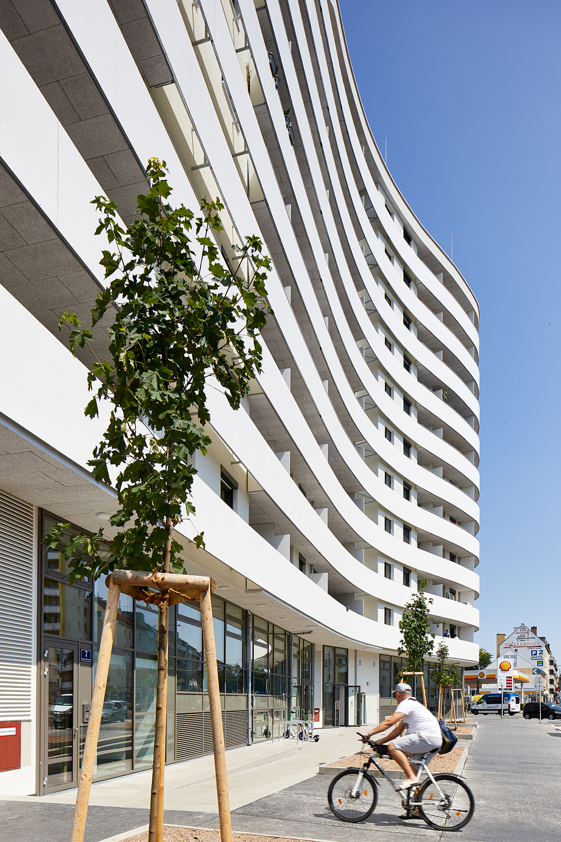 The sculptural form of the building allows for the integration of four trees, enriching the public outdoor space in front and enhancing the quality of the streetscape.