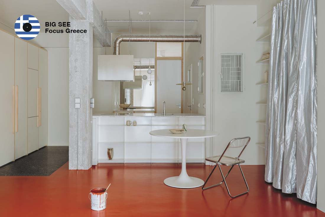 threshold’s Troias Apartment in Kypseli opens fragmented space with light-enhancing partitions and a striking tomato-red floor, creating a modest urban living framework.