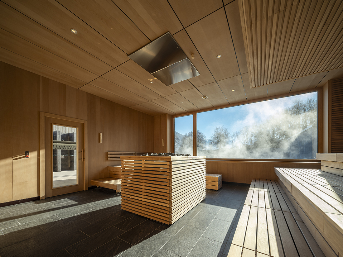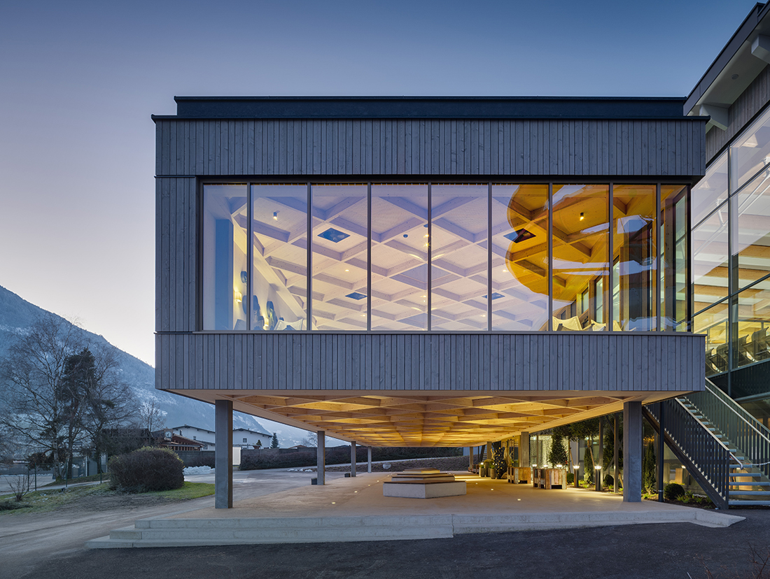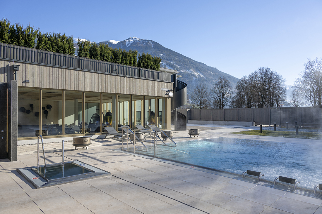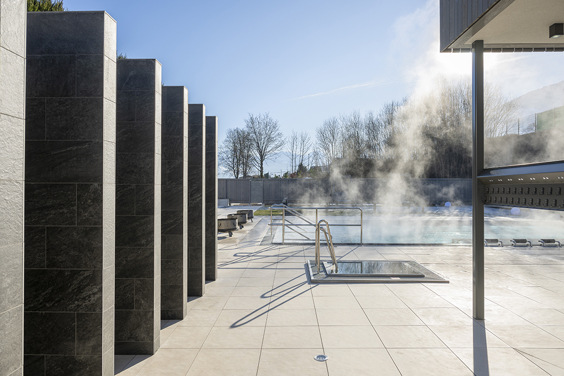 The expansion of the thermal baths should instead appear to be an independent structure, and one appropriately representing the spirit of the times. Furthermore, any new addition would need to remain as simple as possible in order to avoid further overloading of the ensemble. In the context of these reflections, two clear structures are created, to the east and west, their materiality fitting in with the surrounding landscape and allowing the beauty of the surrounding mountains to penetrate the interior to the greatest extent possible. Two green spaces between the buildings give further emphasis to their independence.