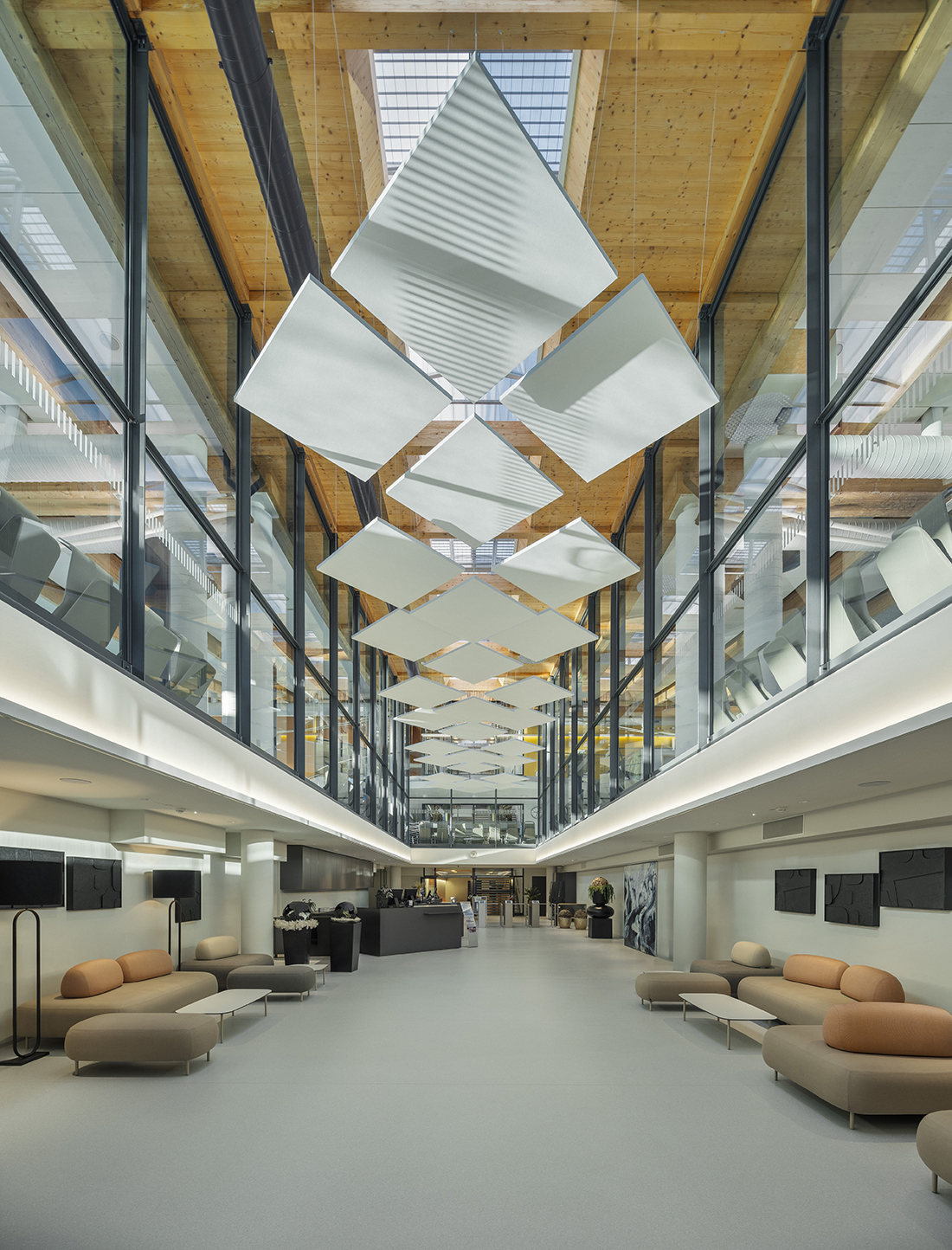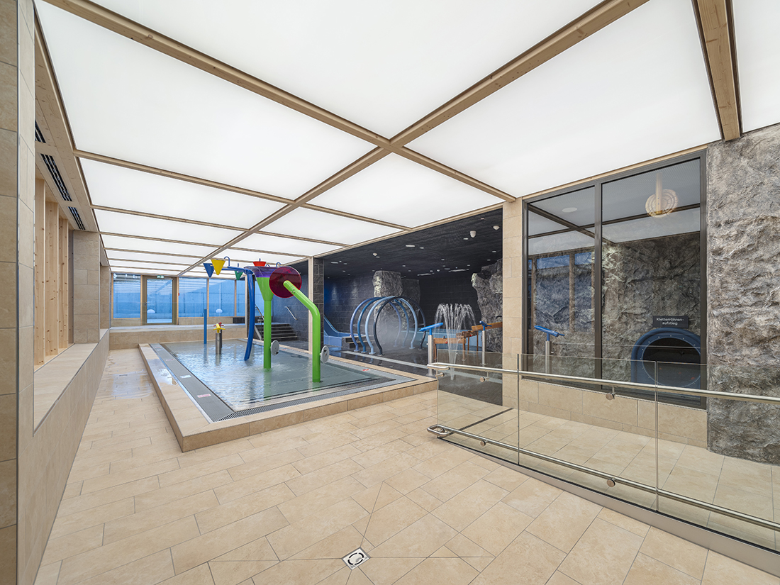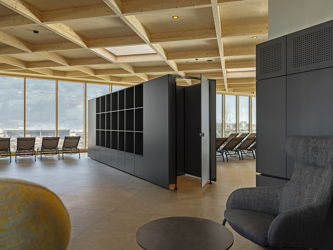 The expansion of the thermal baths should instead appear to be an independent structure, and one appropriately representing the spirit of the times. Furthermore, any new addition would need to remain as simple as possible in order to avoid further overloading of the ensemble. In the context of these reflections, two clear structures are created, to the east and west, their materiality fitting in with the surrounding landscape and allowing the beauty of the surrounding mountains to penetrate the interior to the greatest extent possible. Two green spaces between the buildings give further emphasis to their independence.