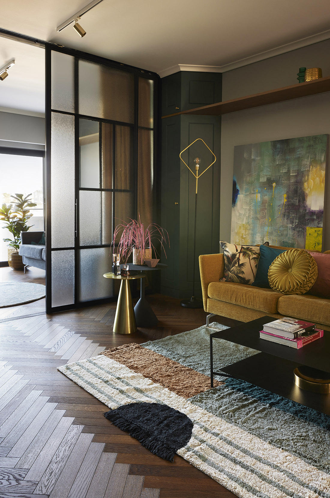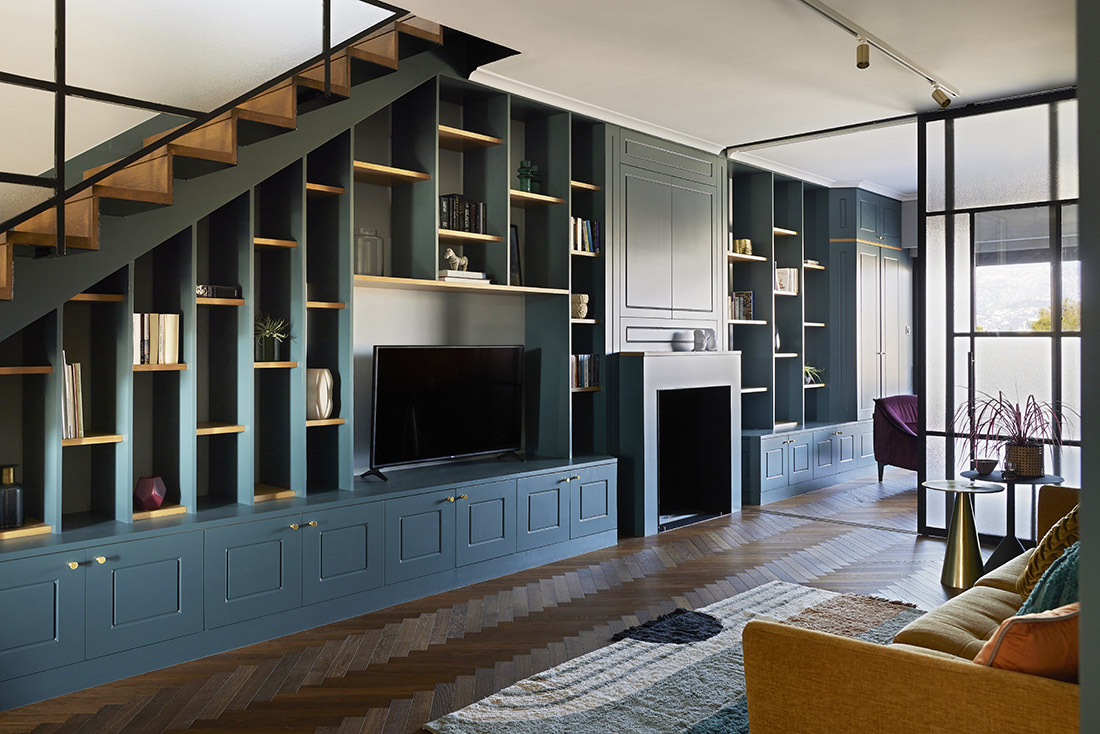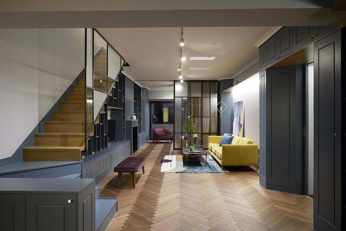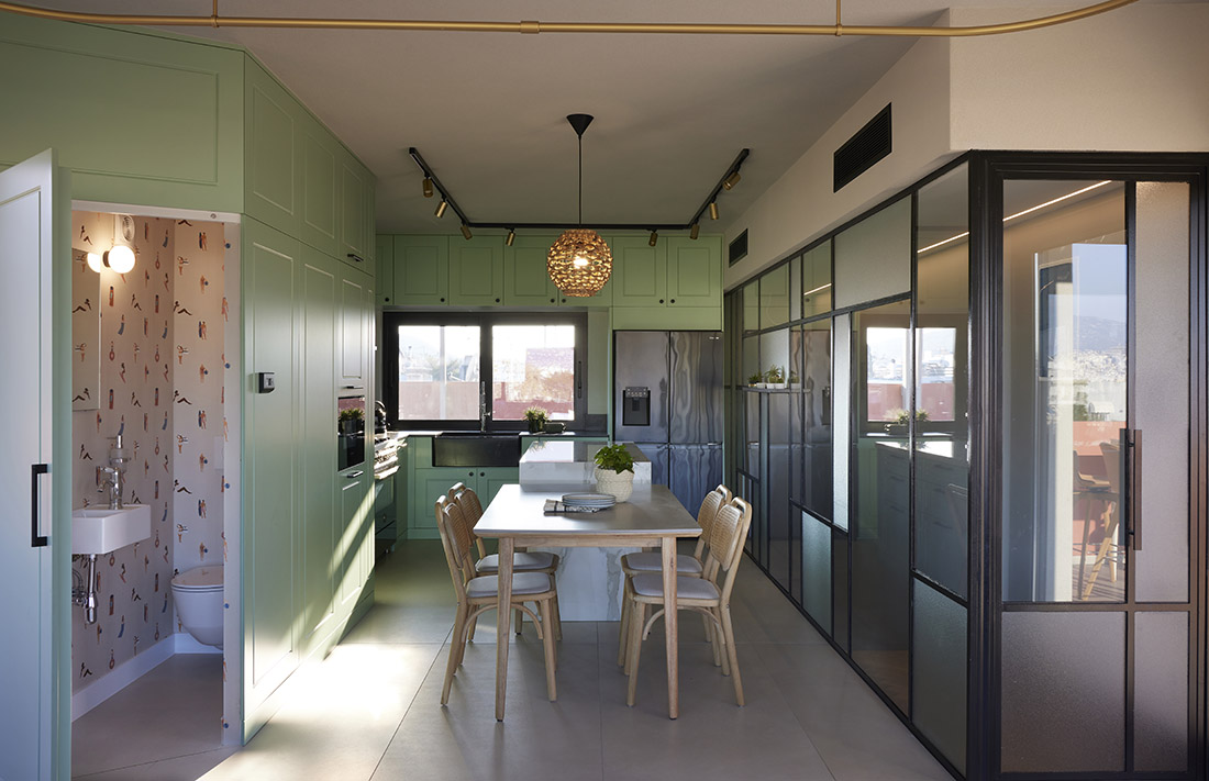 The design concept features two distinct living spaces, the first, adjacent to the bedrooms, is designed with darker tones and a cozier atmosphere, reminiscent of the traditional English apartment. The second living space, located upstairs, is brighter and opens up to a spacious terrace that offers a stunning view of the city, paying tribute to the Greek culture’s emphasis on indoor-outdoor living. One of the most notable features of this renovation is the use of continuous furniture pieces that serve multiple functions, such as a kitchenette, WC, bookcase and staircase, paying homage to the space-saving designs of traditional London apartments. By incorporating all different uses into one piece, we were able to create a sense of unity and flow throughout the space while maximizing functionality. In order to create a feeling of warmth and familiarity, we used natural colors, shades of green which symbolize growth, harmony, and balance, and specific furnishings that would speak to both cultures. Glass vitro partitions and sliding doors were strategically placed to provide privacy when needed, but also allow light to travel freely throughout the space.