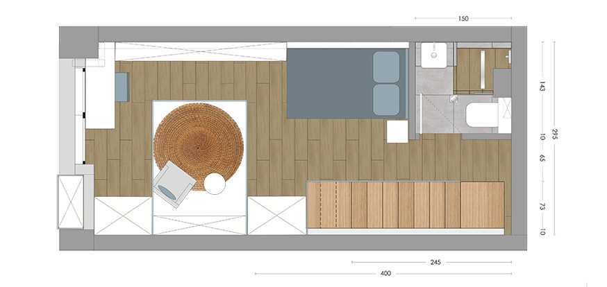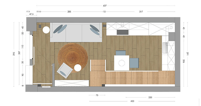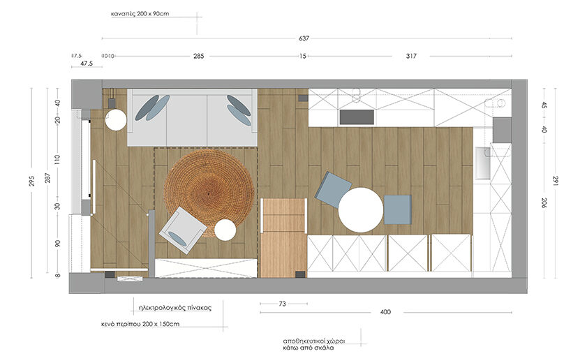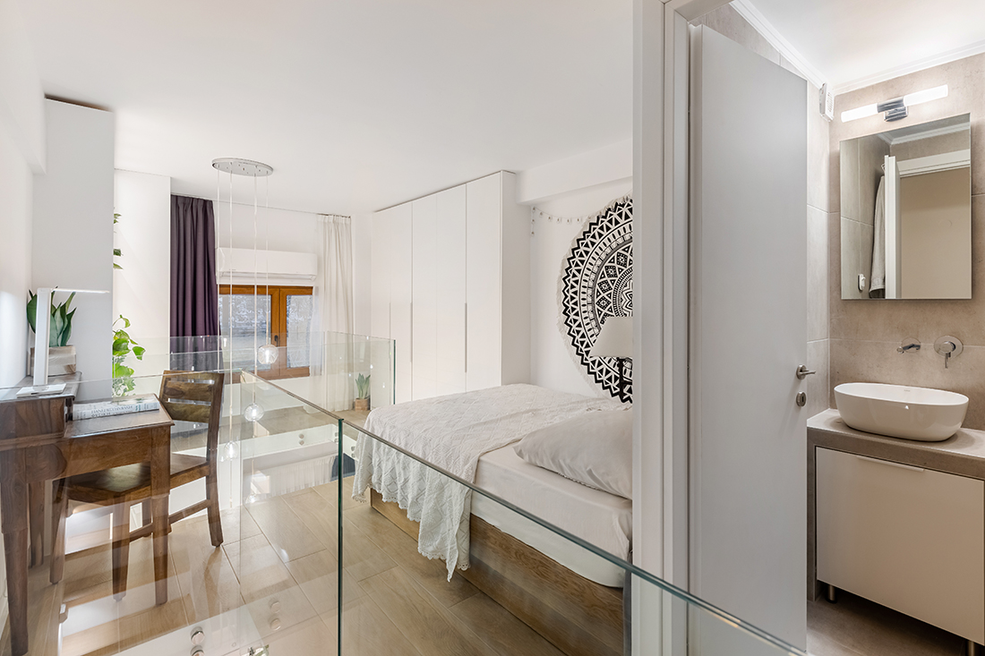 In the heart of Thessaloniki, Greece, we transformed a 25 sq. m. garage into a modern 32 sq. m. micro-residence, significantly enhancing the usable living area. The original garage, which had direct access to the pavement and street, was reimagined as a compact yet functional living space spanning two levels.