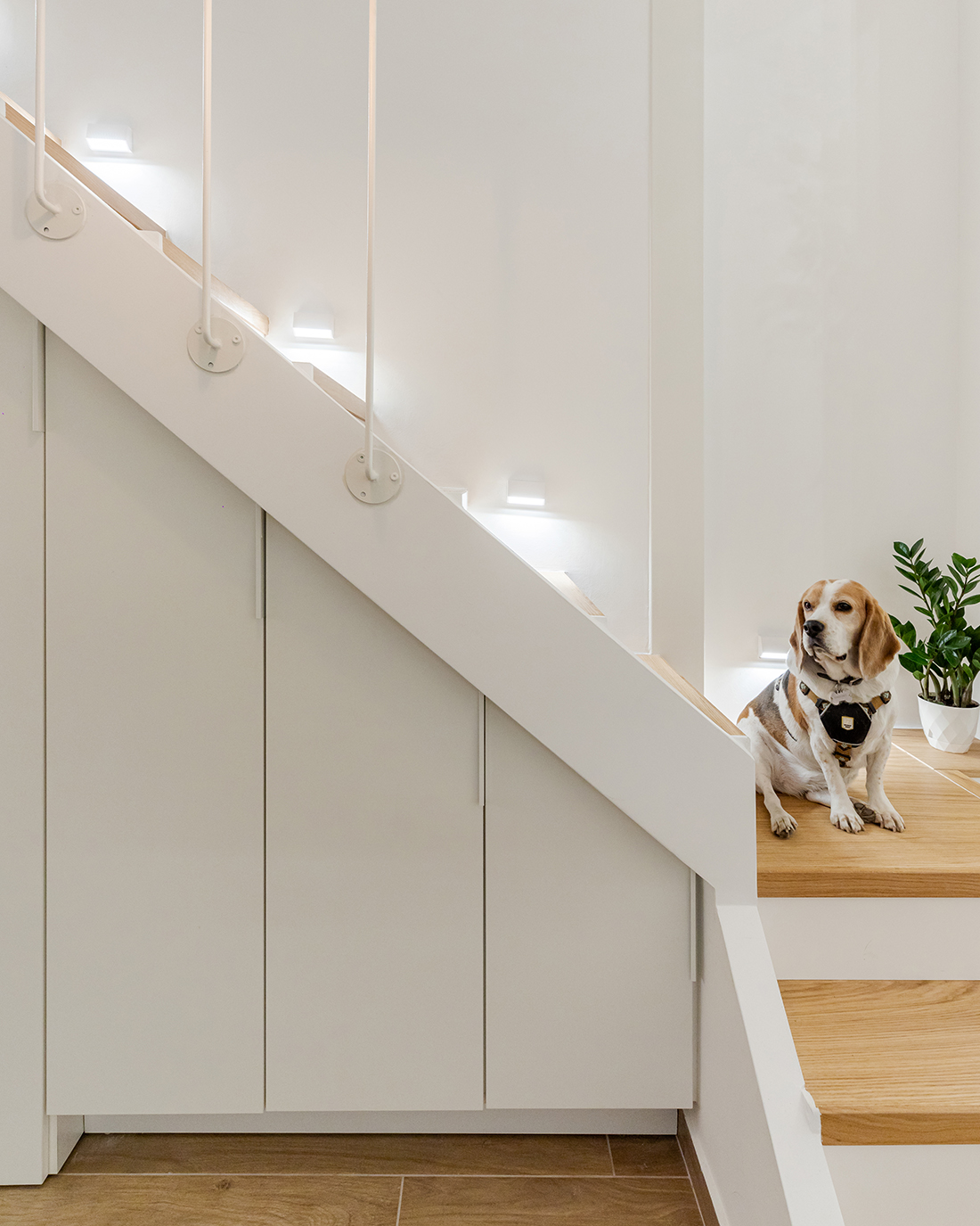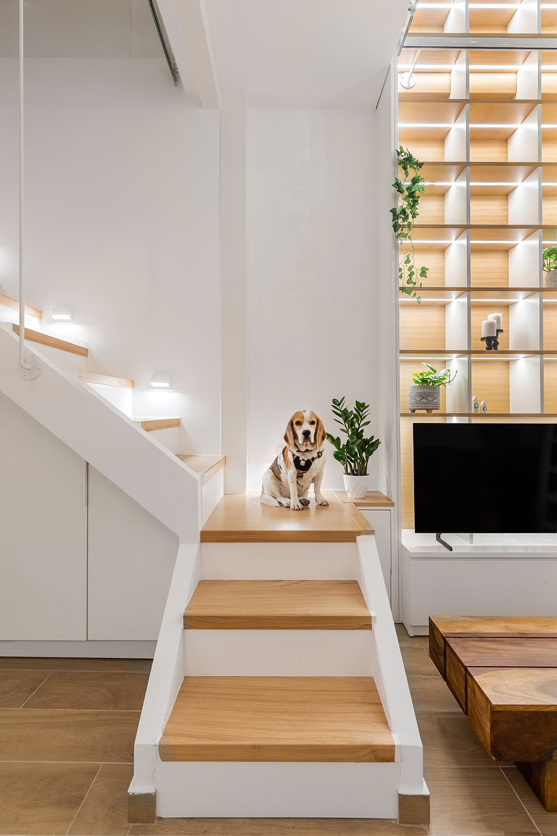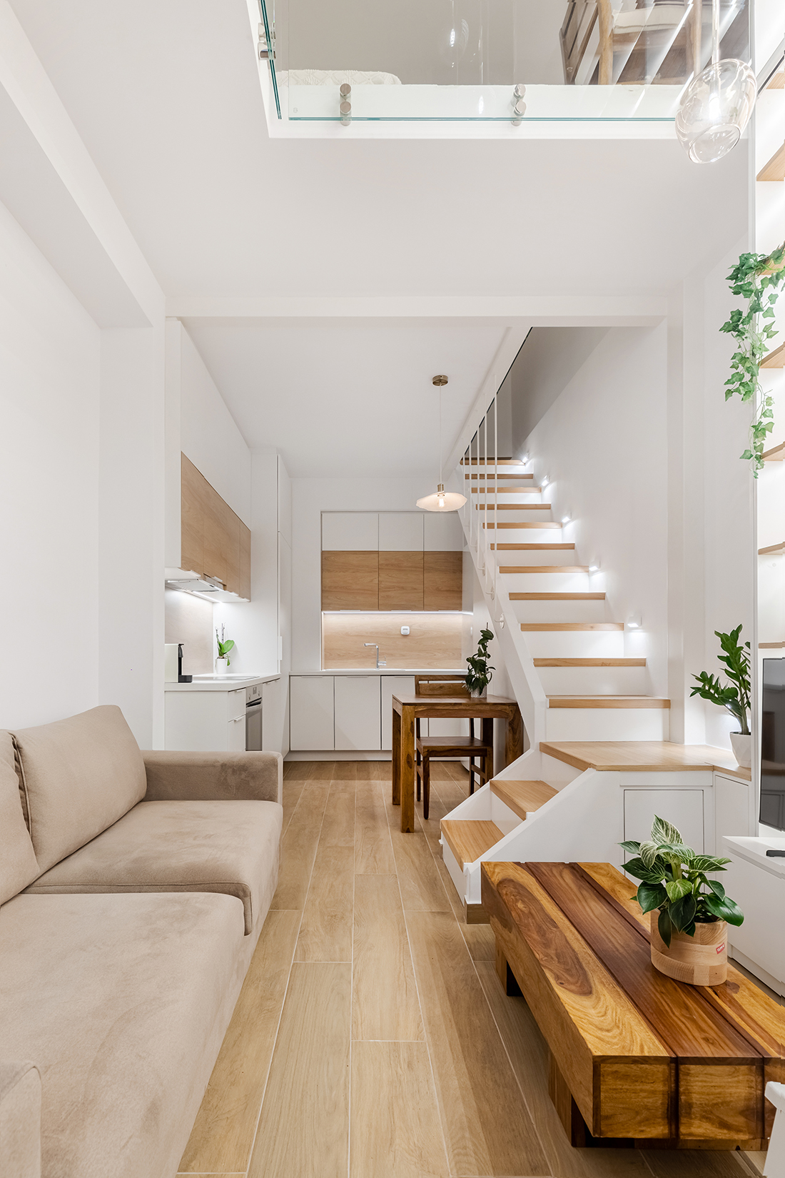 An entrance hall now leads to the micro-residence, where an internal balcony and a dramatic, custom-made floor-to-ceiling bookcase serve as focal points and connect the two levels. On the ground floor, the living room and kitchen are seamlessly integrated, while a staircase with built-in storage leads to the upper level, which houses the bedroom, home office, and bathroom.