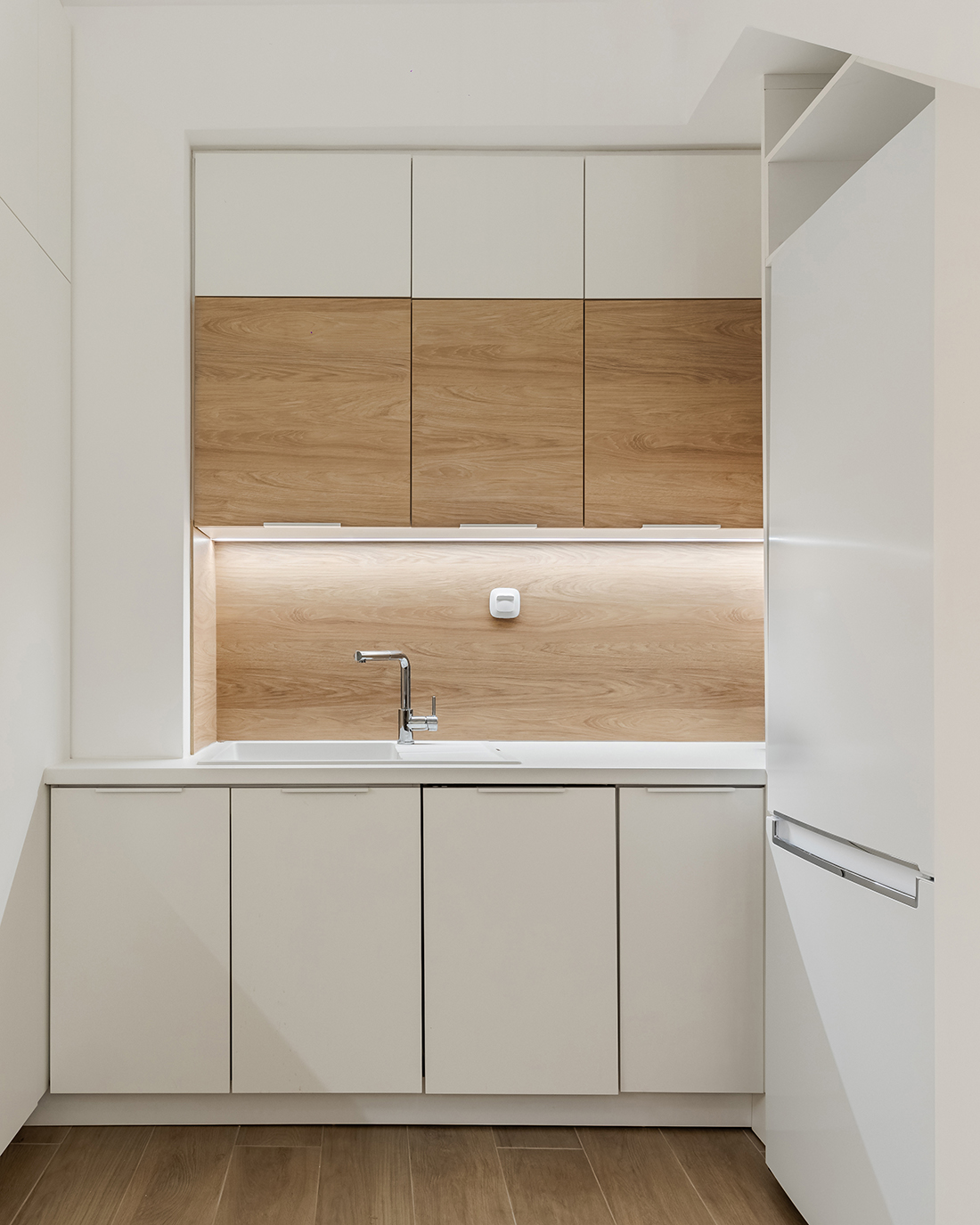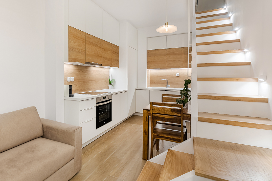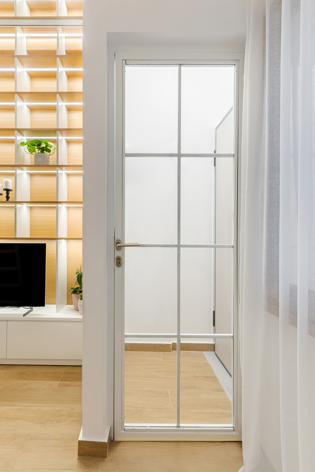 An entrance hall now leads to the micro-residence, where an internal balcony and a dramatic, custom-made floor-to-ceiling bookcase serve as focal points and connect the two levels. On the ground floor, the living room and kitchen are seamlessly integrated, while a staircase with built-in storage leads to the upper level, which houses the bedroom, home office, and bathroom.