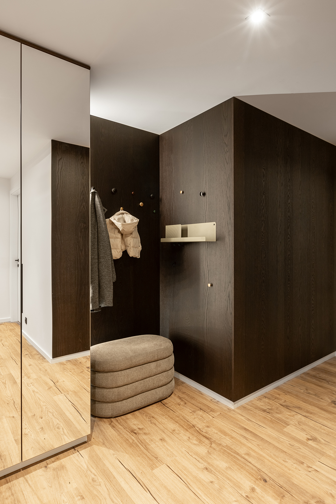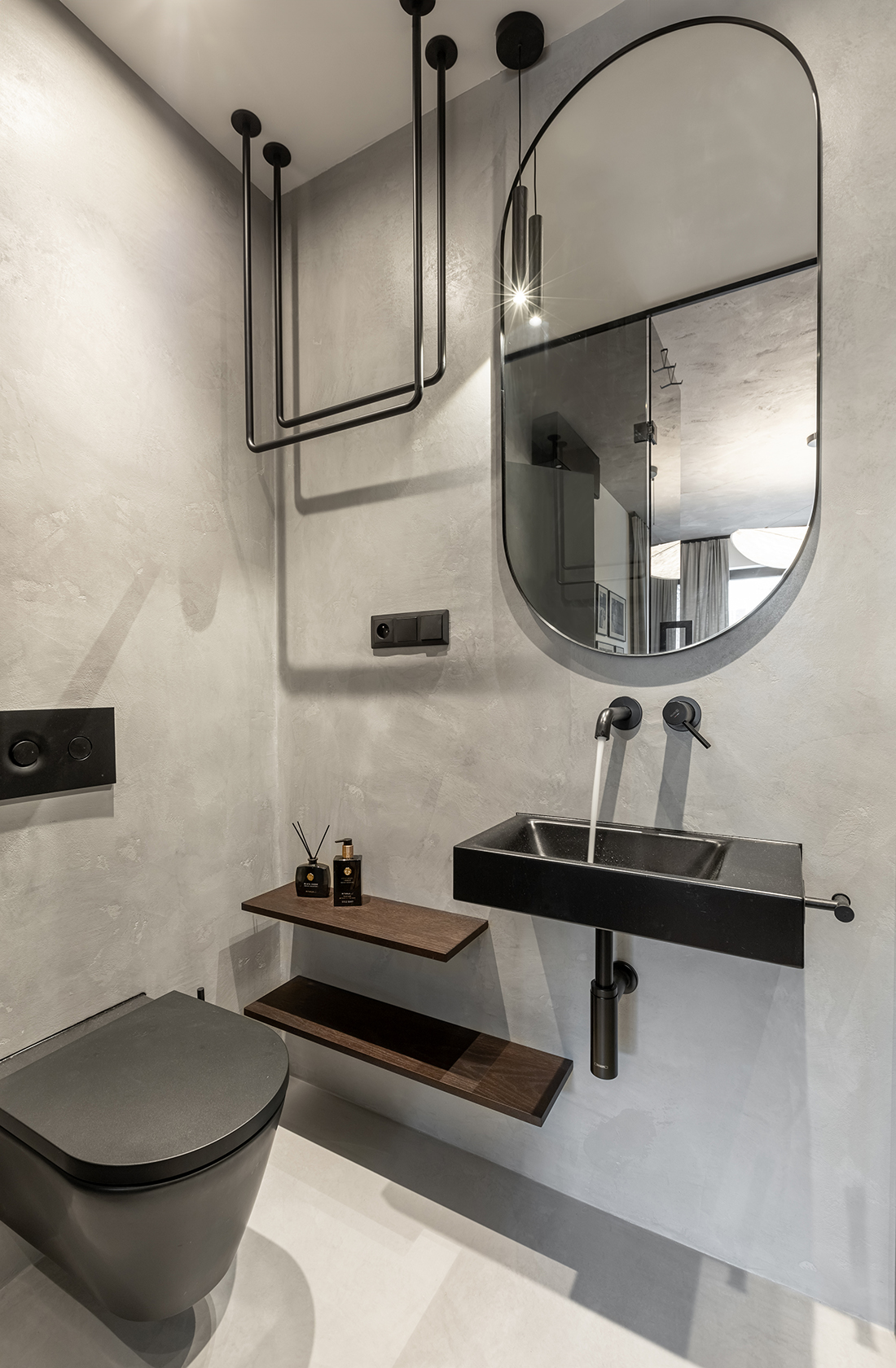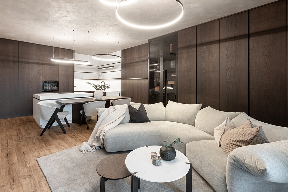 The apartment in Prague was shaped already during construction through subtle client changes, refining the original layout to enhance comfort and privacy. By merging a separate toilet and storage, an en-suite bathroom accessible directly from the bedroom was created, establishing a more intimate living scenario. The design builds on the raw character of the shell. Exposed concrete ceilings define the spatial identity, complemented by a restrained palette of gray tones and warm wood surfaces that introduce balance and tactility. The open living area is anchored by a custom kitchen with an island and a generous, modular sofa. Strict geometry is softened by a composition of circular light fixtures, adding a dynamic layer to the space. A spacious terrace overlooking the Vltava extends the interior into the nature.