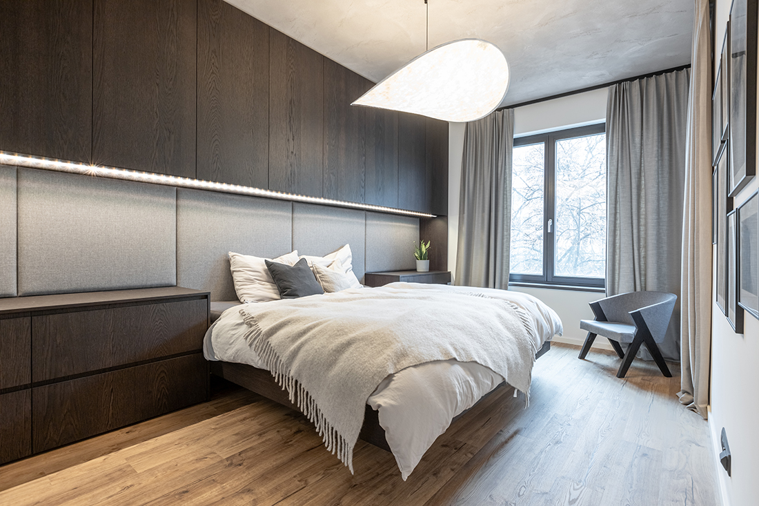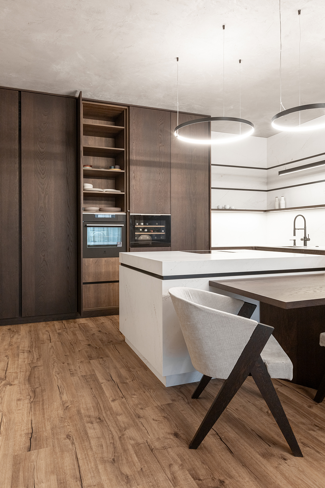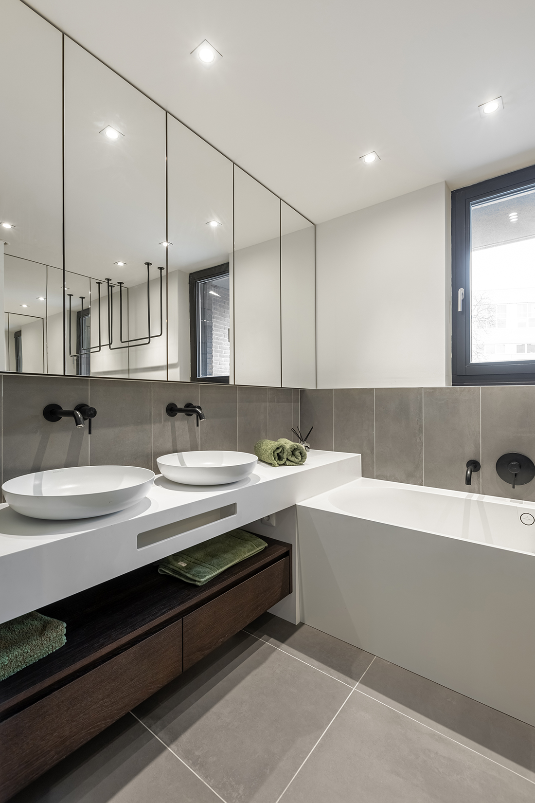 The apartment in Prague was shaped already during construction through subtle client changes, refining the original layout to enhance comfort and privacy. By merging a separate toilet and storage, an en-suite bathroom accessible directly from the bedroom was created, establishing a more intimate living scenario. The design builds on the raw character of the shell. Exposed concrete ceilings define the spatial identity, complemented by a restrained palette of gray tones and warm wood surfaces that introduce balance and tactility. The open living area is anchored by a custom kitchen with an island and a generous, modular sofa. Strict geometry is softened by a composition of circular light fixtures, adding a dynamic layer to the space. A spacious terrace overlooking the Vltava extends the interior into the nature.