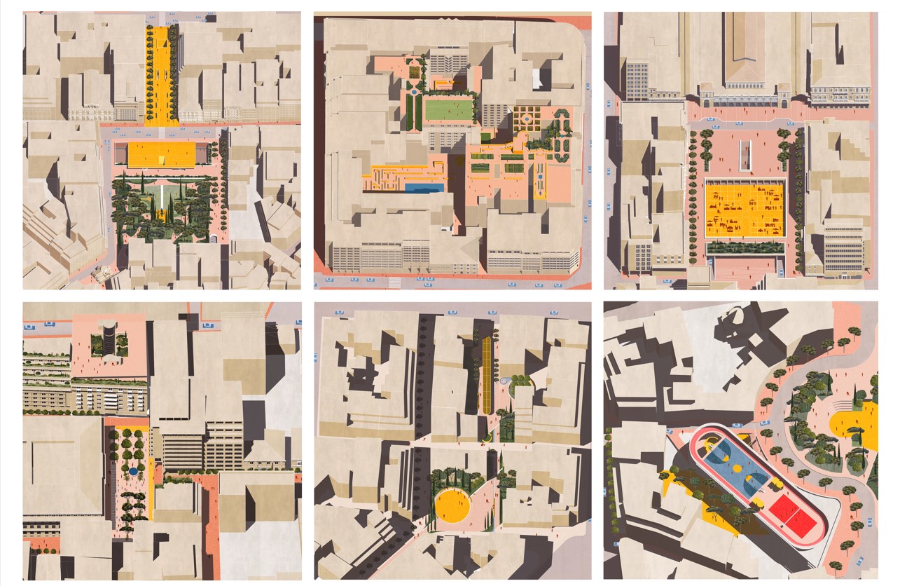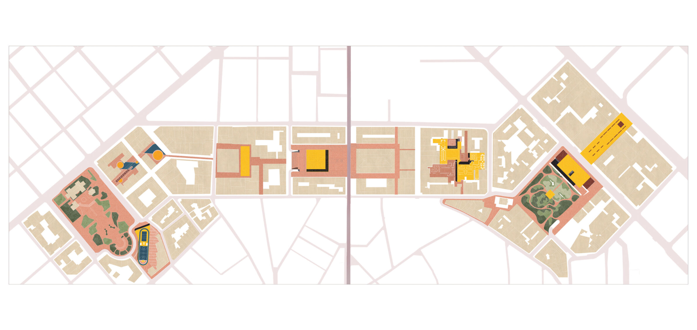 Athens' 1833 plan imposed neoclassical order on its medieval fabric. A monumental axis running east to west, accommodating civic and private uses, gradually dissolved into a linear urban zone. A pivotal zone that links four urban mosaics, a sequence of urban voids-points concealing a lost linear path. Yet, the city itself has rejected the classical notion of the axis. A new approach is needed—one that redefines this path, not as a rigid line, but as a series of dynamic points - fields one encounters along the journey. A free garden of curved nerves, a labyrinth in the negative urban space, a Forum as a geometric centre, a Phalanstery reviving housing in the city core, and two ex-parking spaces redefined as public zones—each forms an autonomous element within a broader linear entity that connects them.